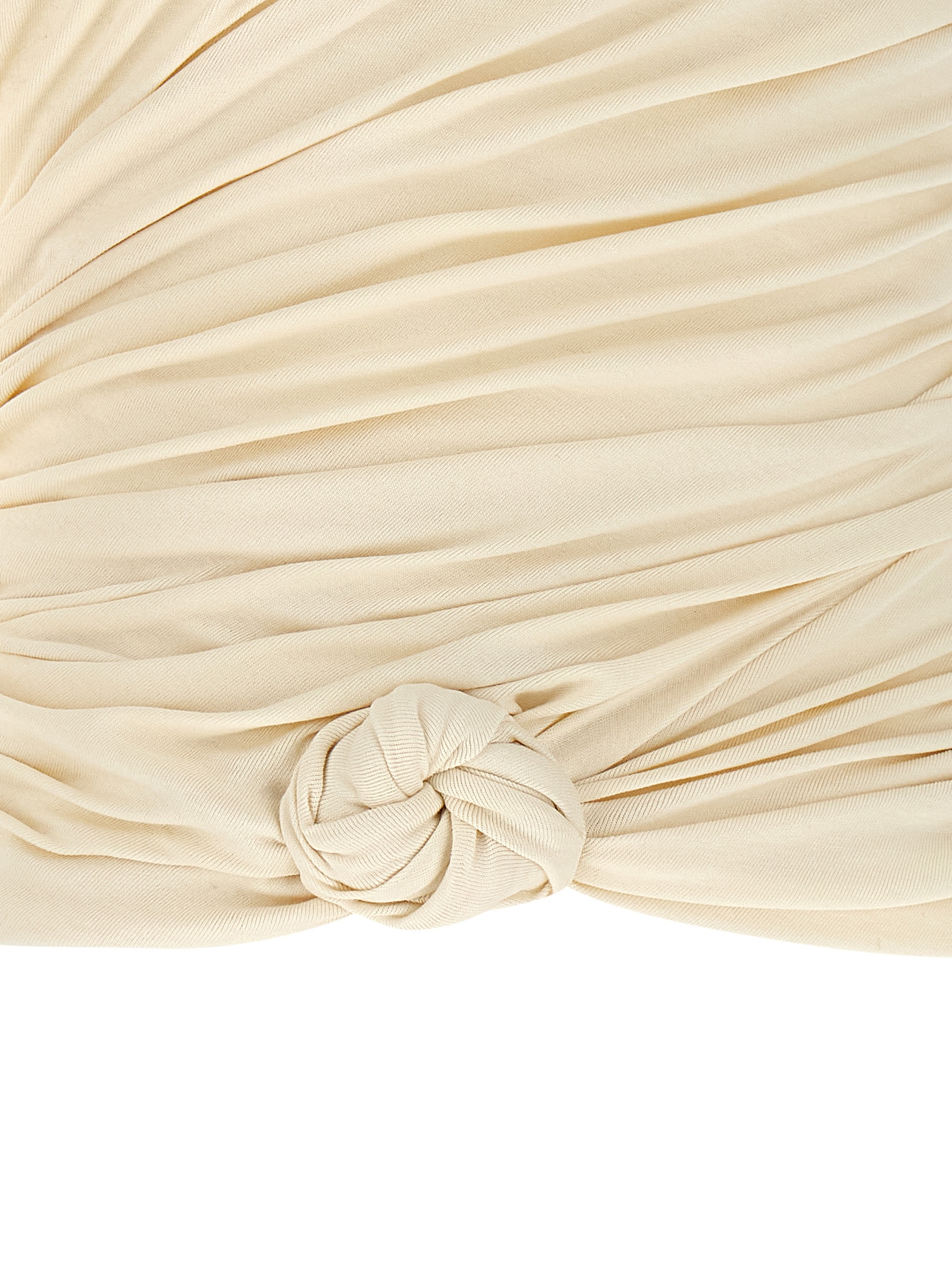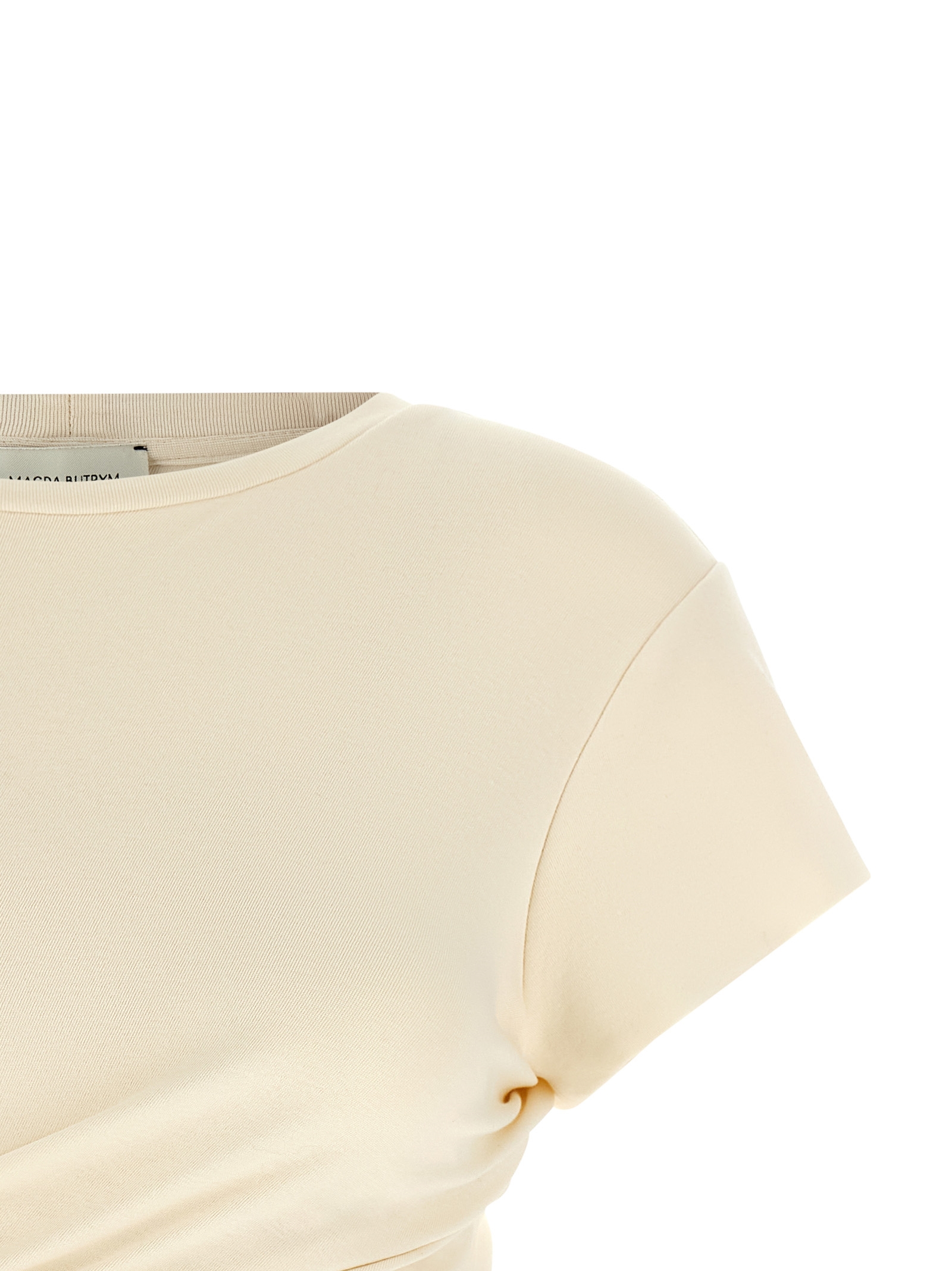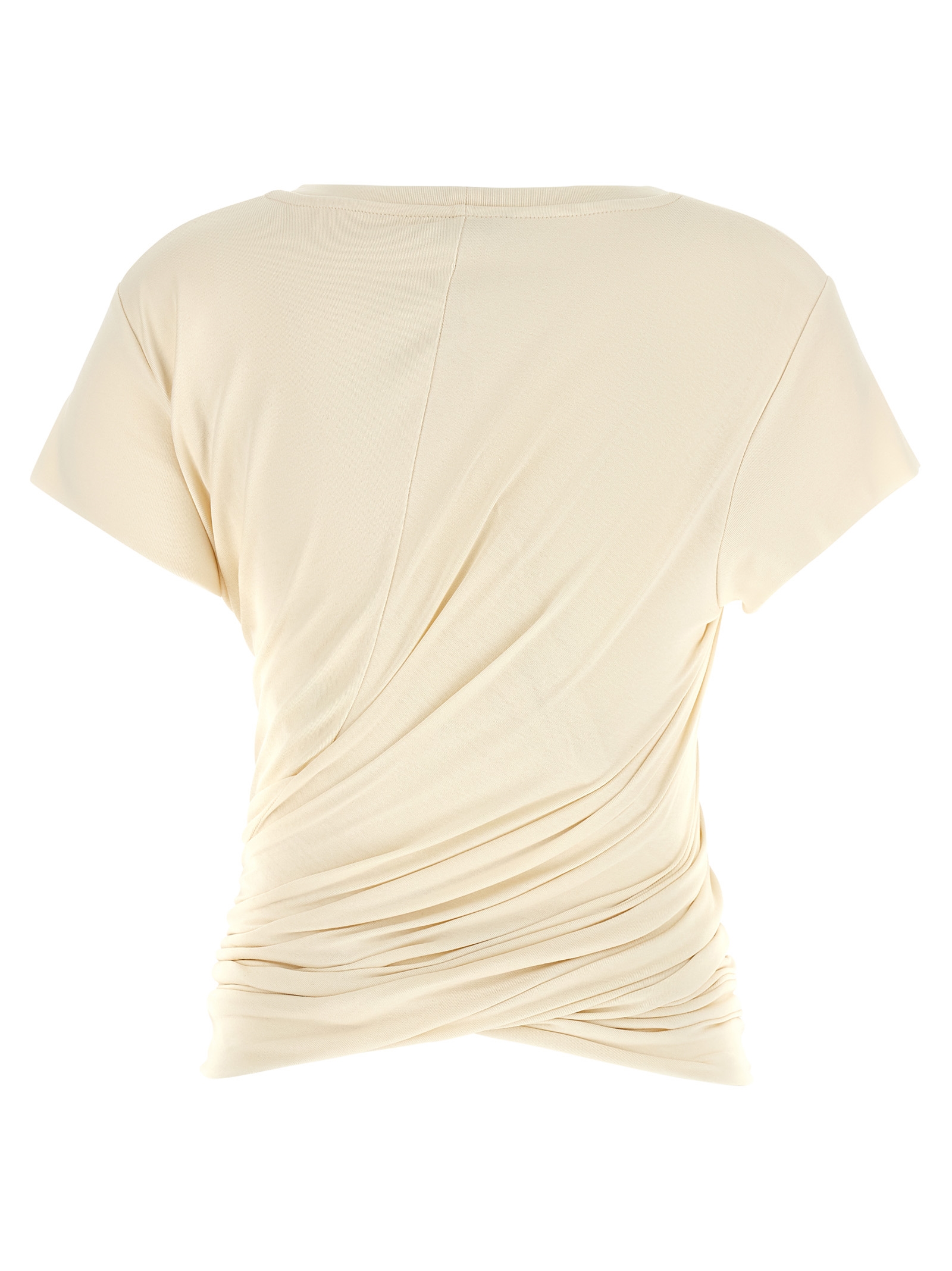 ’01’ double-layered jersey t-shirt, sculptural draping created by the intertwined side panels with ornamental knot on the right side, crew neck, short sleeves, asymmetrical hem.