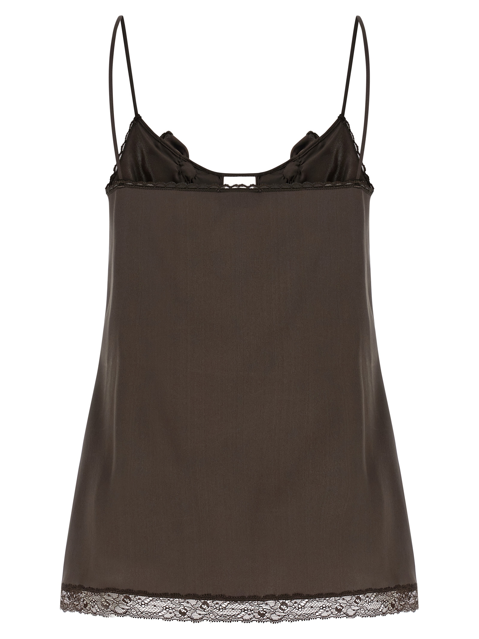 01′ silk top with lace inserts, thin straps, wide round neckline with ruffles, ruffles and front cut-out detail.