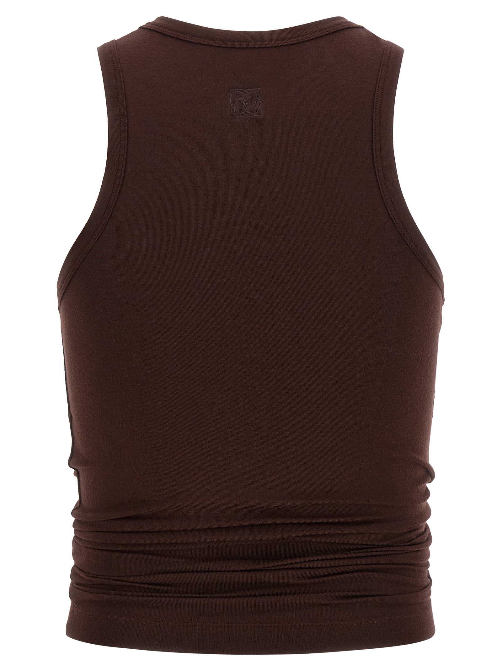 ’05’ stretch cotton top, sculptural draping created by the intertwined side panels with front ornamental knot, crew neck, asymmetrical hem.