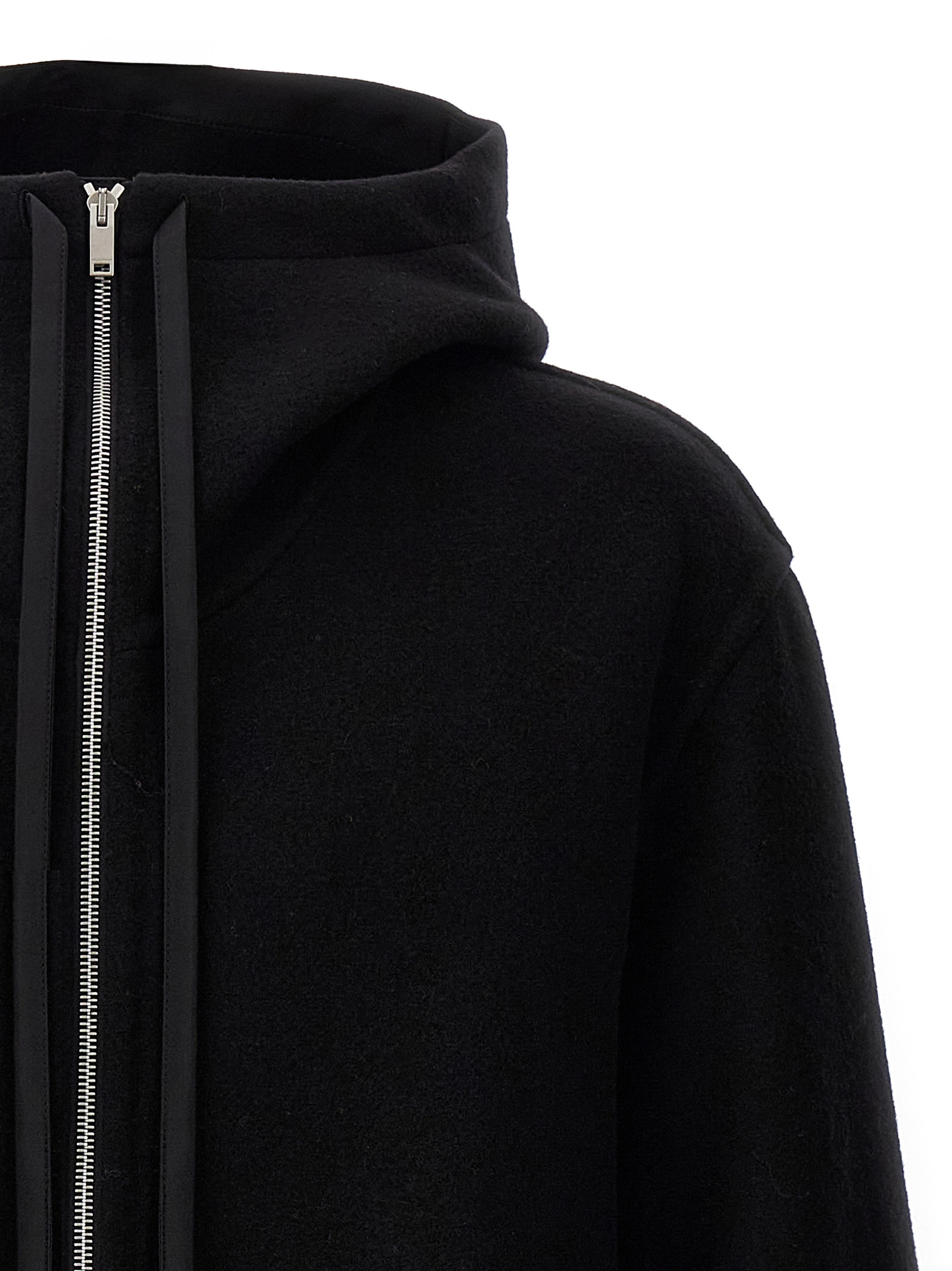 Virgin wool 08 blouson with hood, high neck, front zip closure, pockets, long sleeves with cuffs and dropped shoulders, drawstring at the hem, half lining.