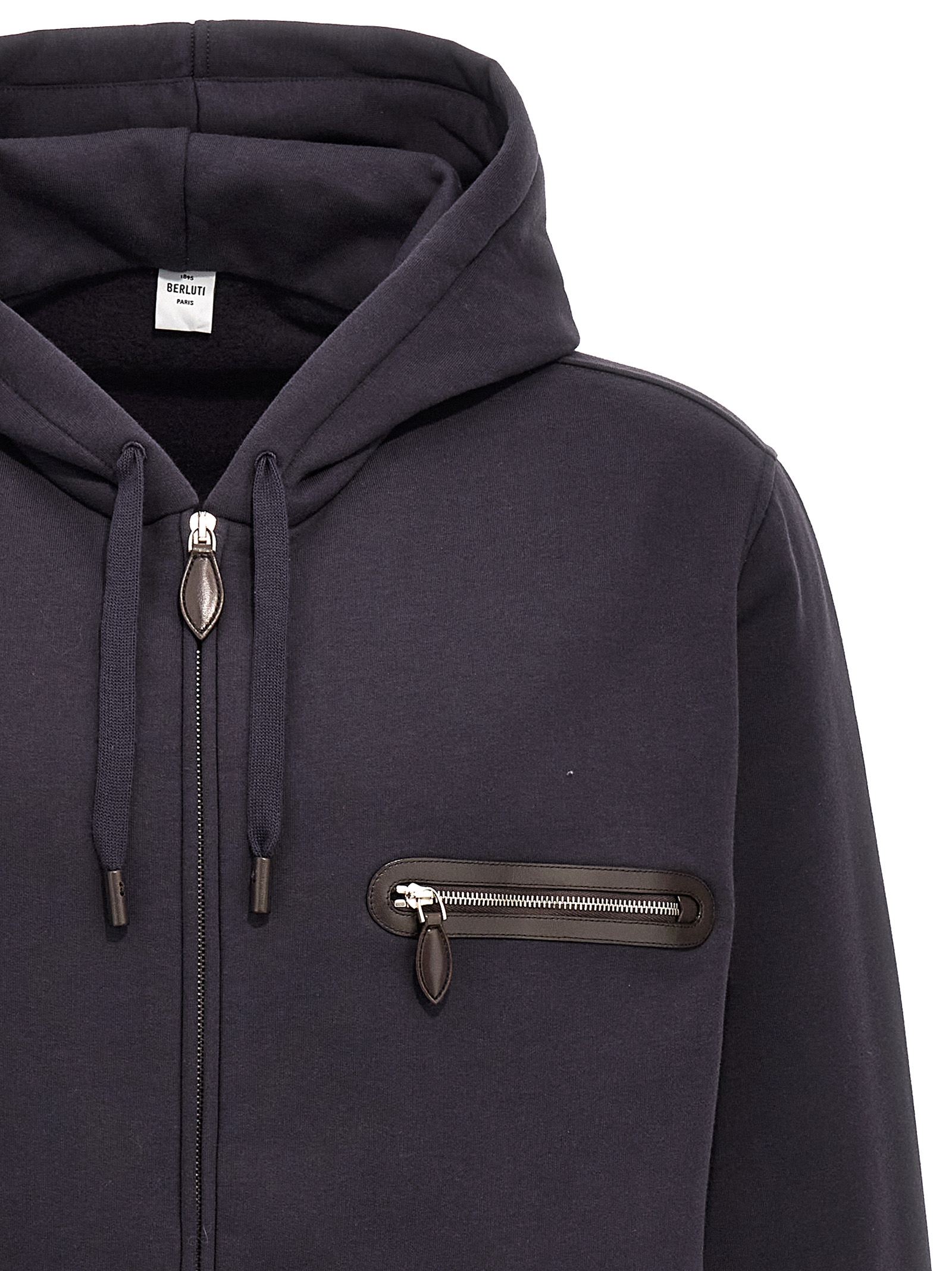 ‘1 Jour Zipped’ cotton hoodie with zip closure, pockets, long cuffed sleeves, leather detail.