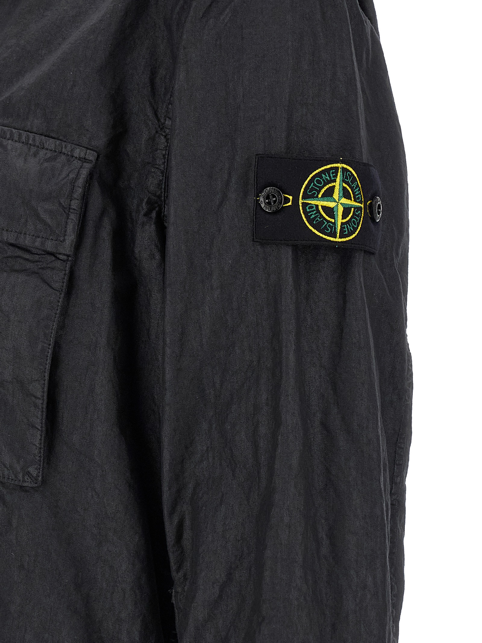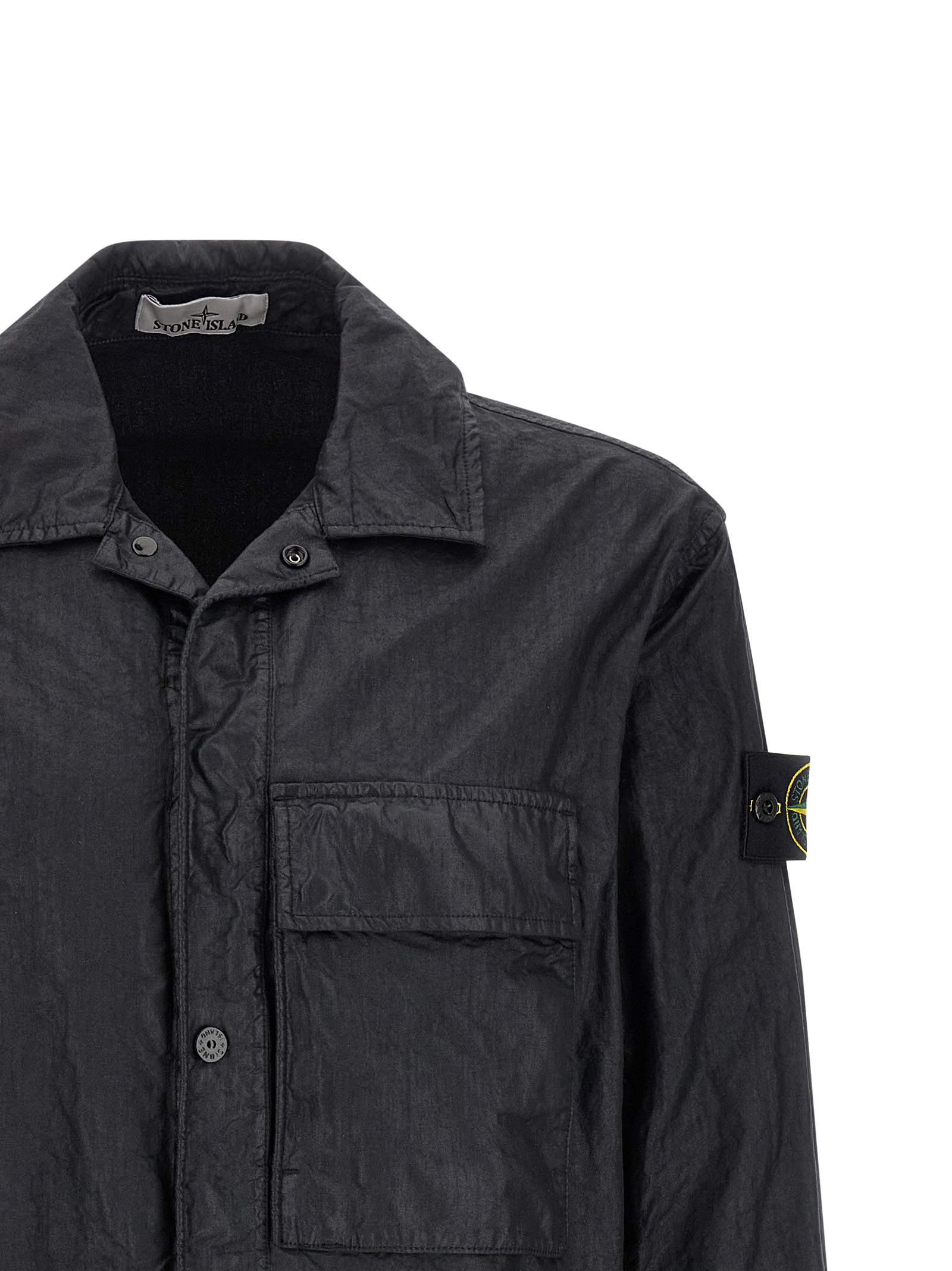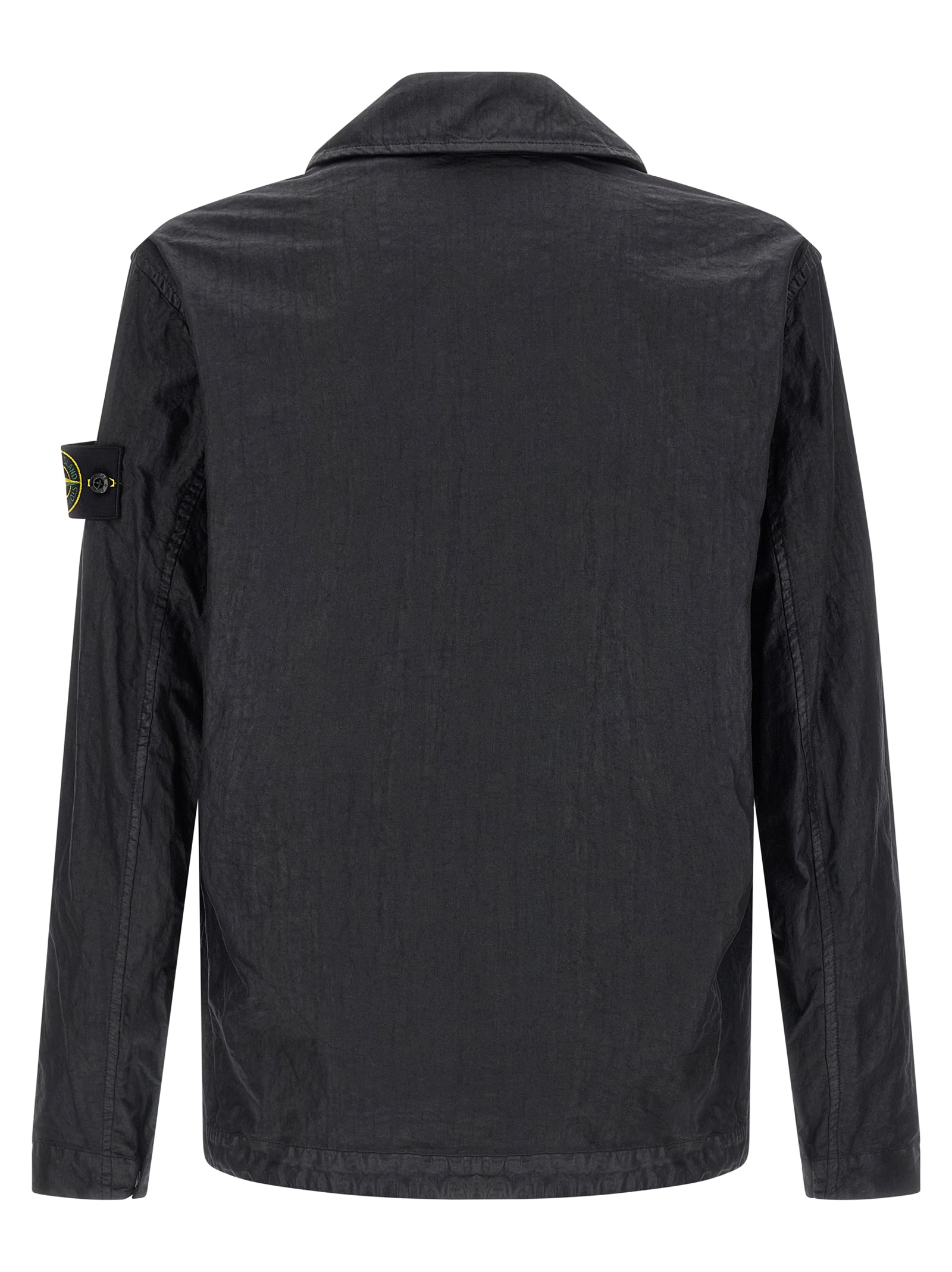 Panama woven calendered fabric 1200003 overshirt, an innovative 100% nylon Made in Japan fabric with a sensational natural look, garment-dyed marbled look, front snap button closure, breast pocket, long sleeves with dropped shoulder, cuffs and logo badge.