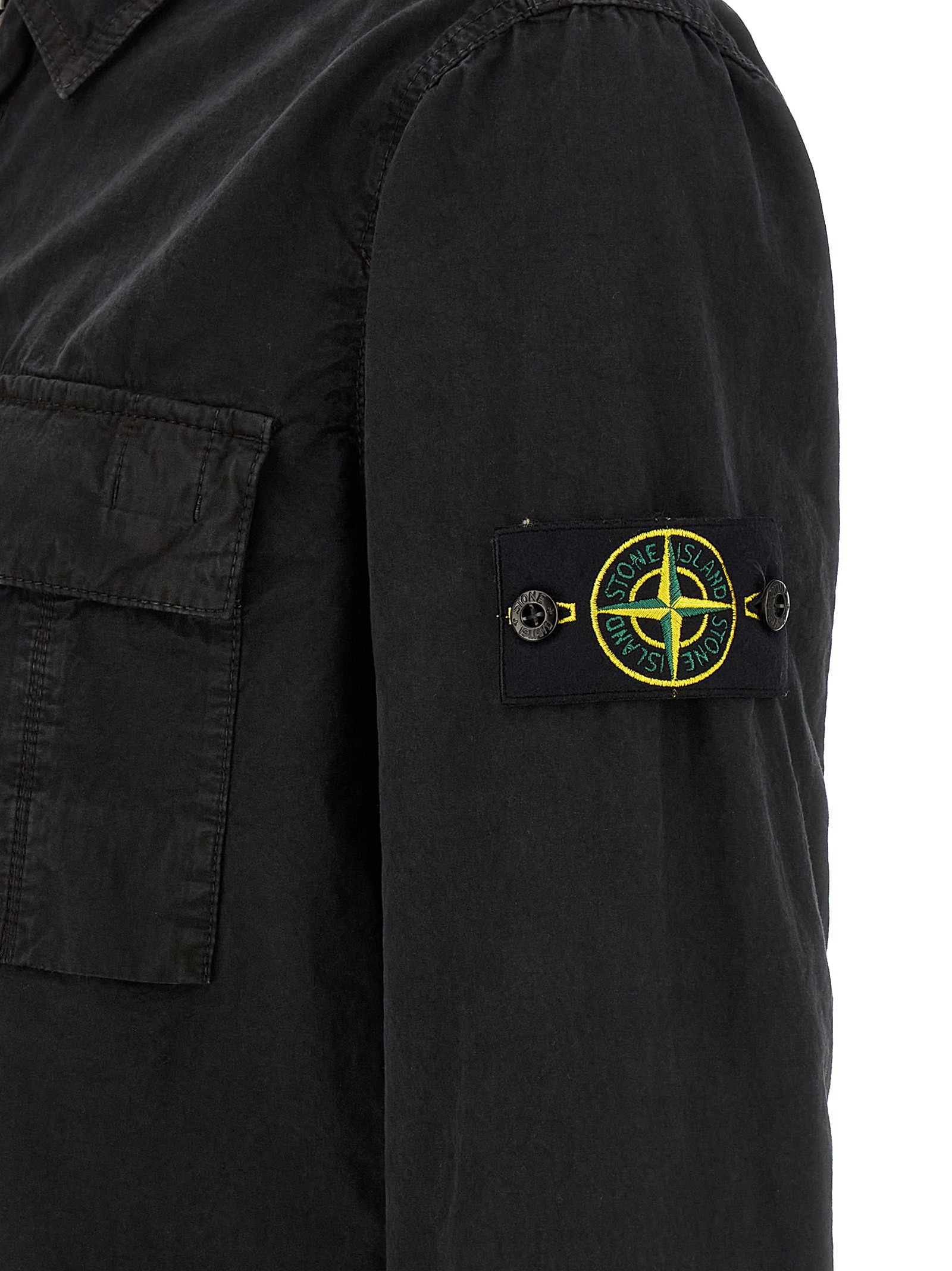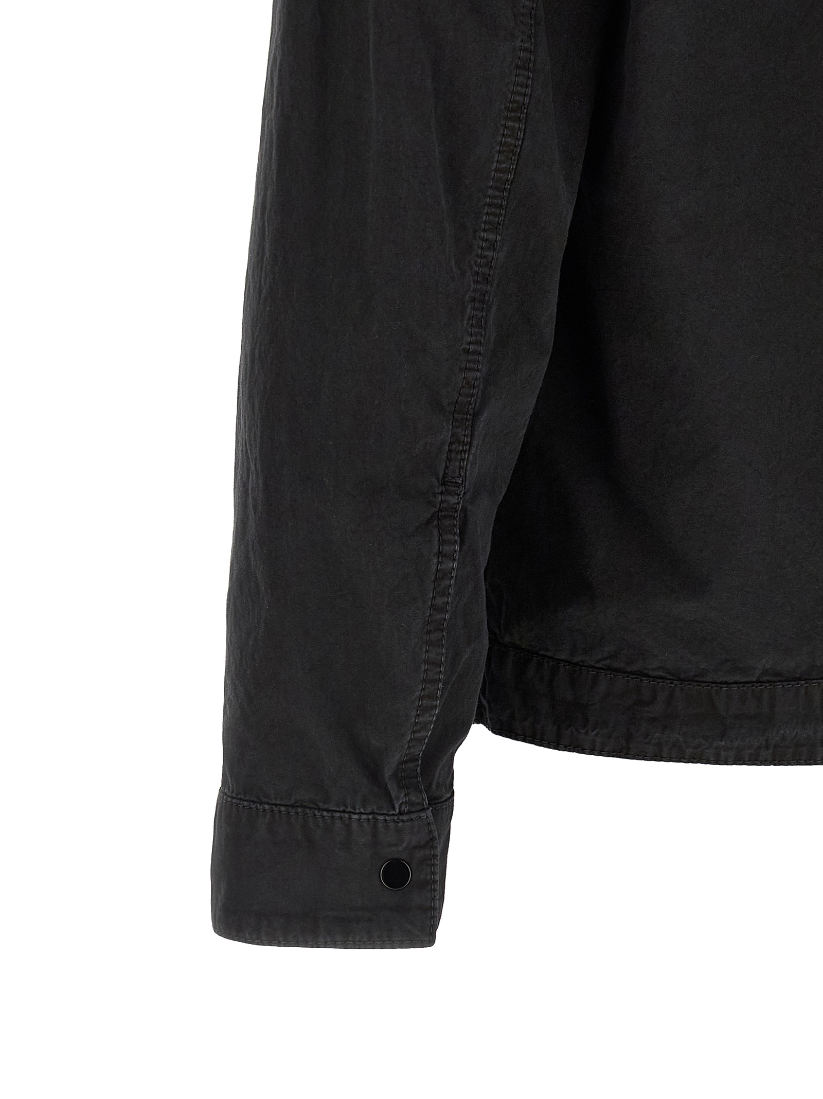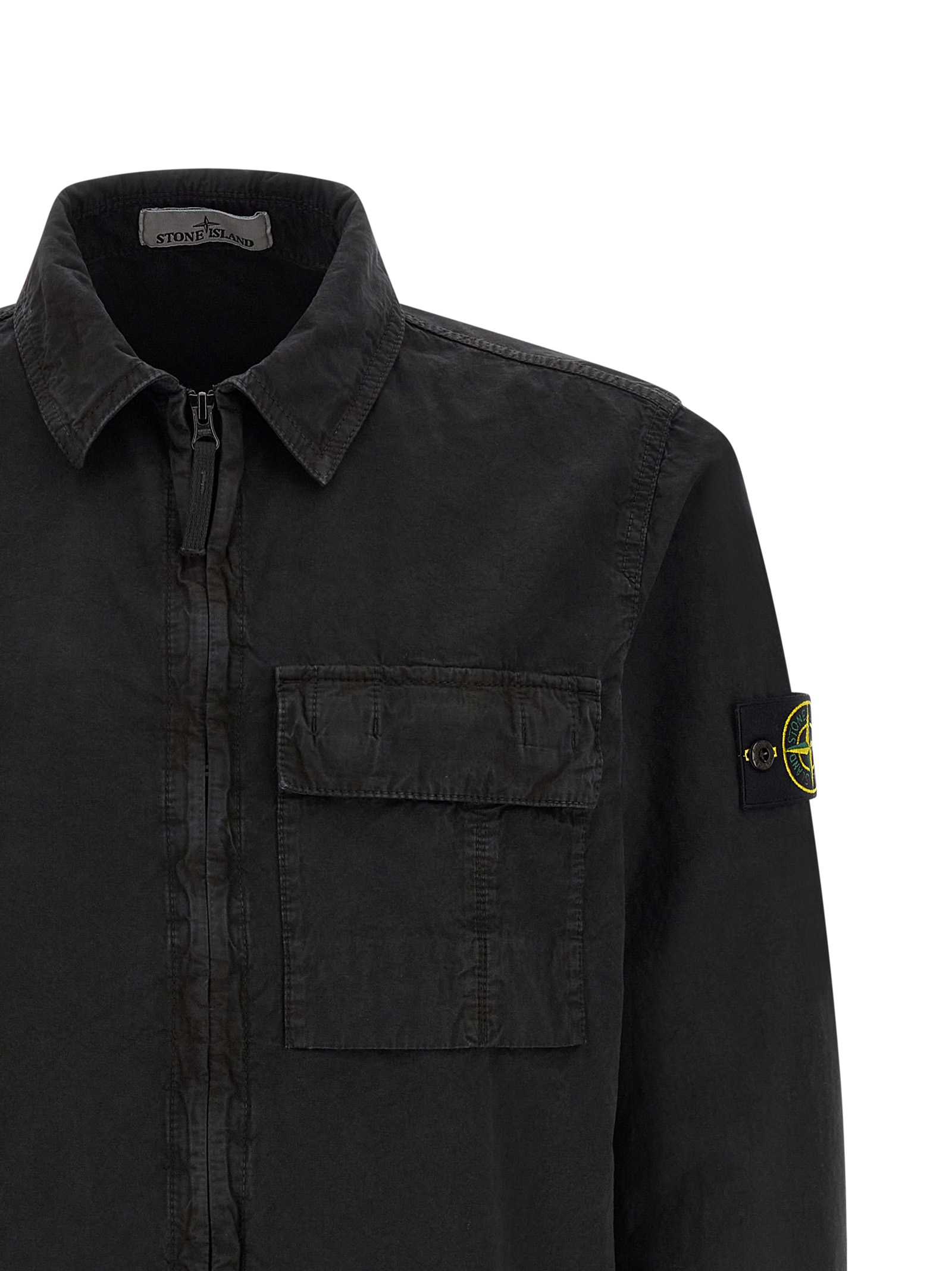 ‘1200008’ overshirt in garment-dyed brushed cotton canvas with ‘OLD’ treatment, front zip closure, breast pocket, long cuffed sleeves and logo badge appliqué.