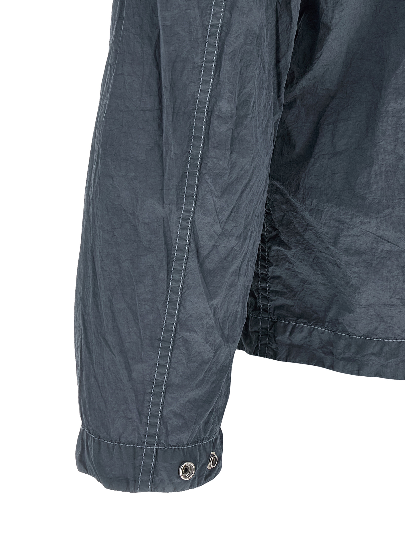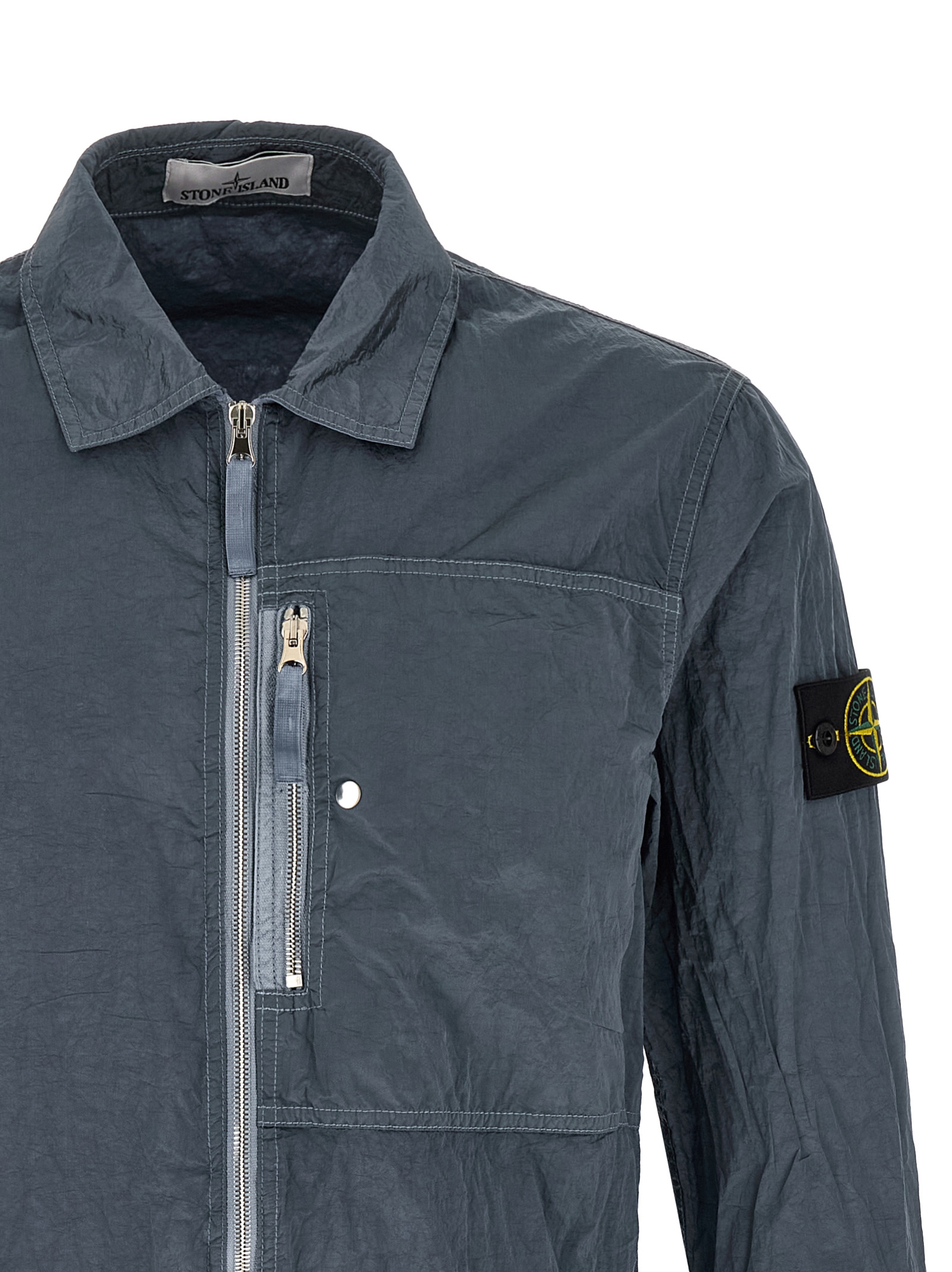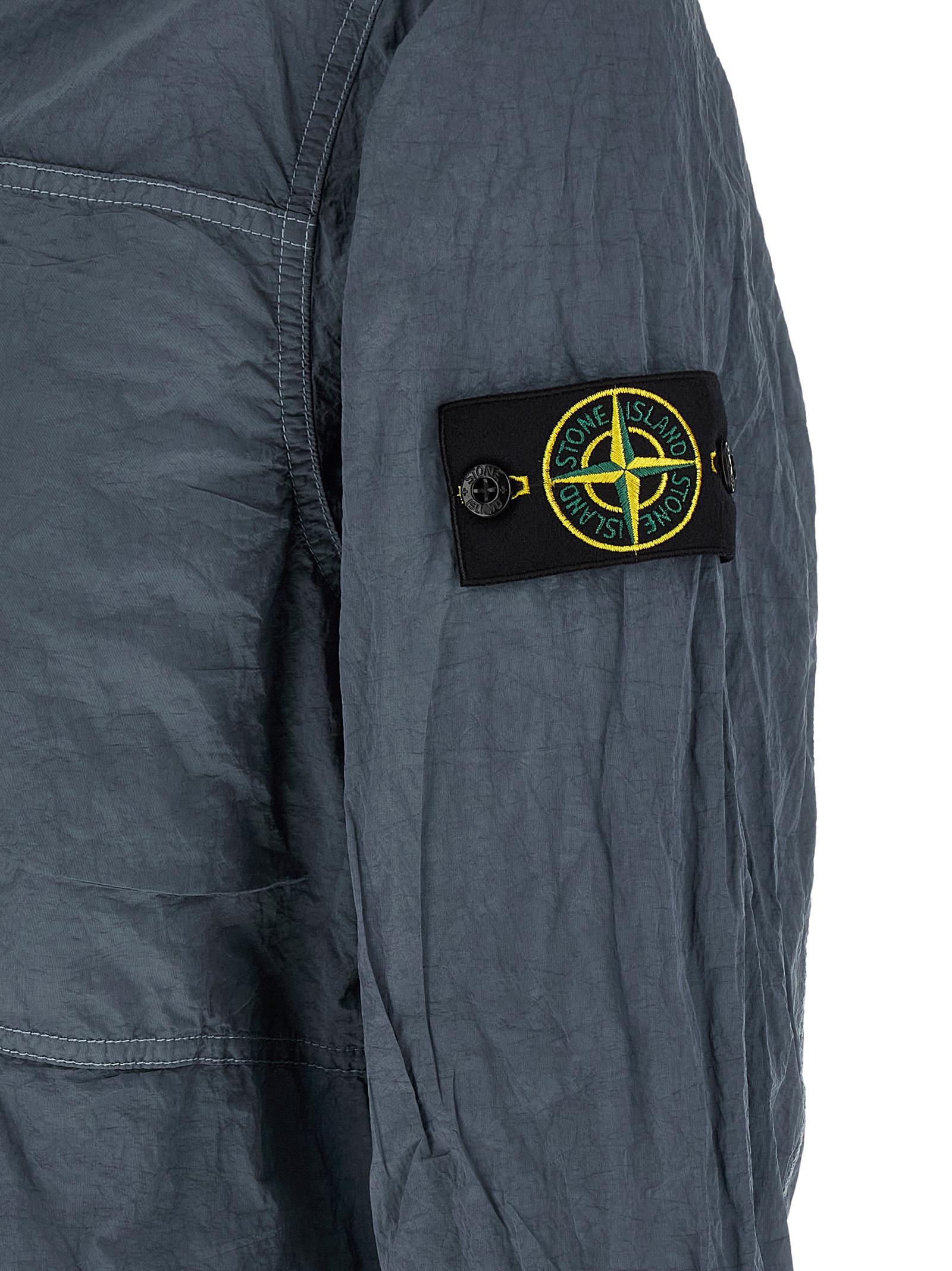 ‘1200038’ overshirt in Stone Island Nylon Metal fabric subjected to a double dyeing process, front zip closure, breast pocket, long sleeves with cuffs and logo badge applied.