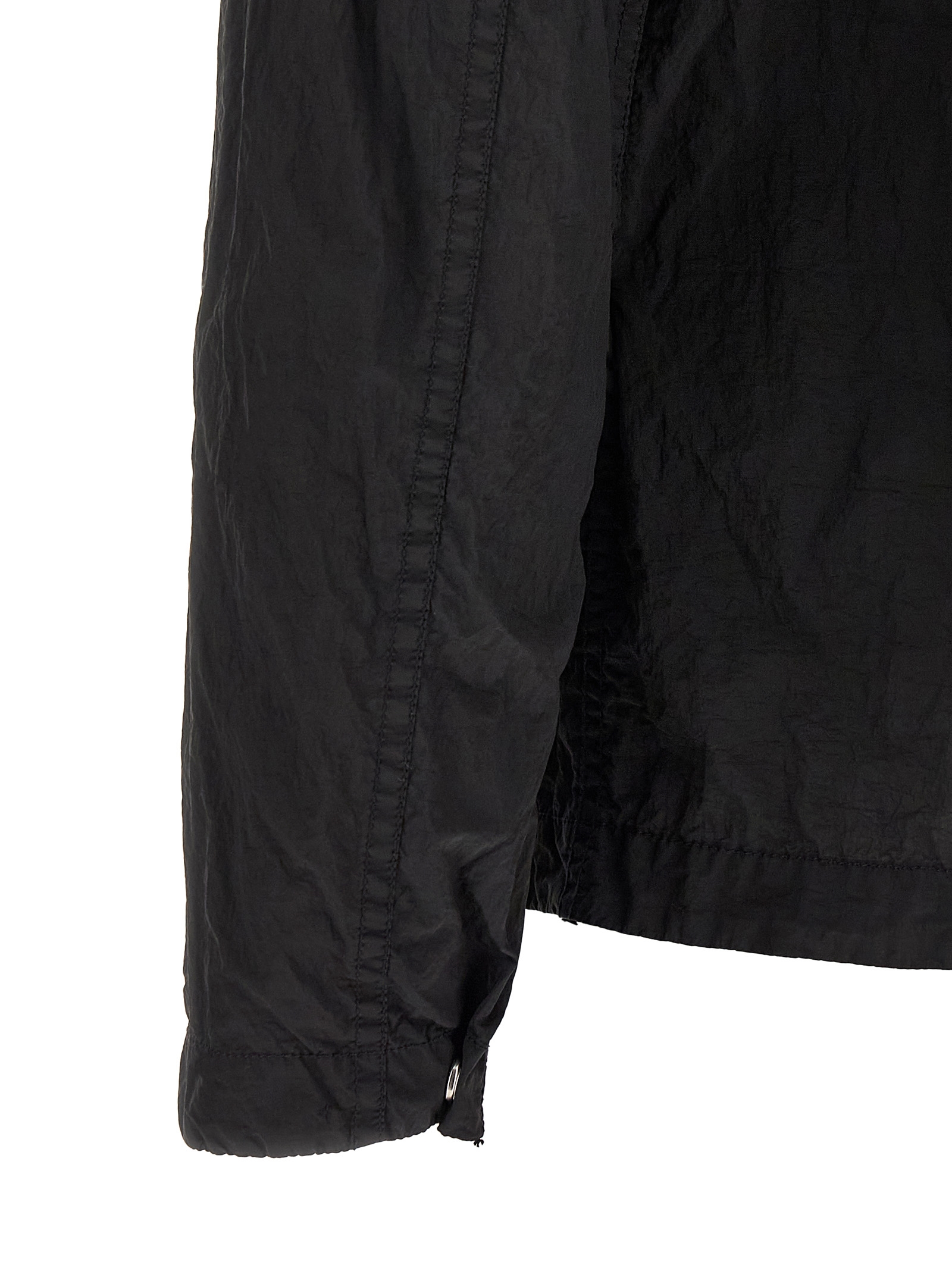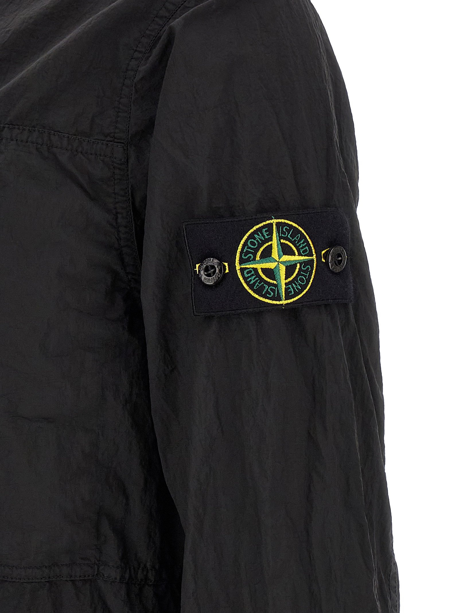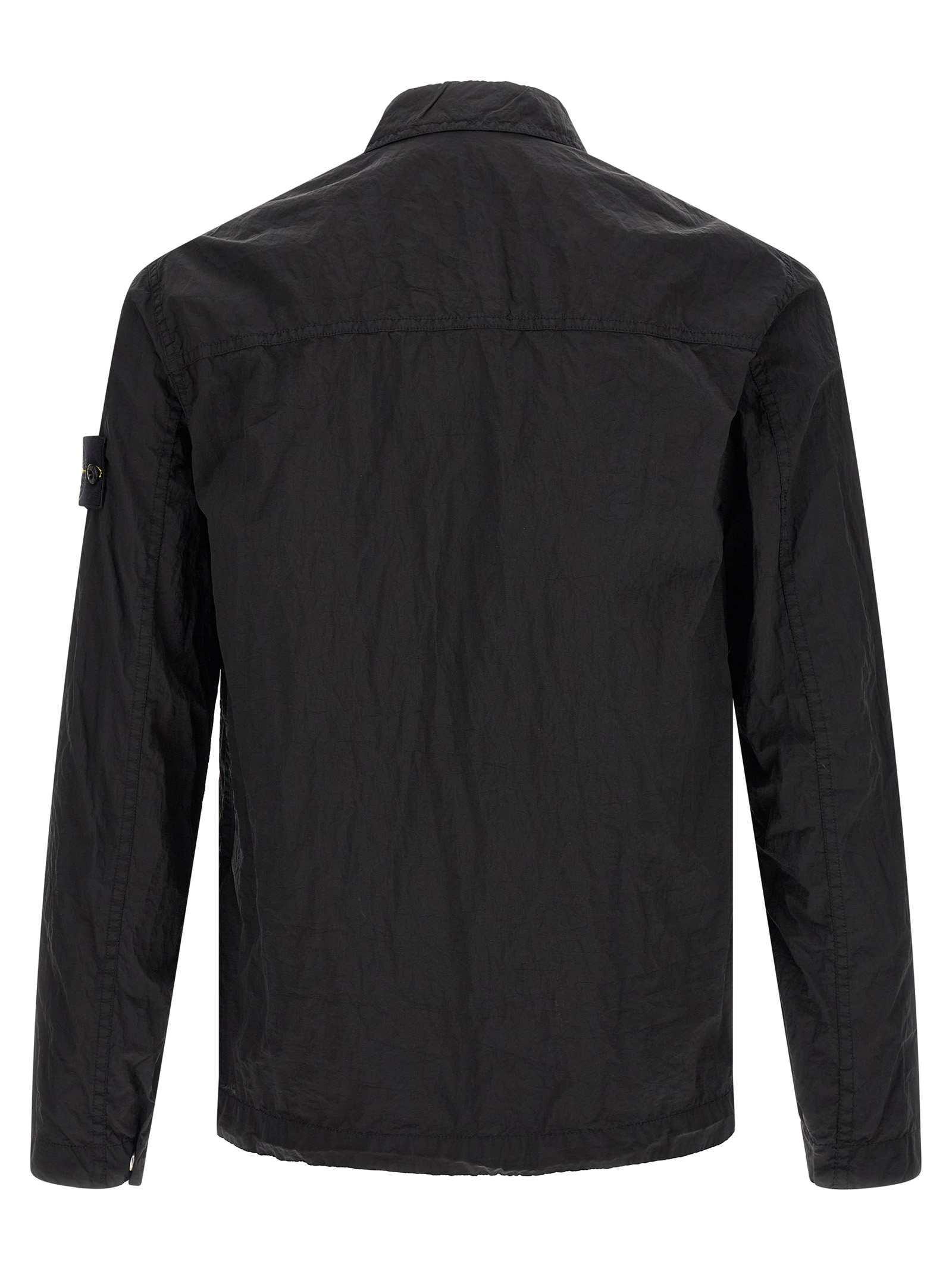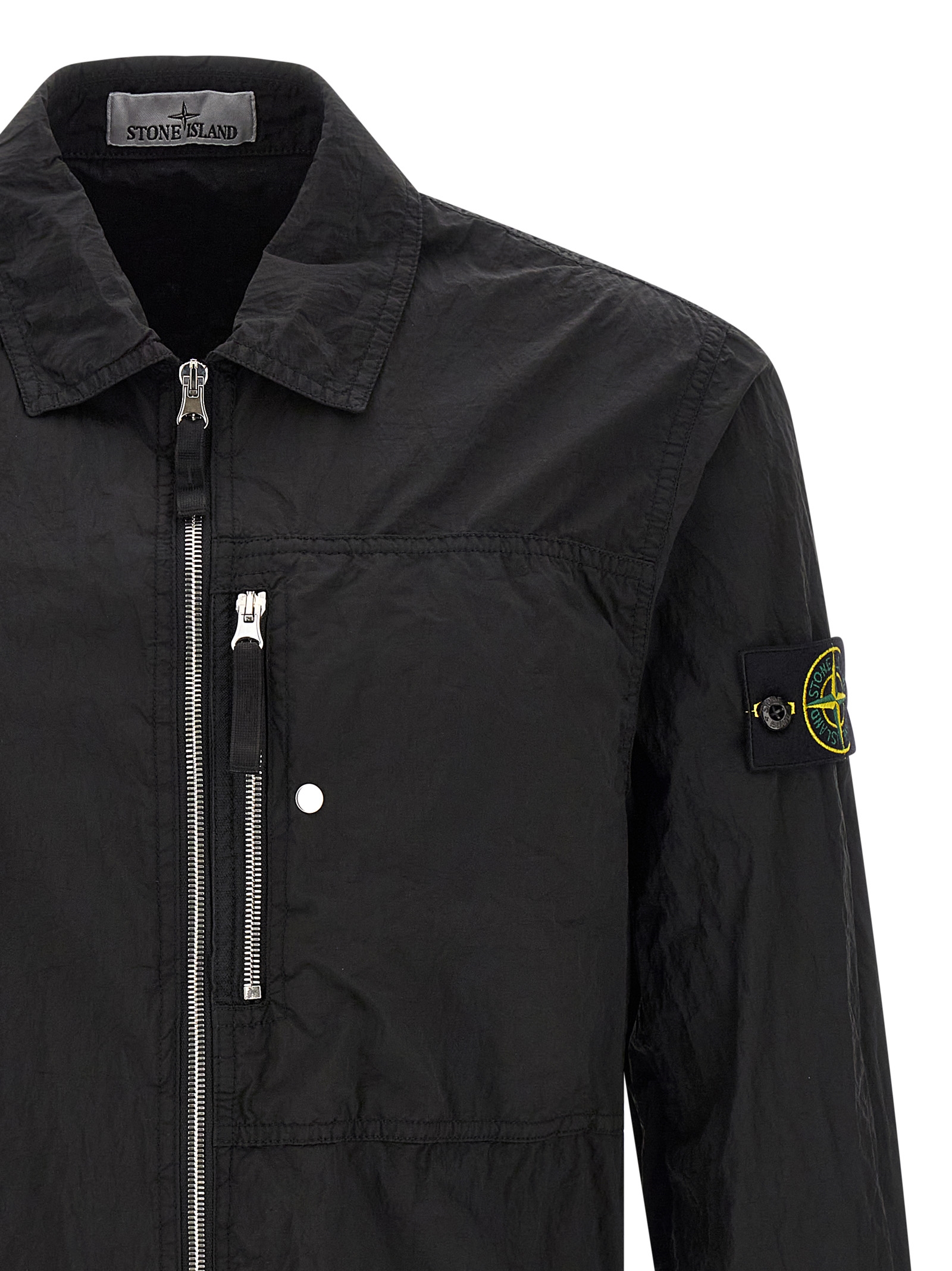 ‘1200038’ overshirt in Stone Island Nylon Metal fabric subjected to a double dyeing process, front zip closure, breast pocket, long sleeves with cuffs and logo badge applied.