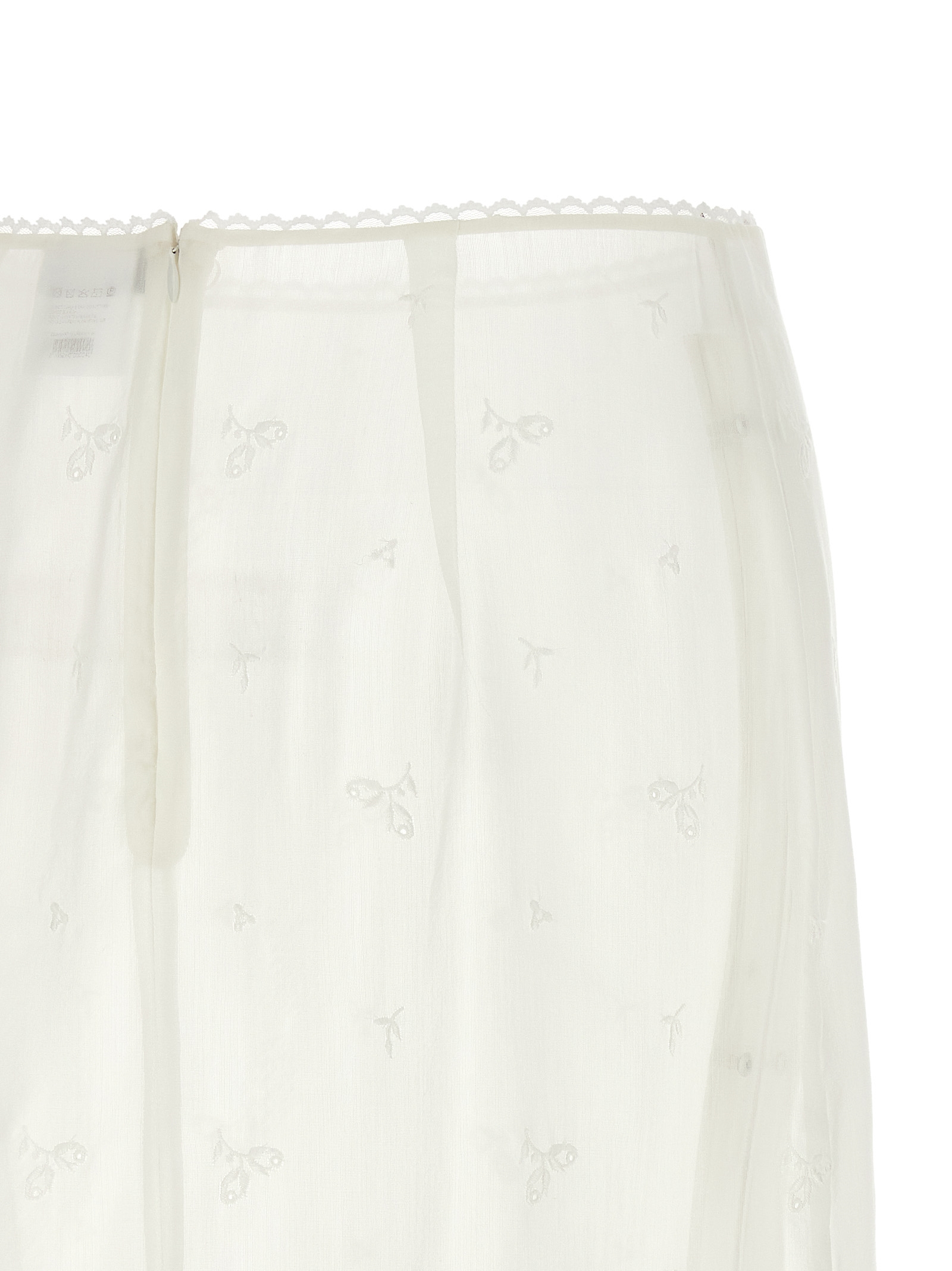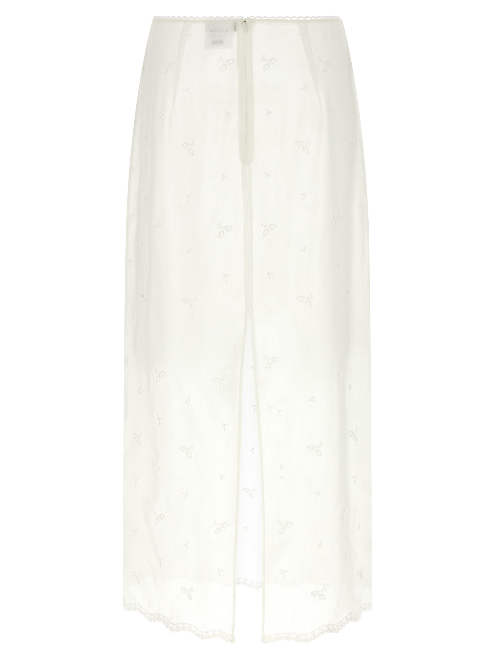 ’16’ midi skirt in light semi-transparent fabric with tone-on-tone embroidery, sheath silhouette, zip closure and wide back split, hem finished with trimmings.