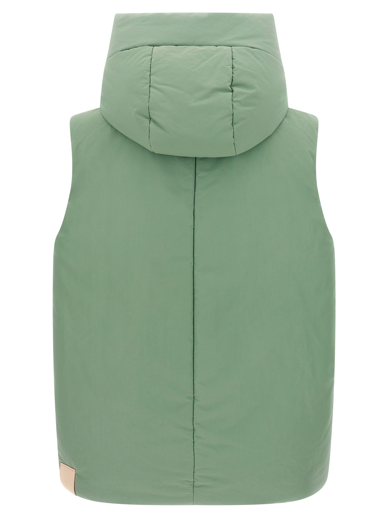 ‘160’ vest in water-repellent technical fabric with a wrinkled effect with goose down padding, hood, high neck, front zip closure, pockets, drawstring at the hem, leather patch with embossed logo on the back.