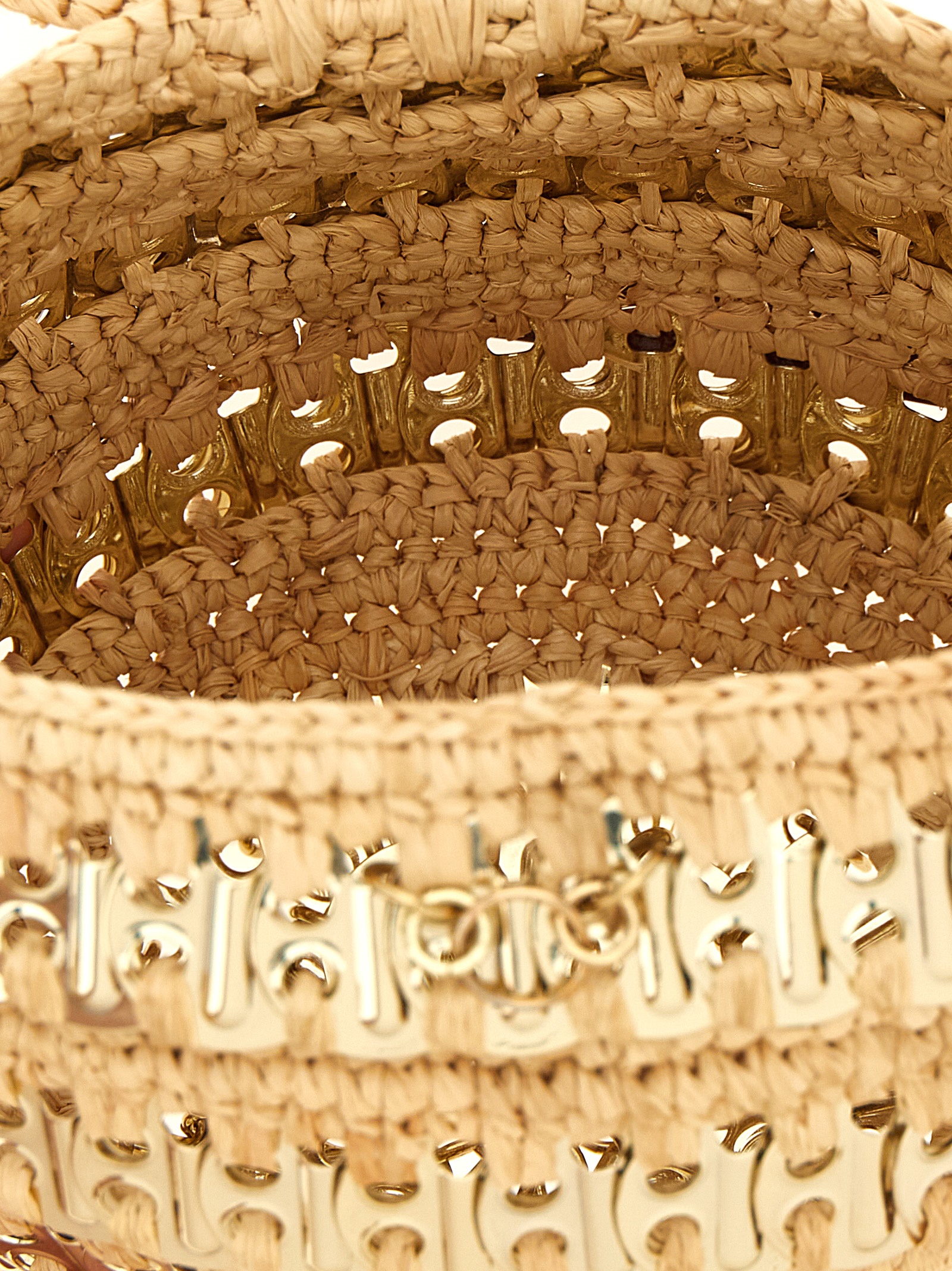 ‘1969 Ball’ handbag in woven raffia with metal discs, top shell with hook closure, leather handle.