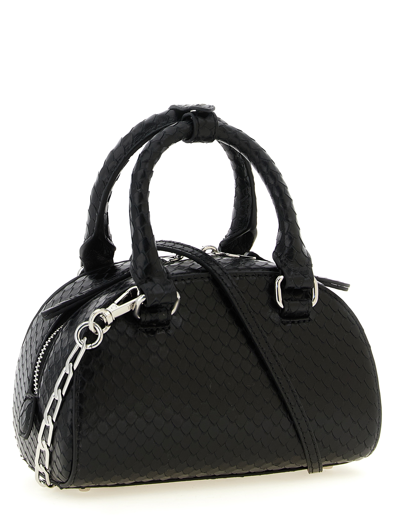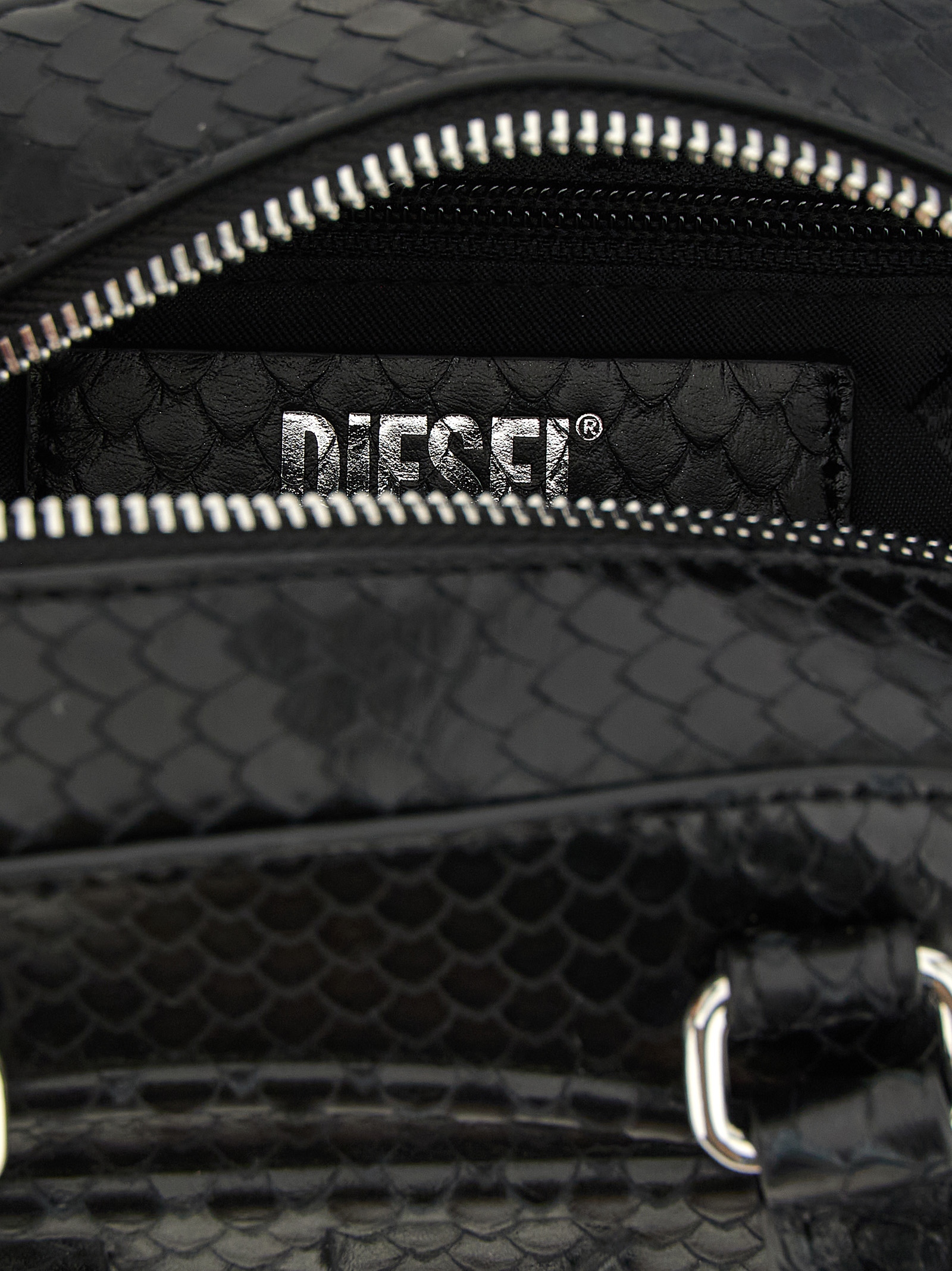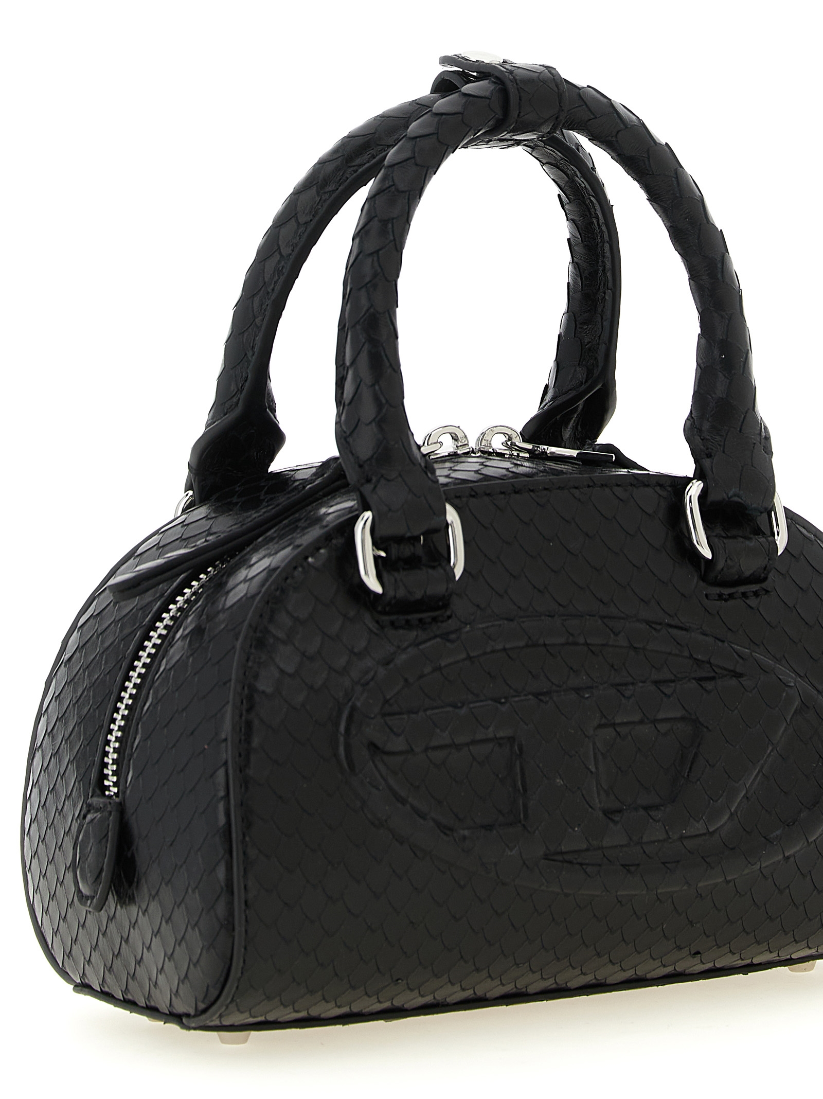 ‘1DR Dome’ mini crossbody bag in Taipan snake-effect embossed leather, Bowling model, high-frequency embossed ‘Oval D’ logo on the front, top zip closure, double fixed tubular handle, rigid base with metal feet, adjustable and removable shoulder strap.