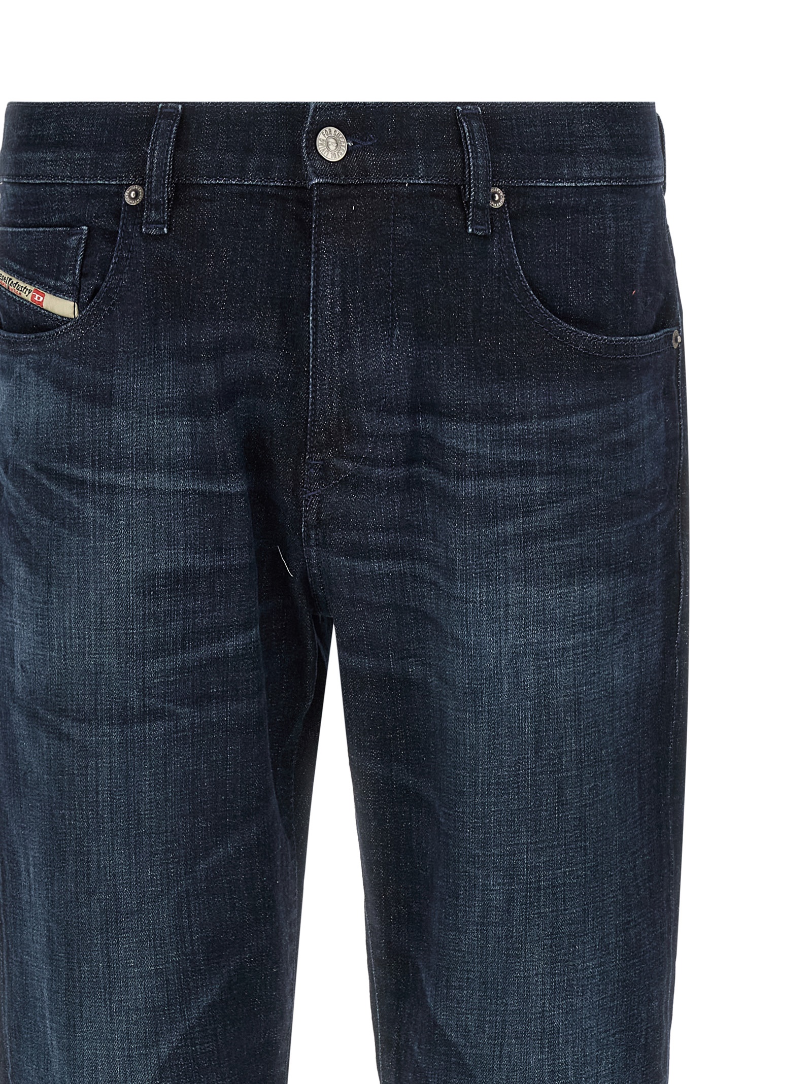 ‘2019 D-Strukt 0adbl’ jeans in slightly nuanced wash comfort denim, contrast stitching, mid waist, straight leg, zip and front button closure, five pockets.