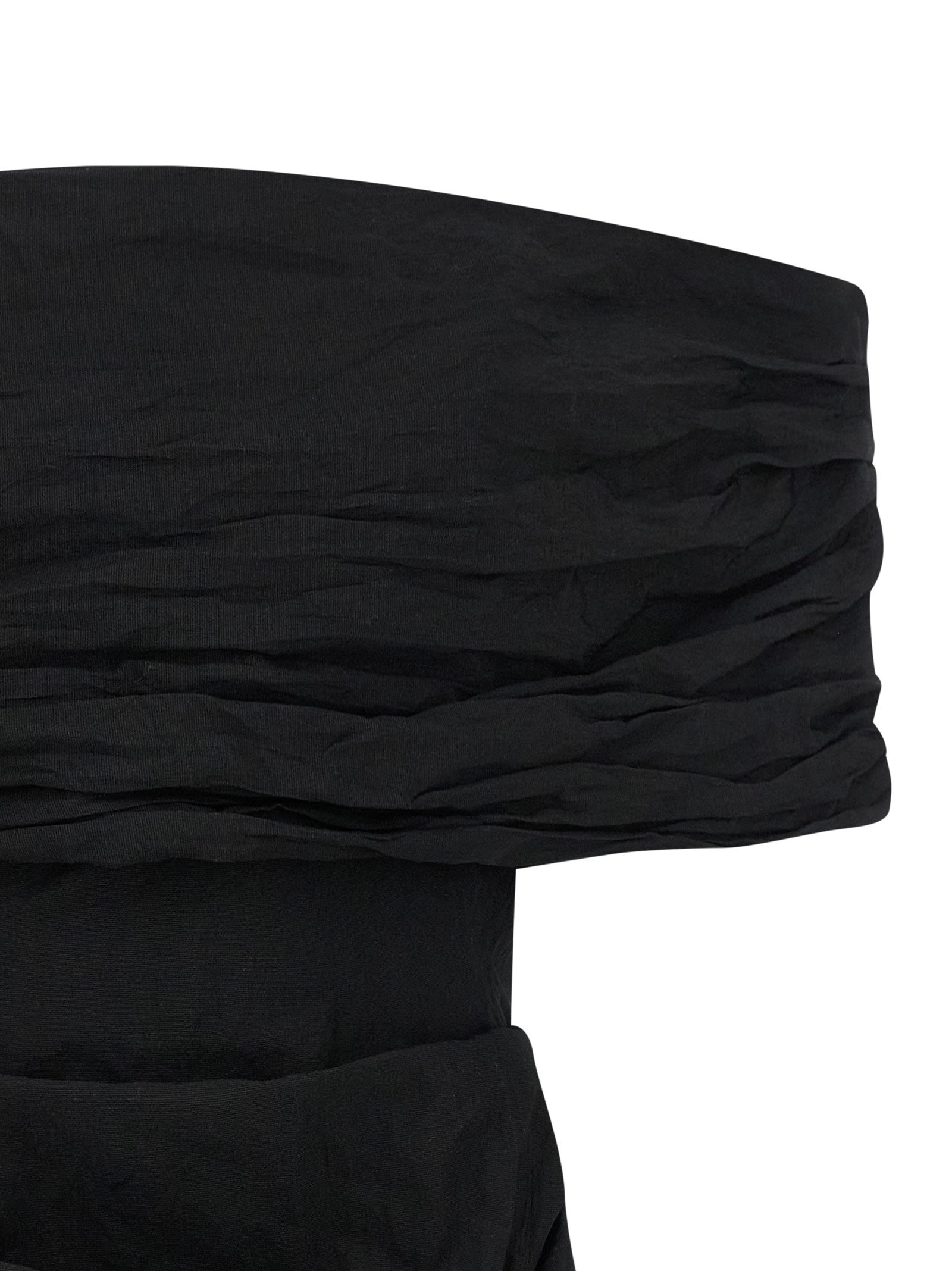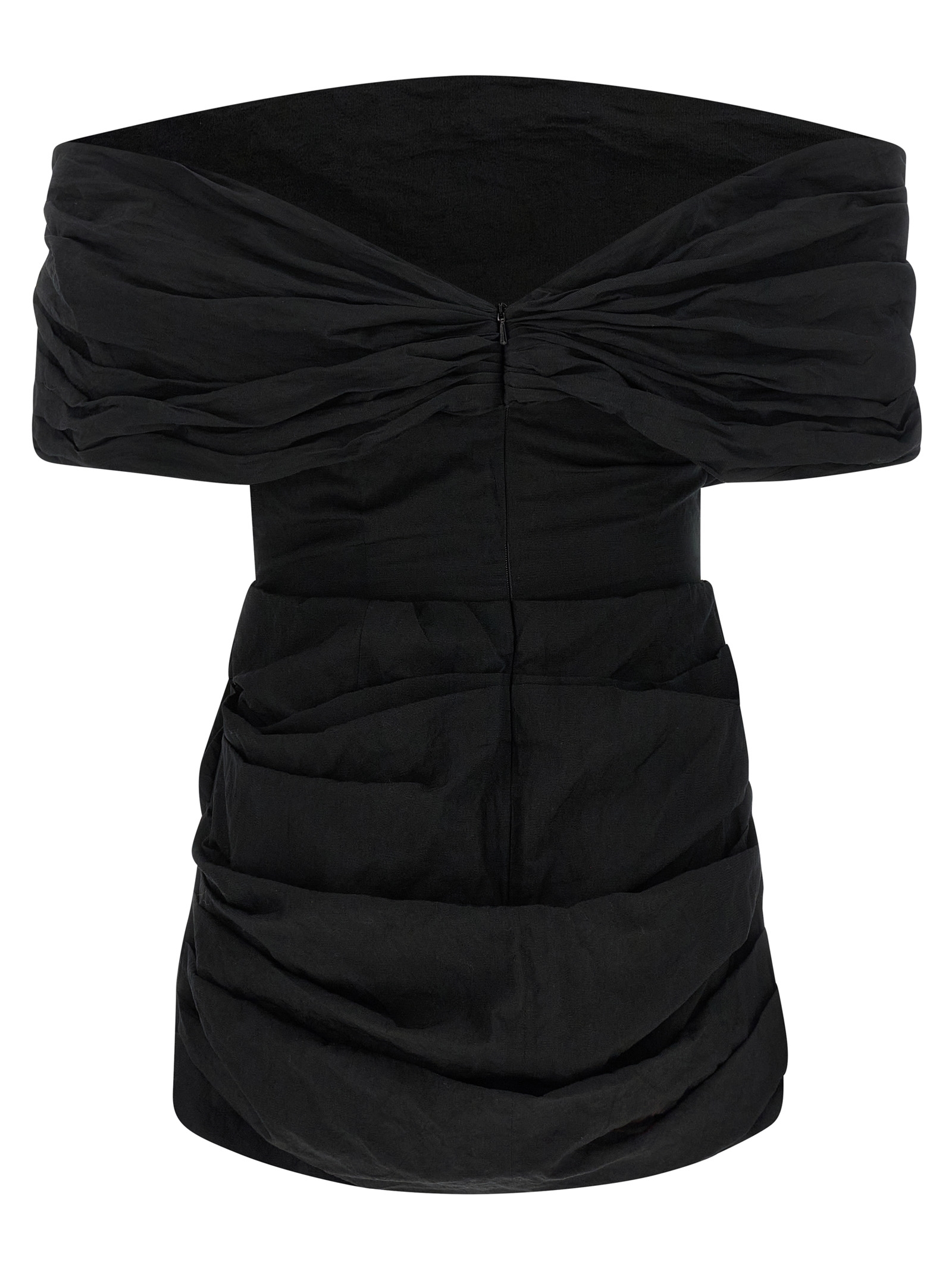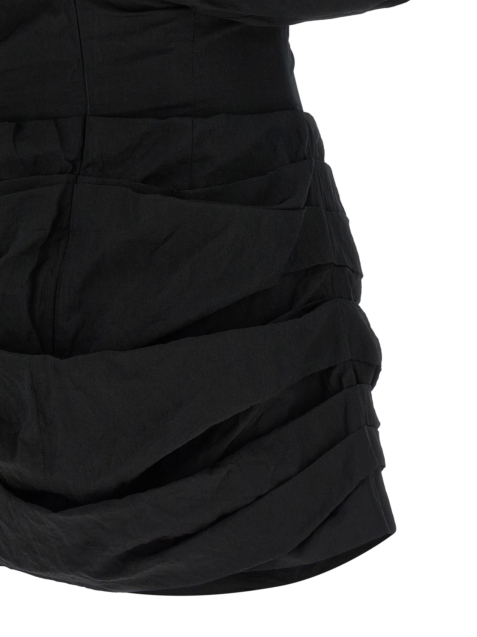 ’22’ wrinkled-effect cotton mini dress, off-the-shoulder model with oversized collar and sculptural draping that descends softly on the arms, bodice with inner splints, skirt with flounced pincers and drapes front and back, V-neck and back zip closure, silk lining.