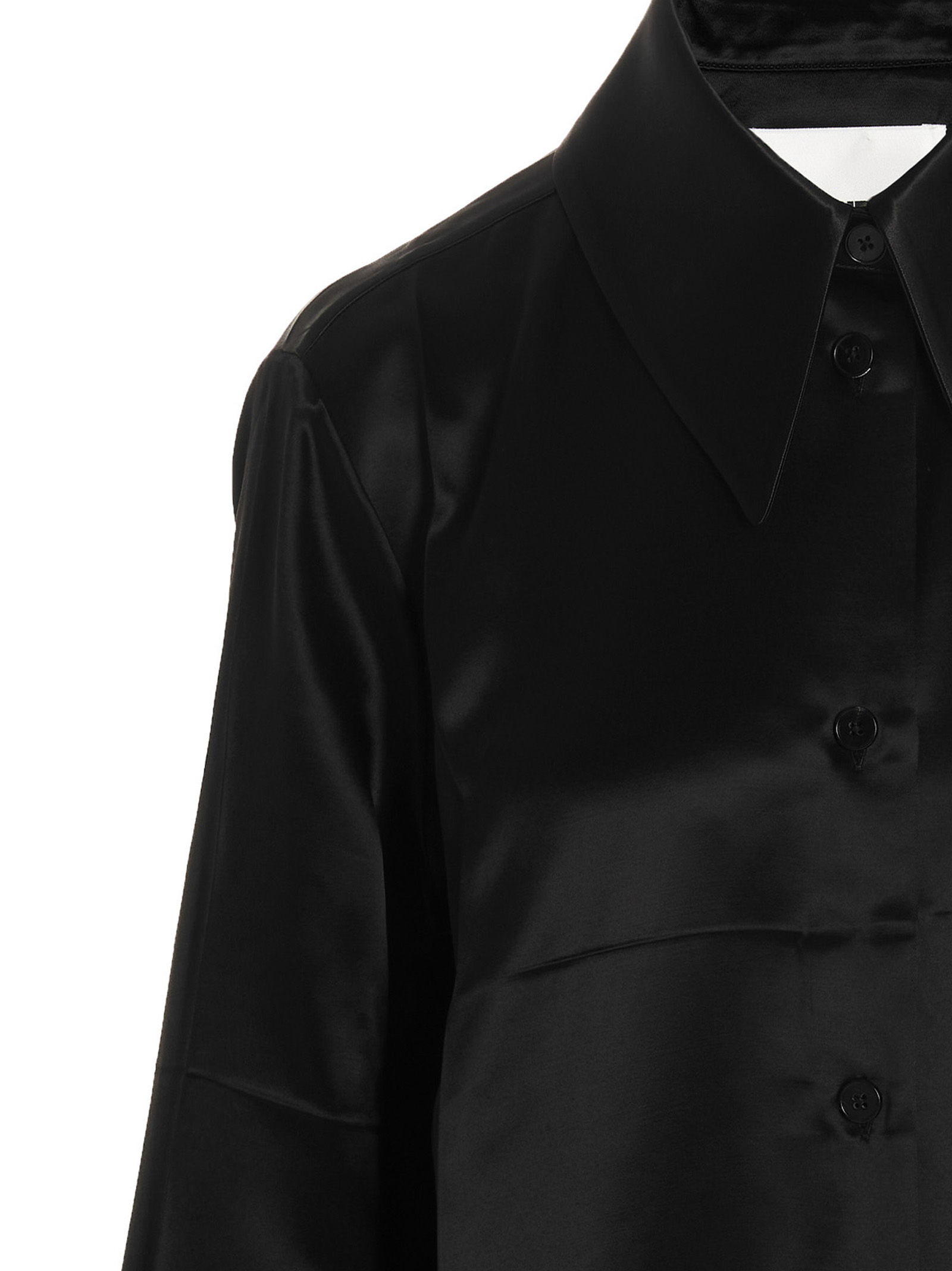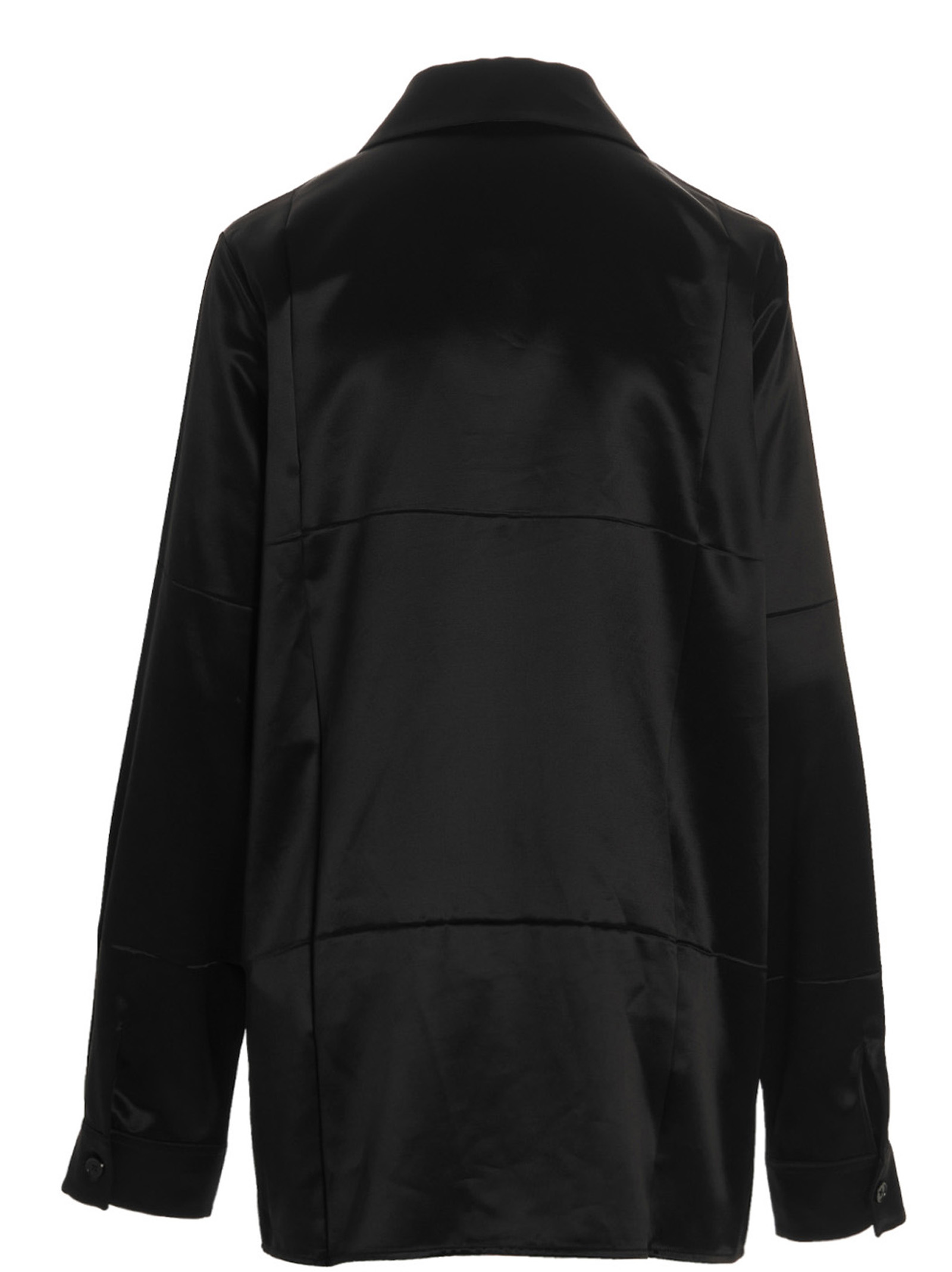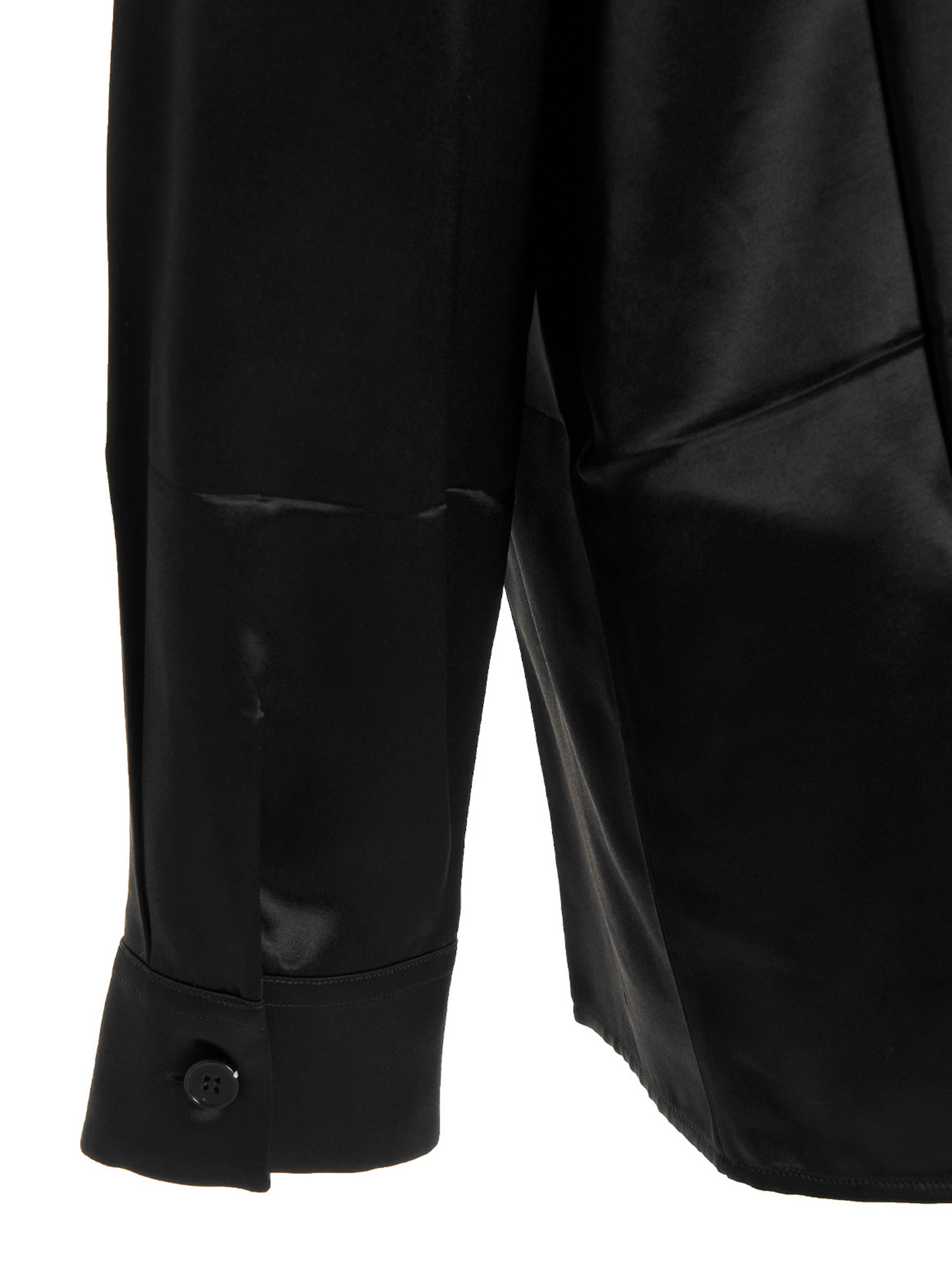 26′ satin shirt with pointed collar, button closure, long cuffed sleeves and a wrinkled effect detail.