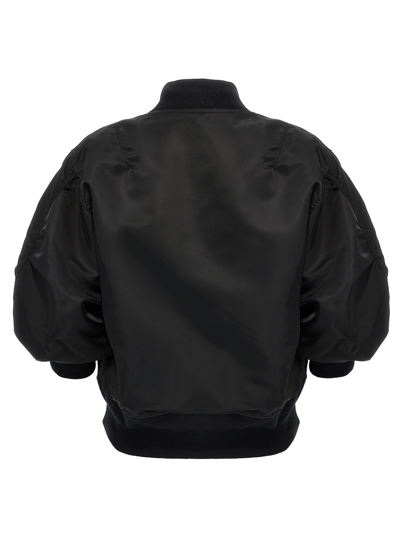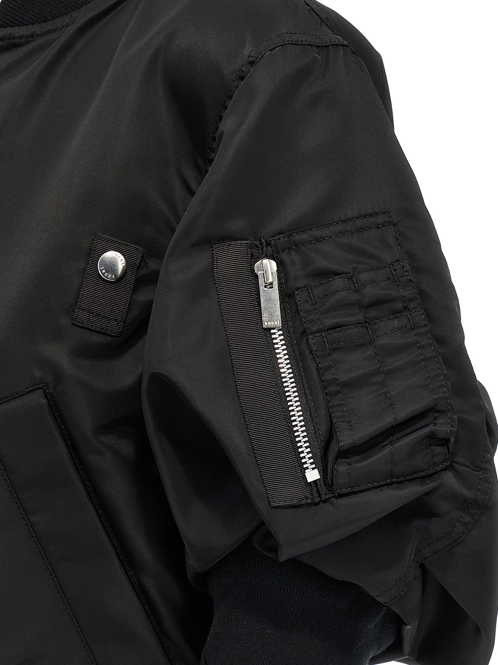 Nylon bomber jacket, 3/4 sleeves, knit band detail at the end of the sleeve, collar and hem, zip closure, pockets.