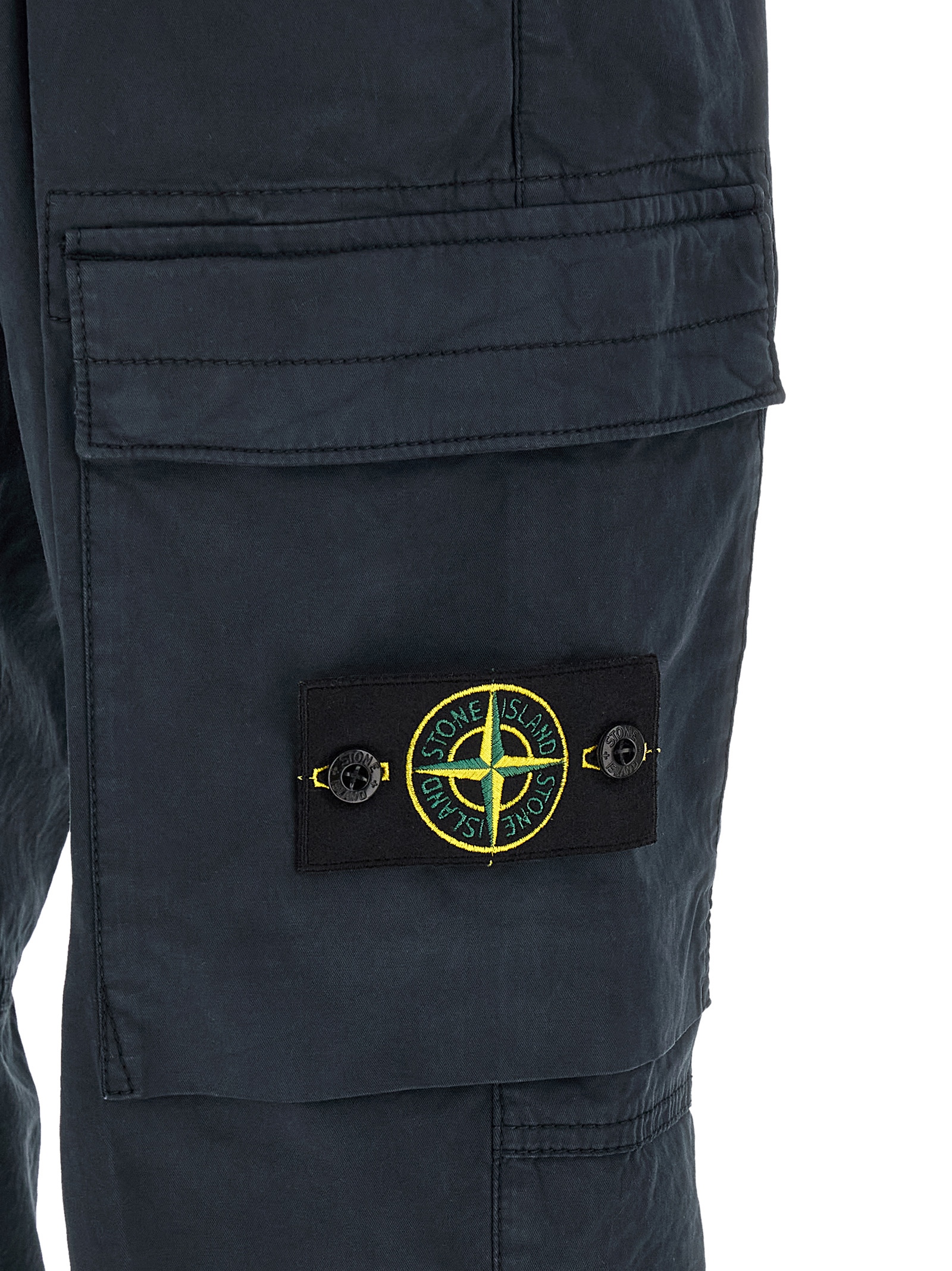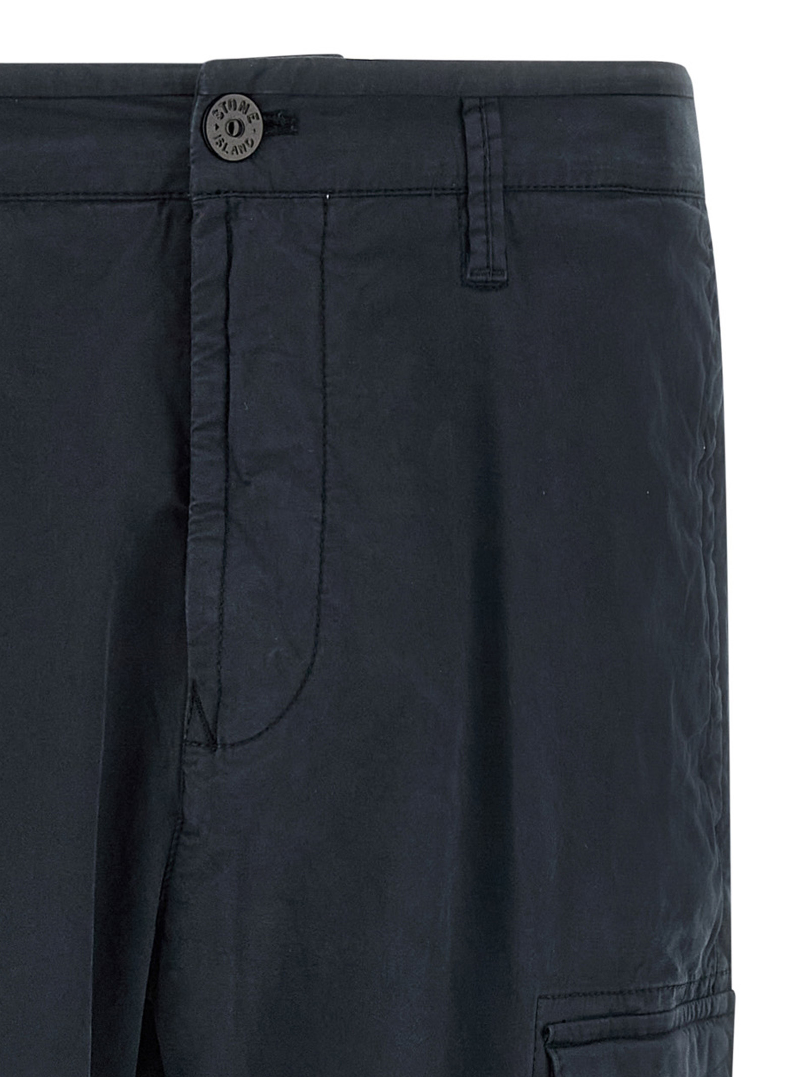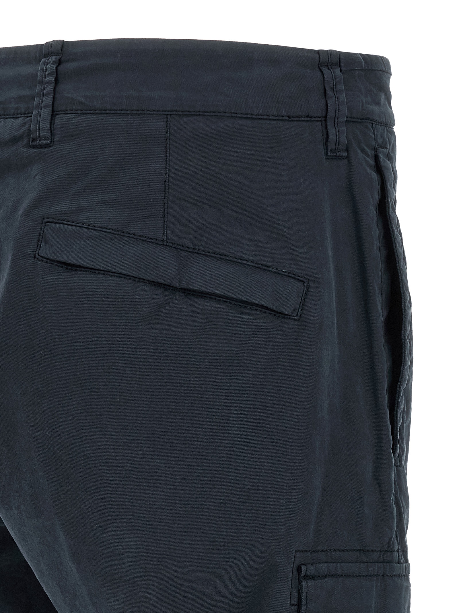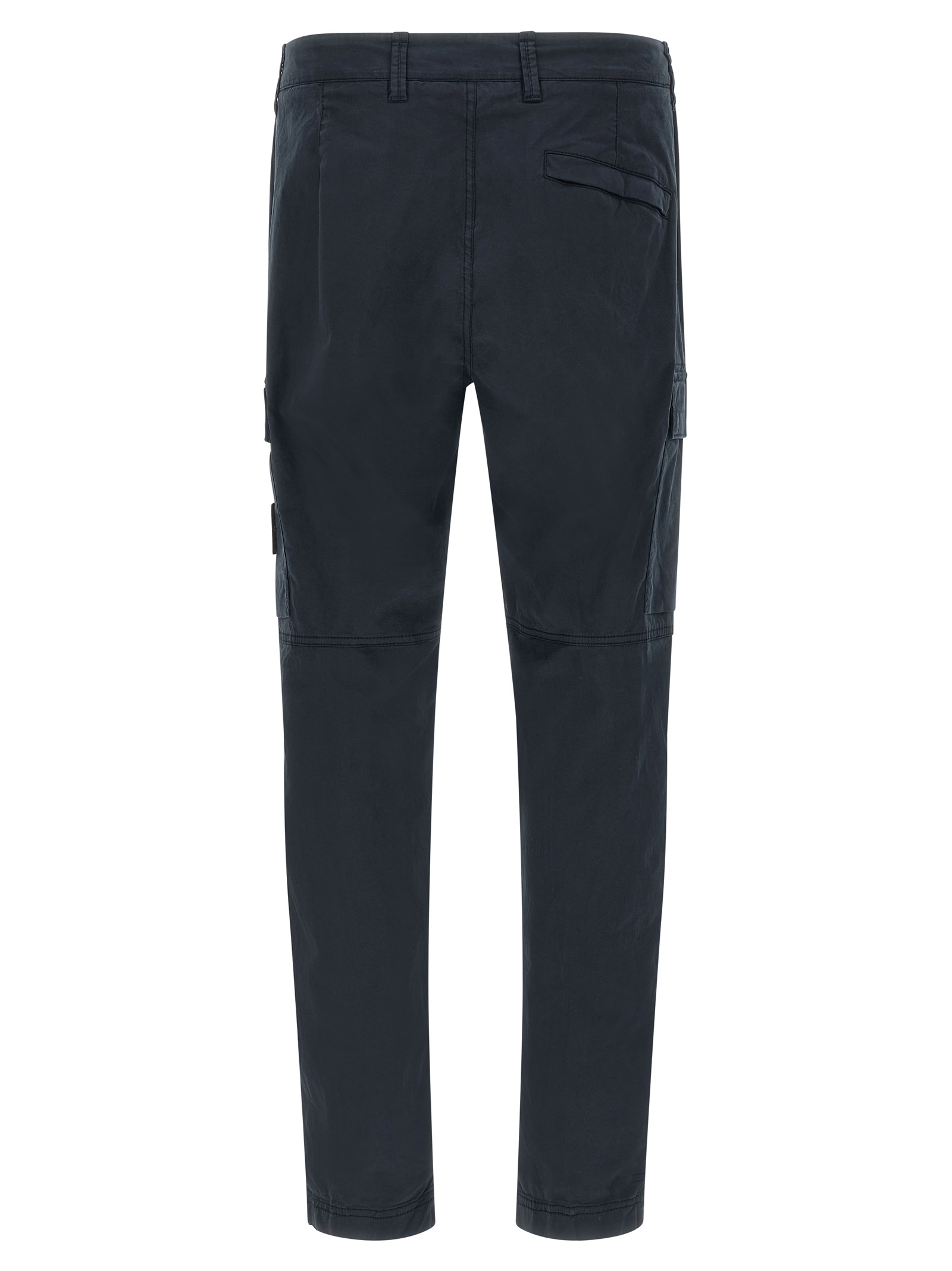 ‘3100032’ trousers in garment-dyed stretch cotton twill, cargo style with side pockets and logo badge, straight leg with shaped knees, zip and front button closure, reinforced inner waist with contrast lining, pockets.
