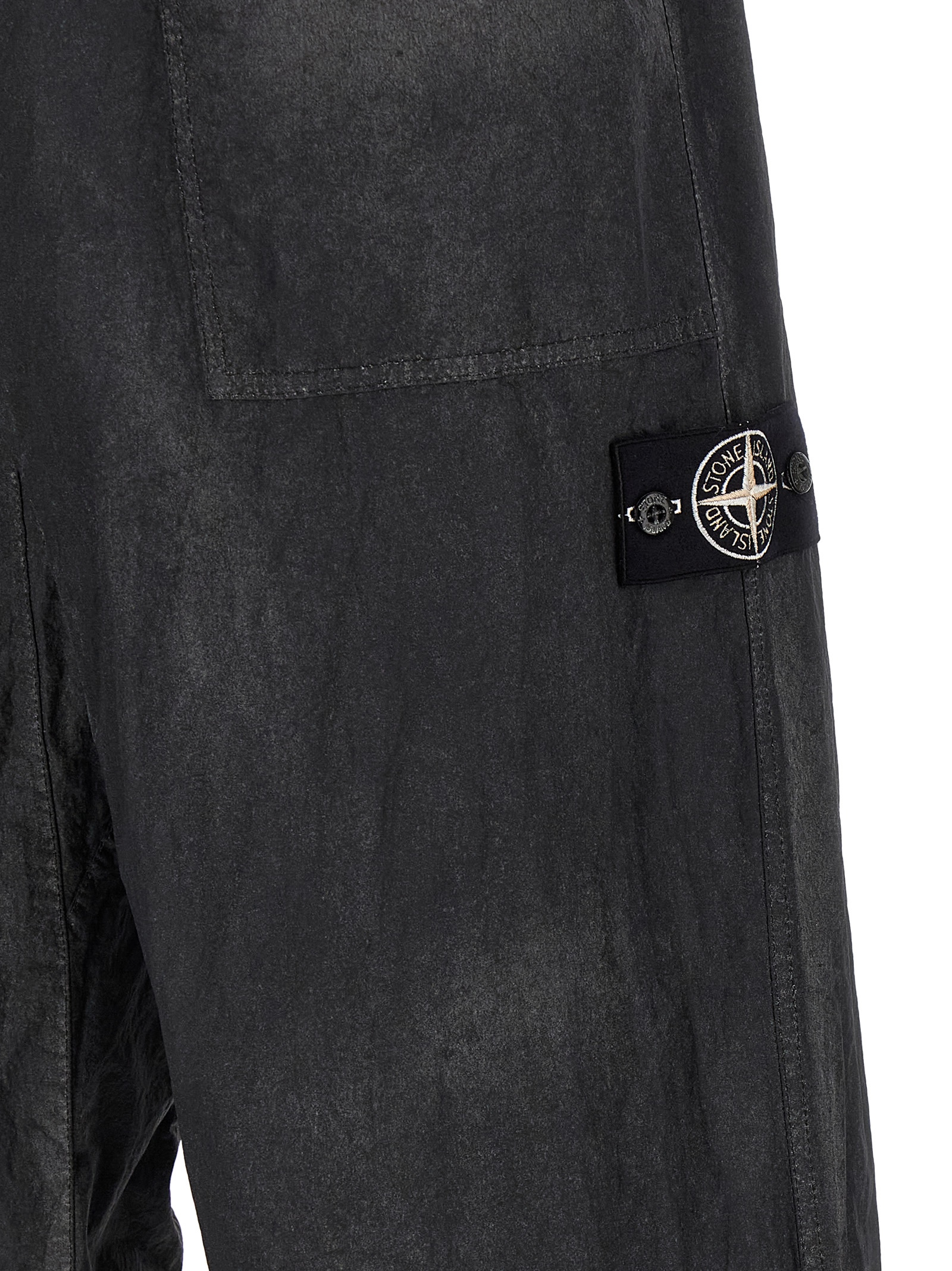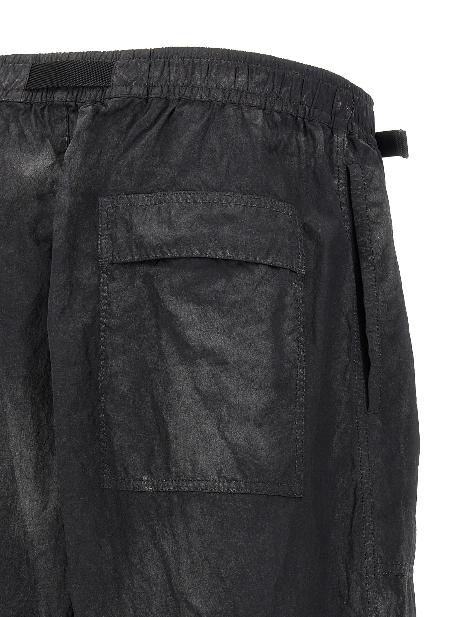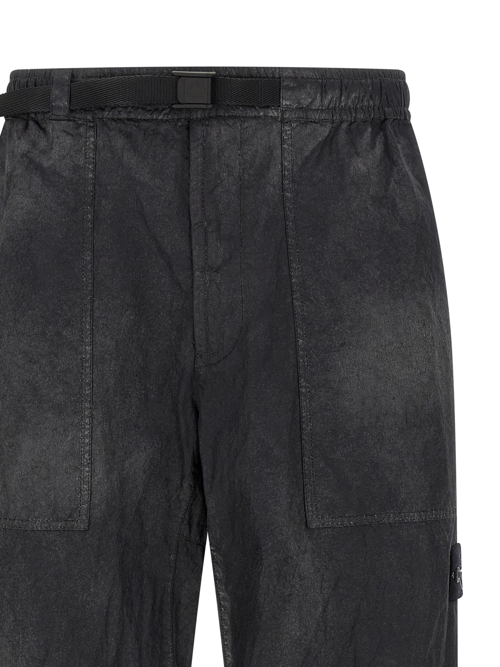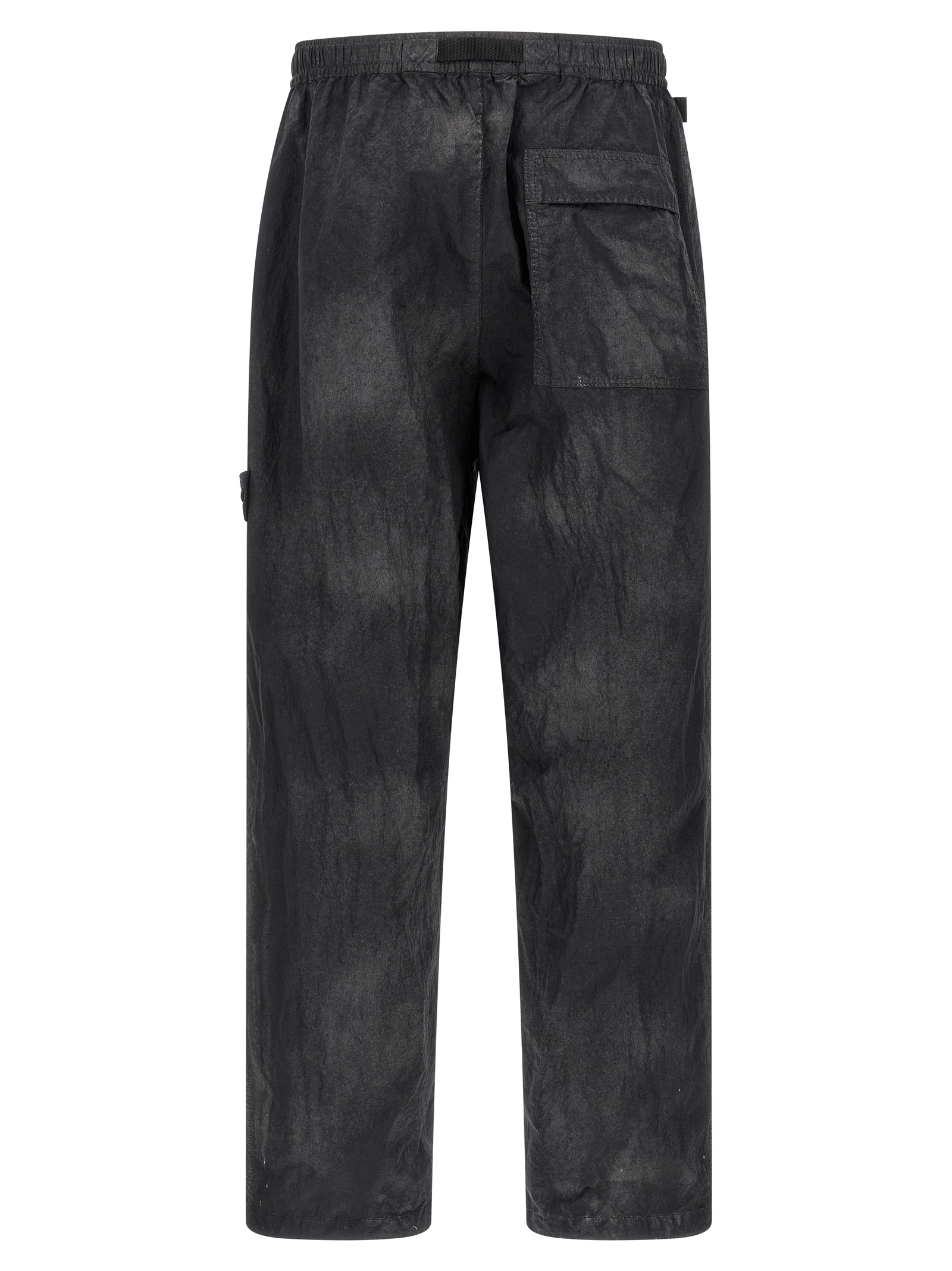 ‘3100040’ fatigue pants in compact nylon fabric dyed in garment and manually sprayed with a reflective solution containing thousands of glass microspheres that slide on the anti-drip surface of the fabric creating a marbled appearance, elastic waistband with nylon ribbon belt and cam buckle, zip flap, pockets, ‘ Badge Stone Island Research logo applied on the side, wide leg, drawstring on the leg bottom.