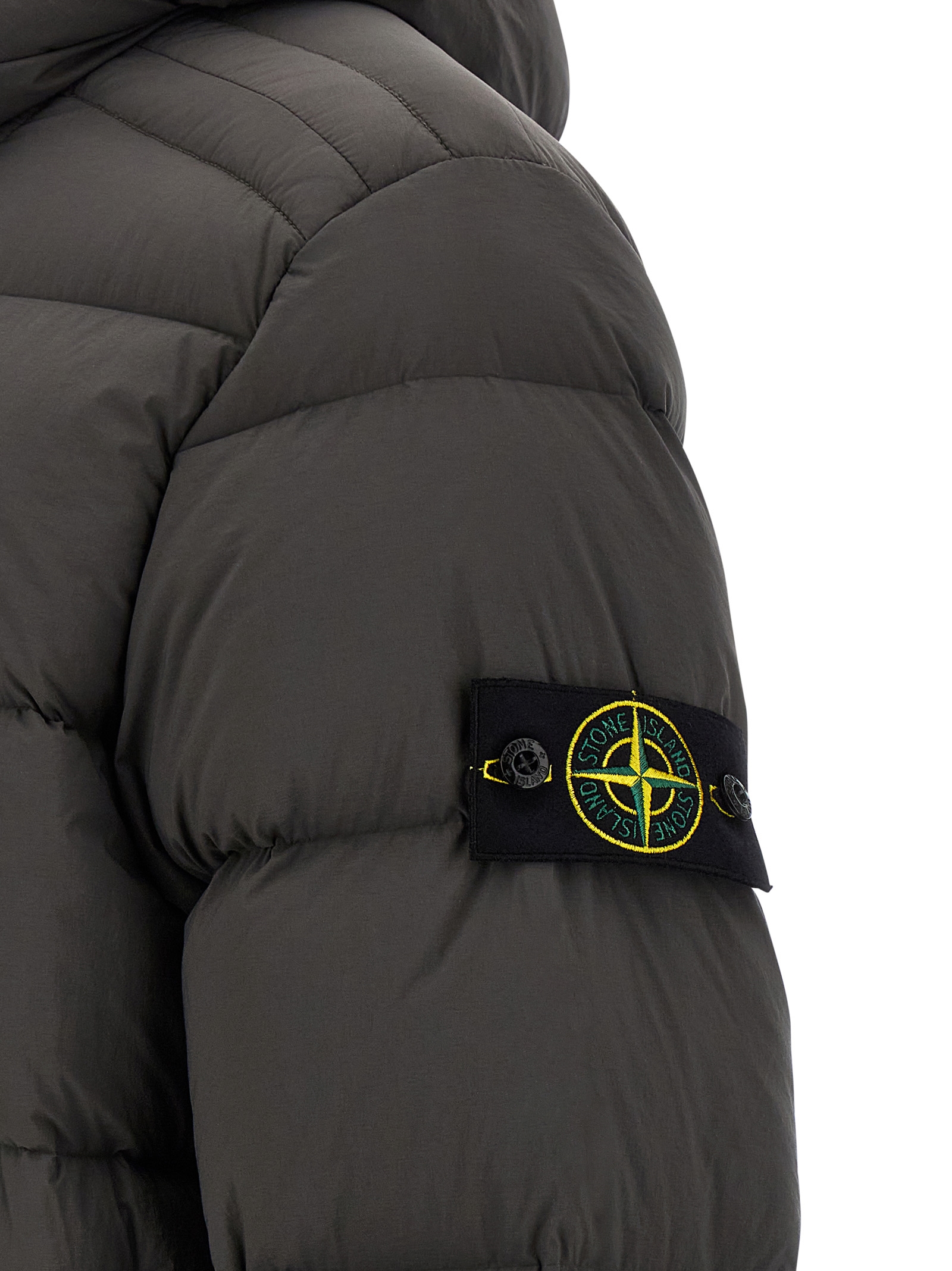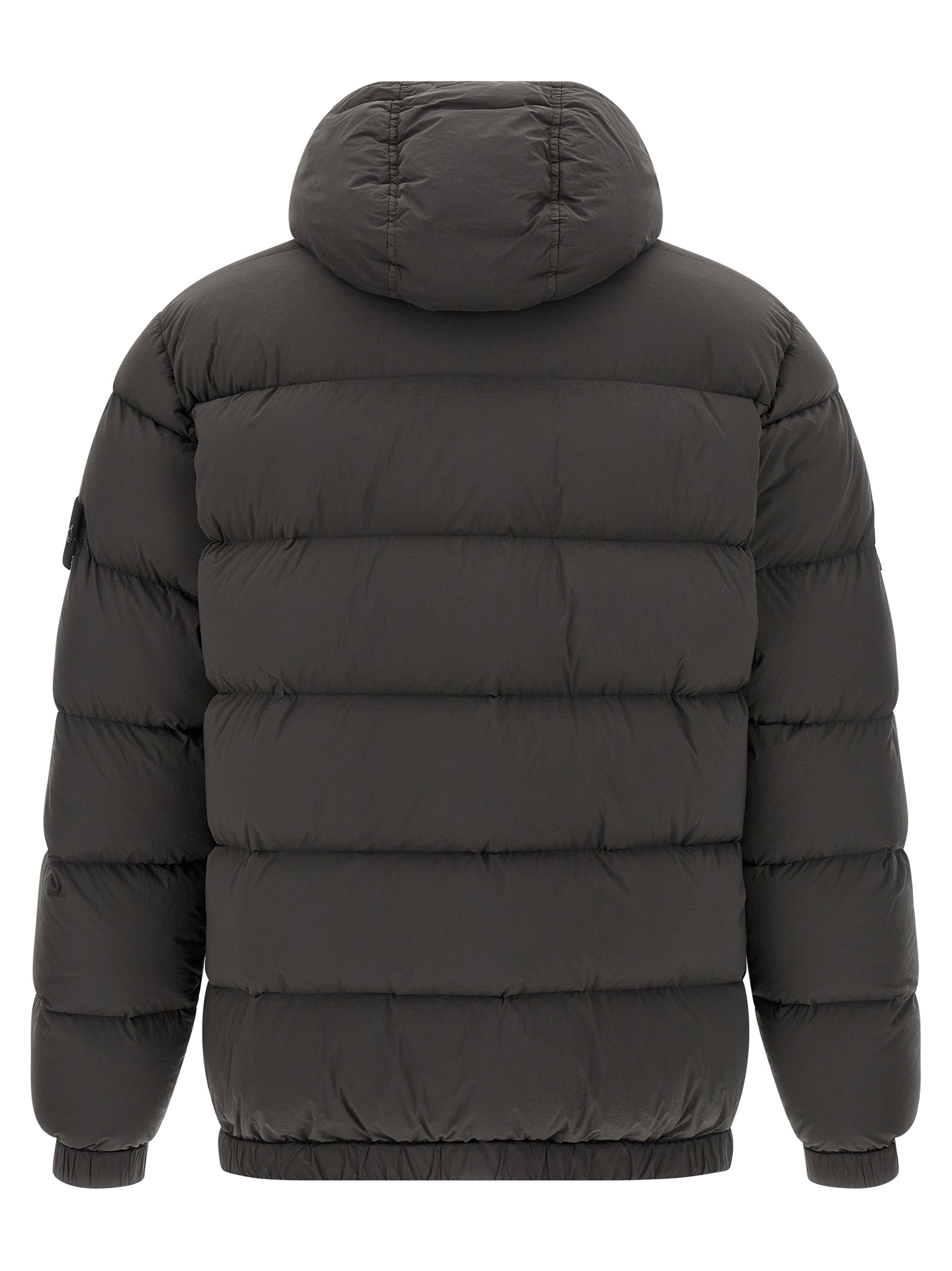 ‘4100040 Seamless Tunnel Nylon Down-TC’ down jacket in lightweight nylon fabric with a single stretch layer garment-dyed with quilted drip treatment, goose down padding, adjustable hood, front zip closure, pockets, long sleeves with elastic cuffs and logo badge, elastic hem.