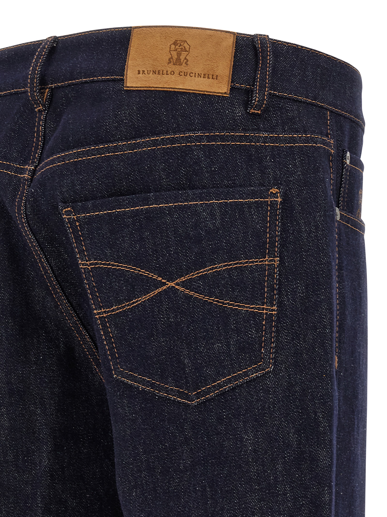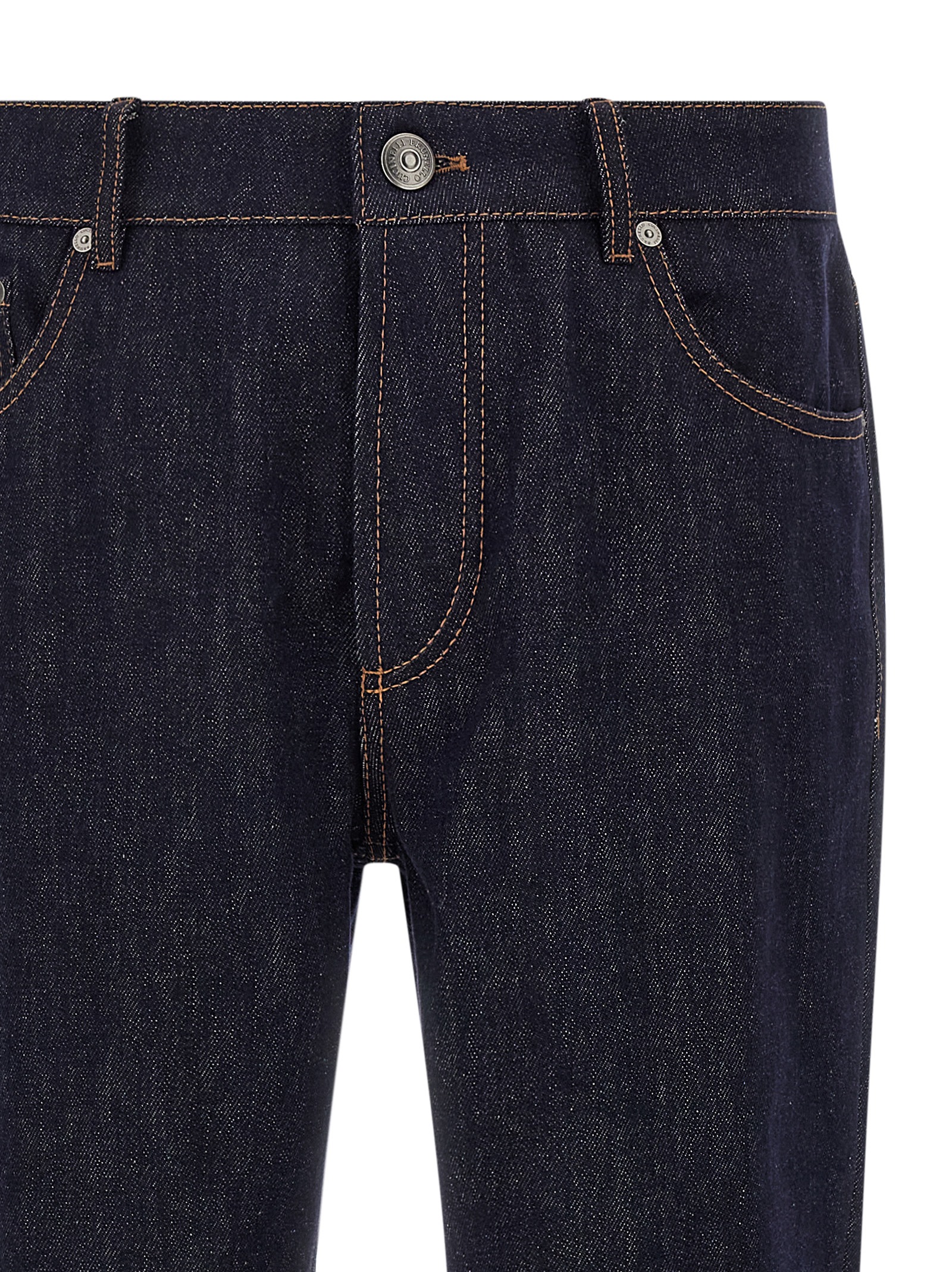 Cotton denim jeans, 5-pocket ‘iconic fit’ with medium waist and narrow leg, contrast embroidery and button closure.