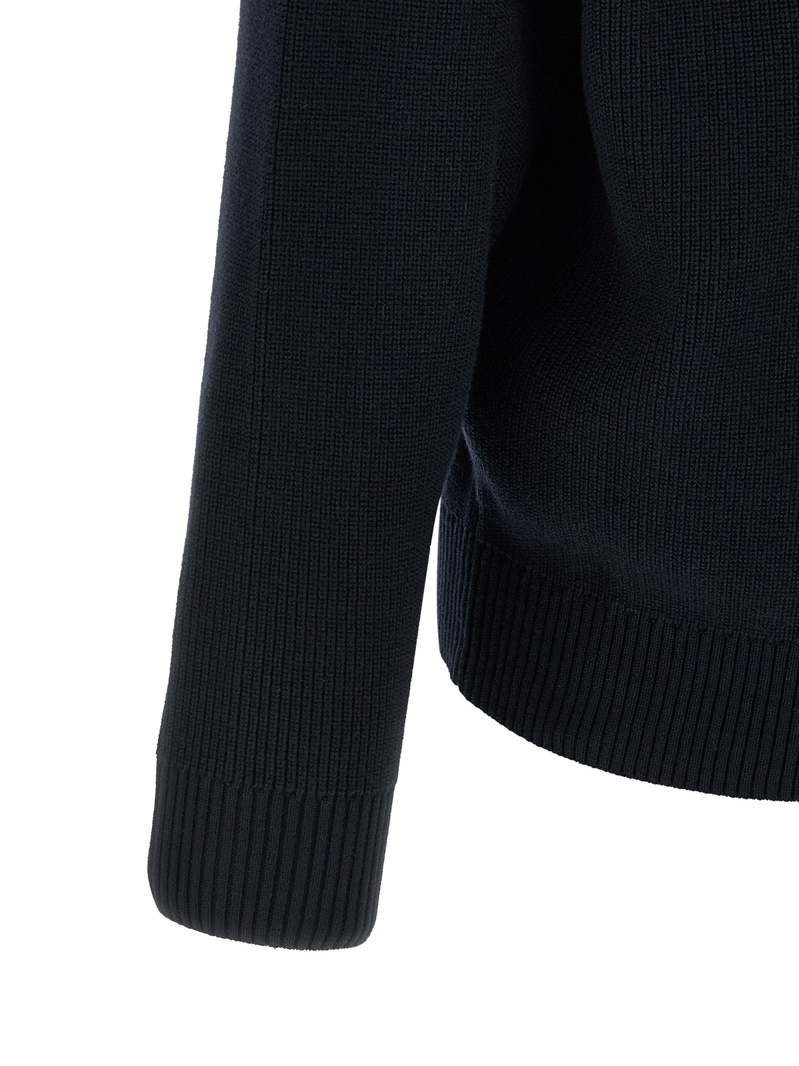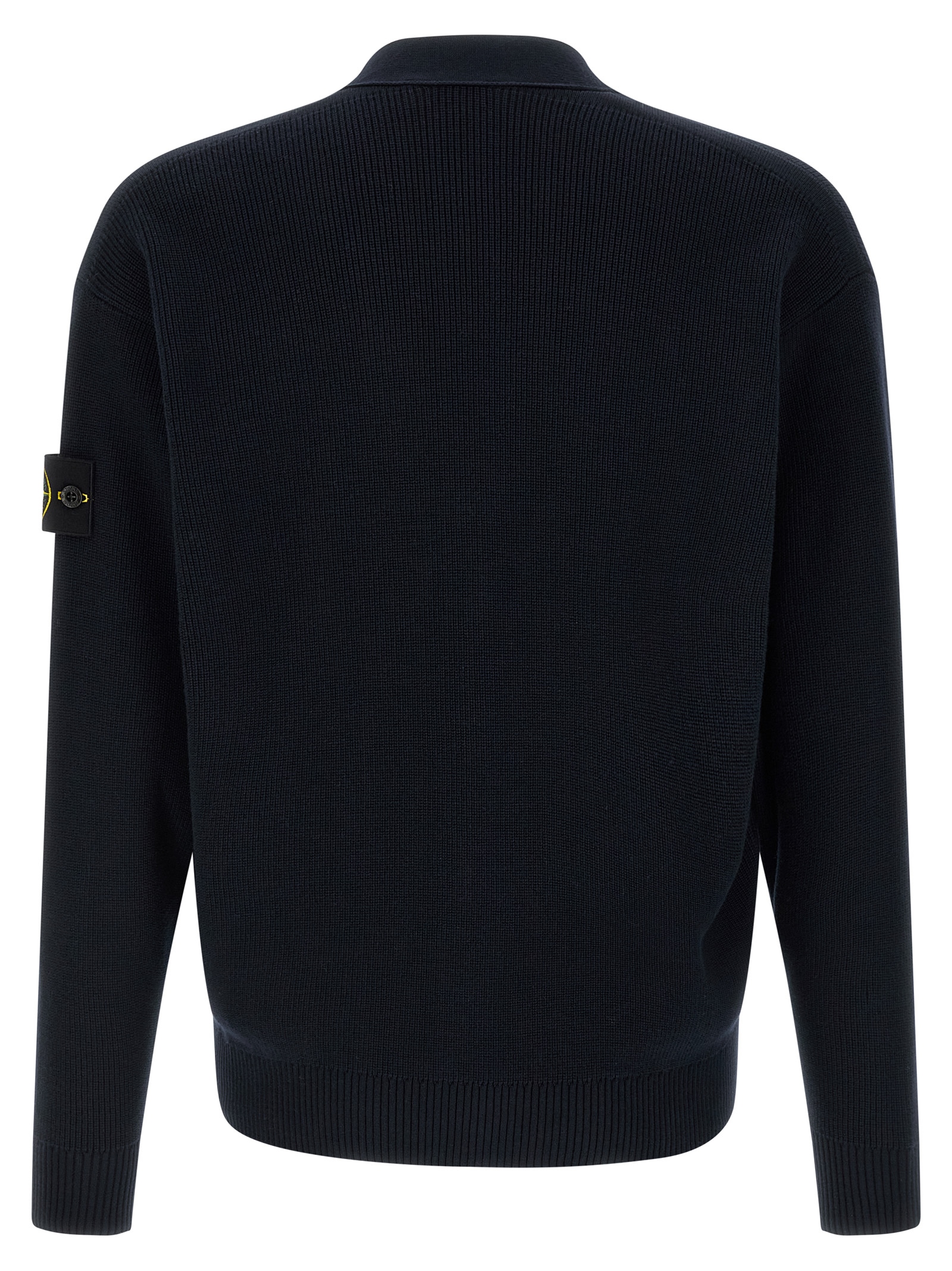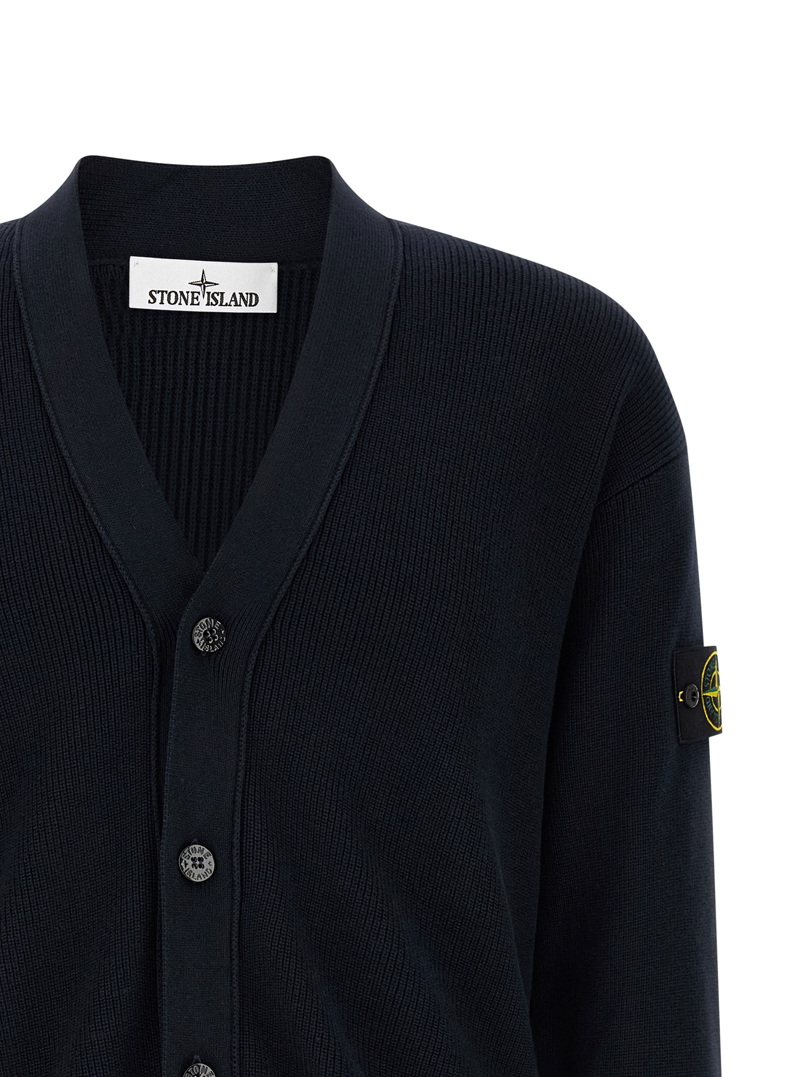 ‘5100009’ ribbed cotton cardigan with 12 fineness, V-neck, front button closure, long cuffed sleeves, dropped shoulders and logo badge, band on the hem.