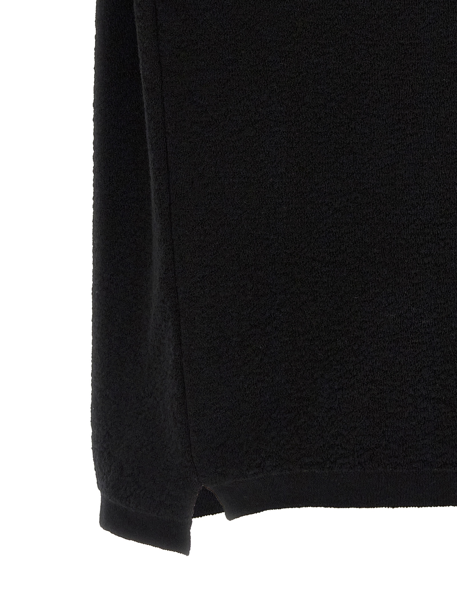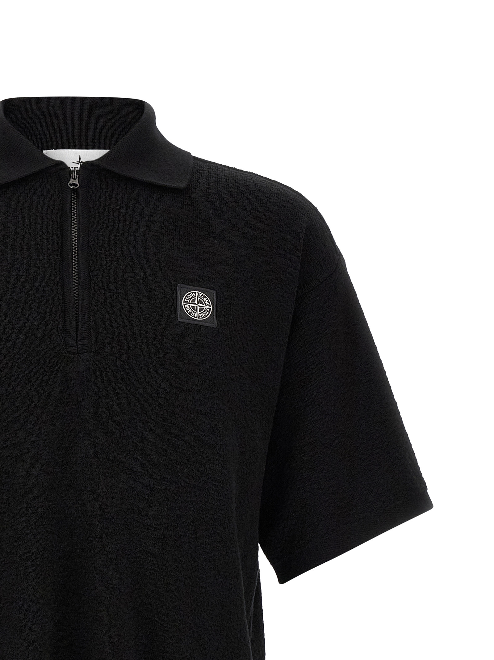 ‘5100021’ polo shirt in light raw cotton 12 fineness, front ‘Compass’ logo patch, collar and half zip, short sleeves with dropped shoulders, side slits, asymmetrical hem.
