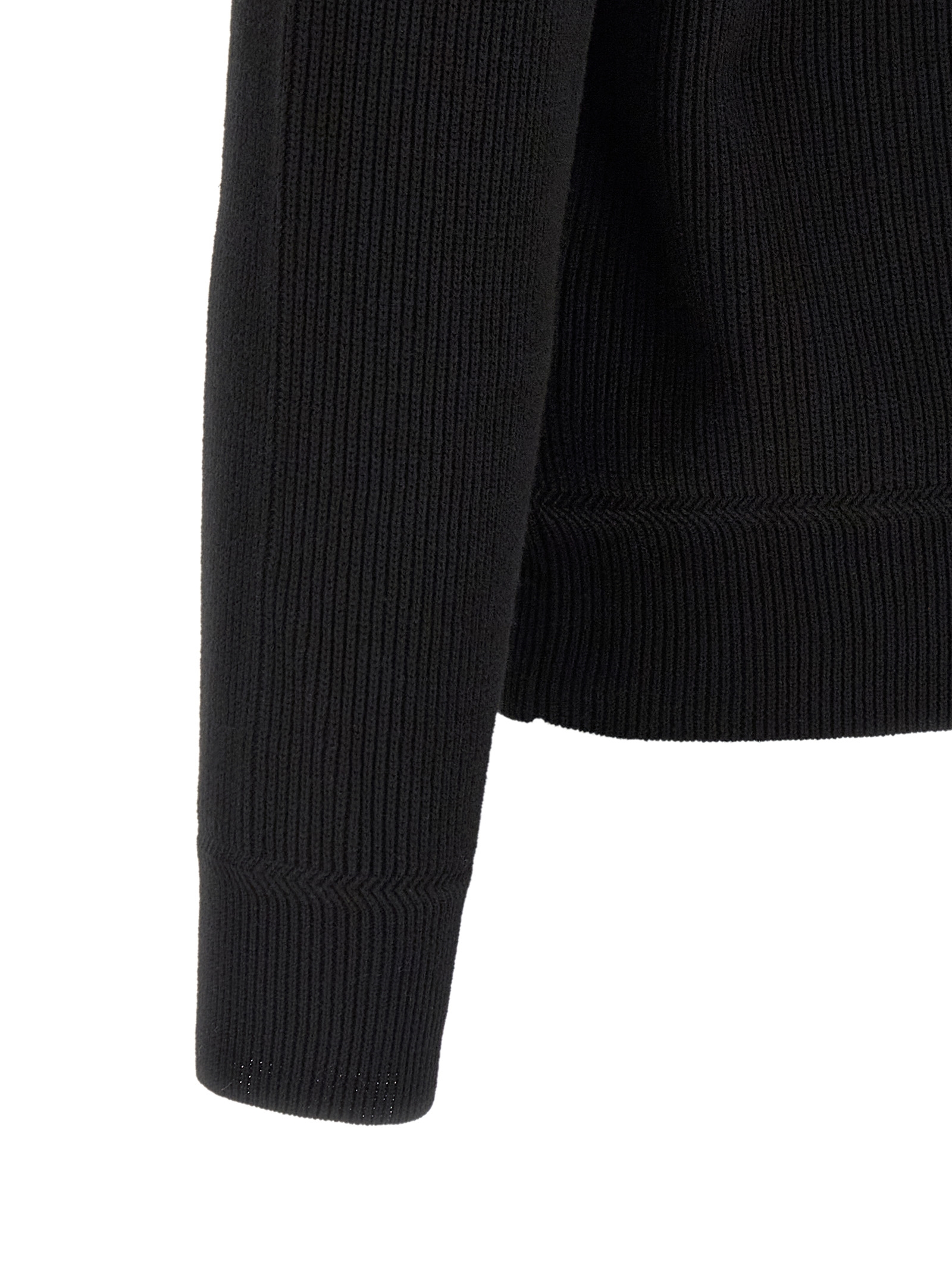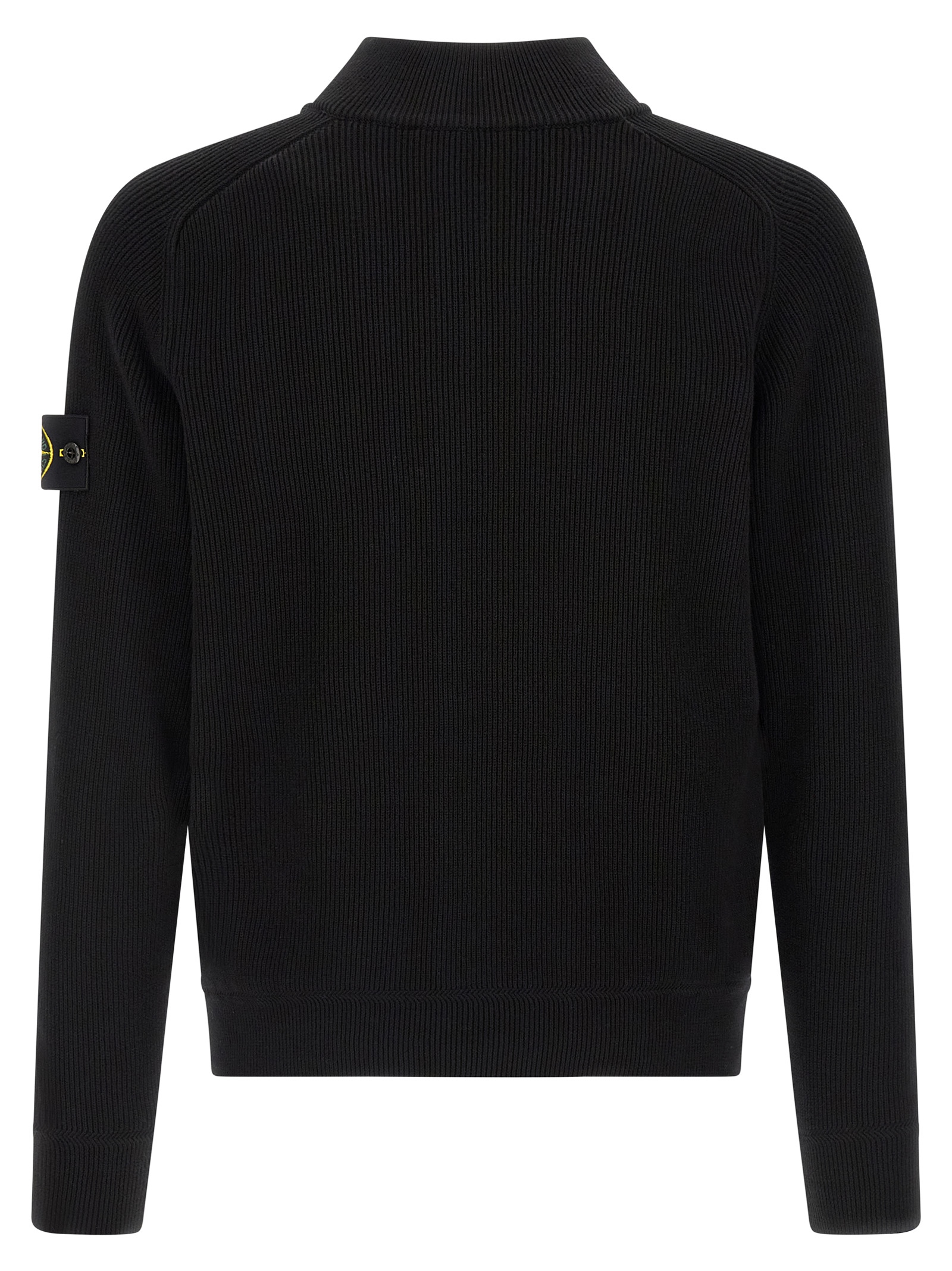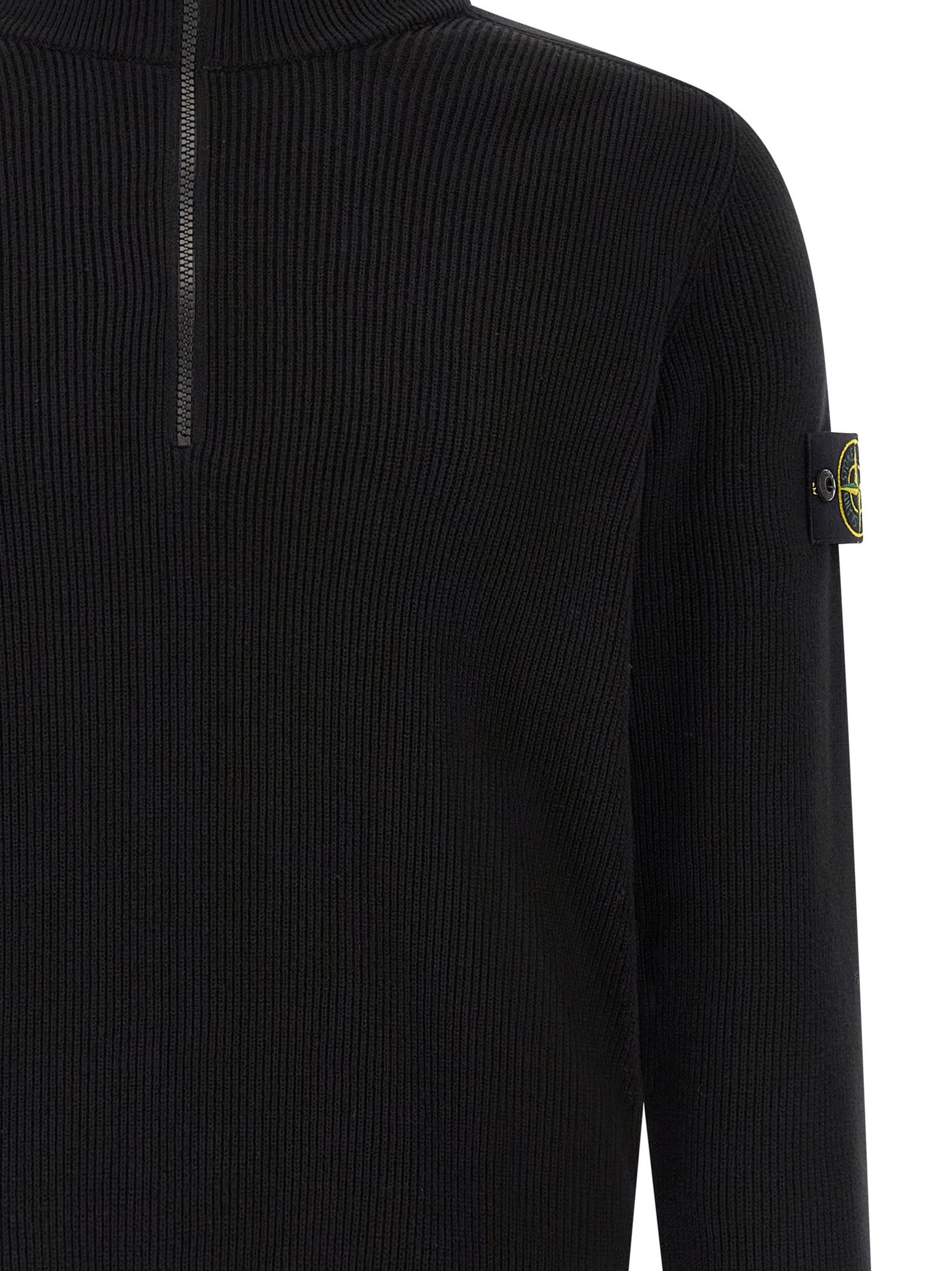 ‘5100124’ ribbed cotton sweater with 12 fineness, high neck, half zip, long raglan sleeves with cuffs and logo badge.
