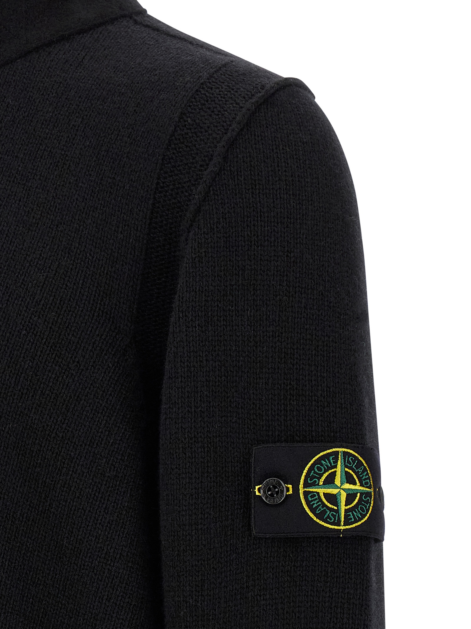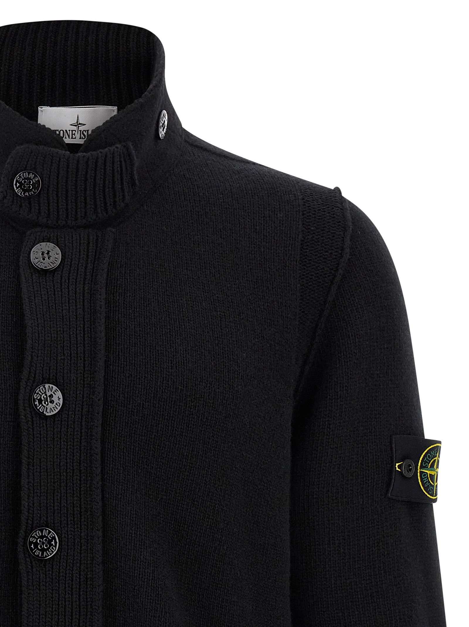 5 fineness wool cardigan 547A3 with felt details, front zip and button closure, high neck with removable chin strap, long cuffed sleeves and logo badge.