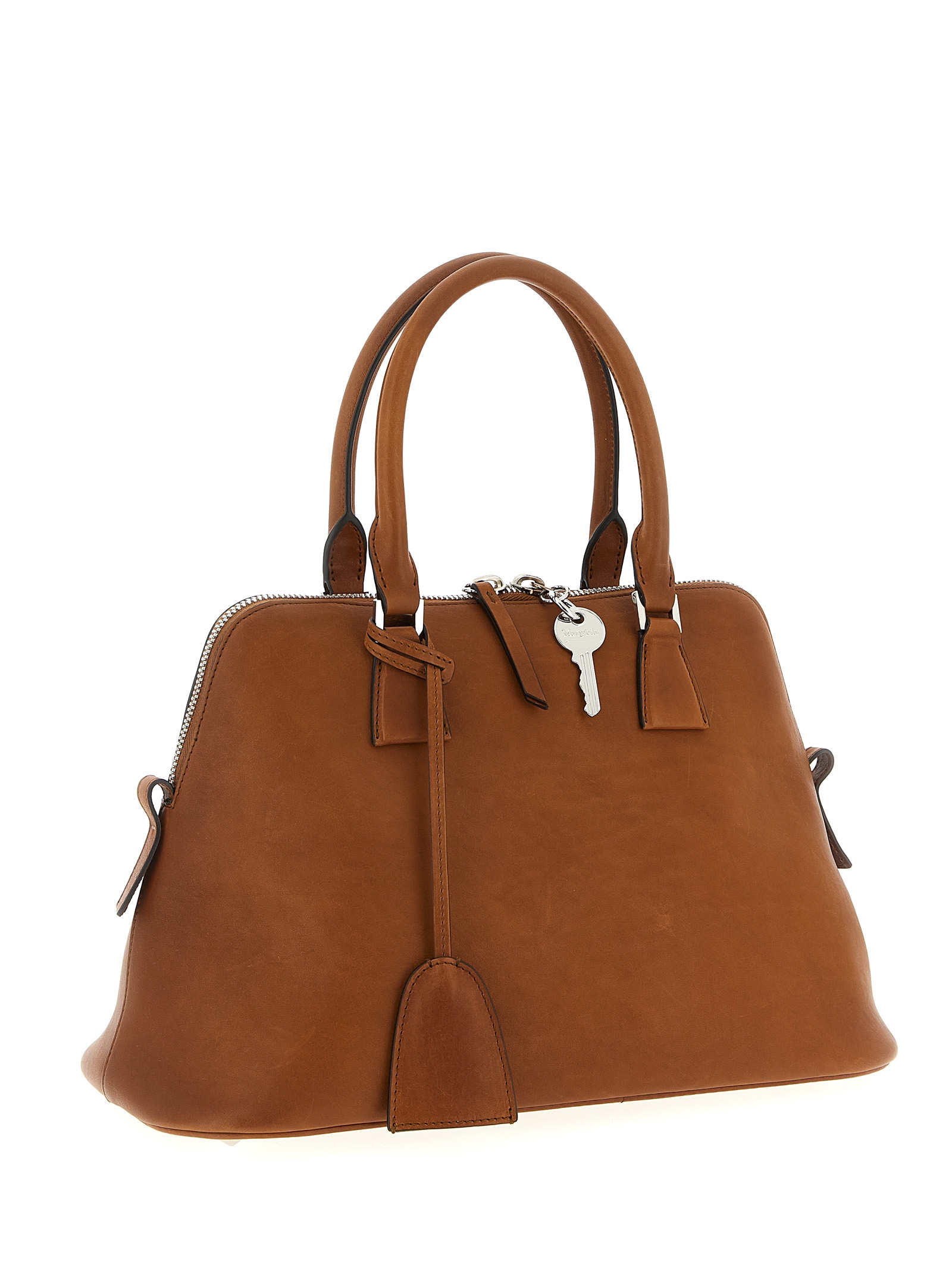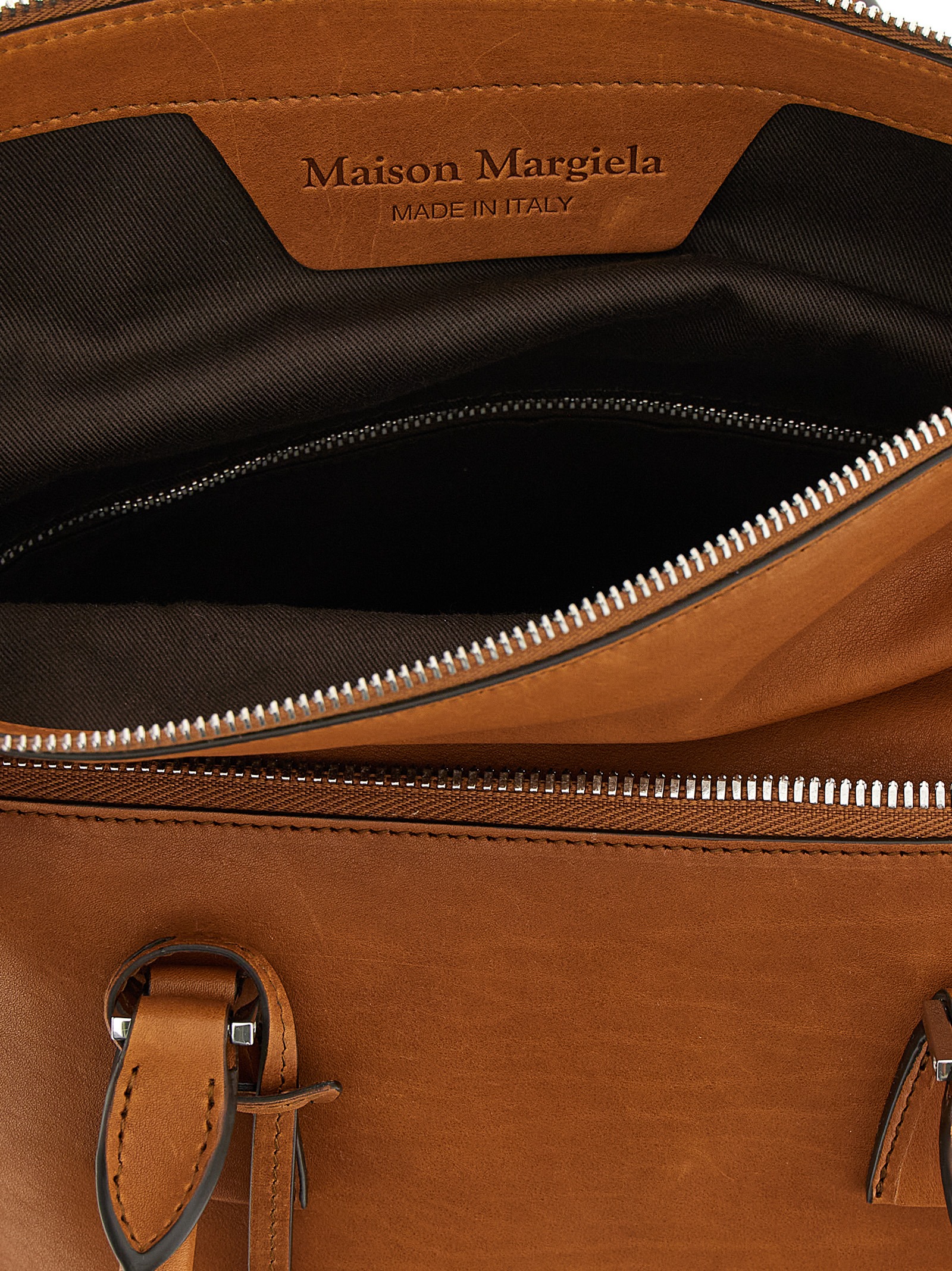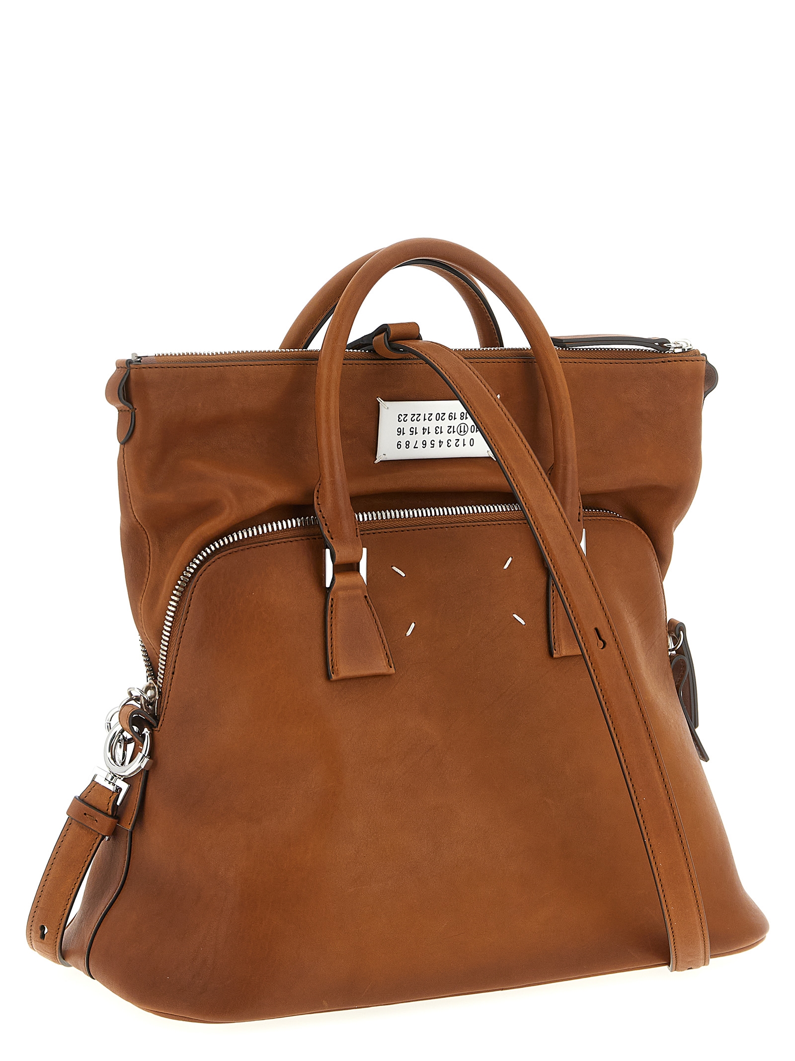 Medium waxed and hand-finished washed leather ‘5AC Loved to Death’ handbag, folded zip closure and contrast ‘Numeric signature MM6’ patch, double fixed handle, rigid base with metal feet, back ‘Four stitches’, removable keyring, shoulder strap Removable.