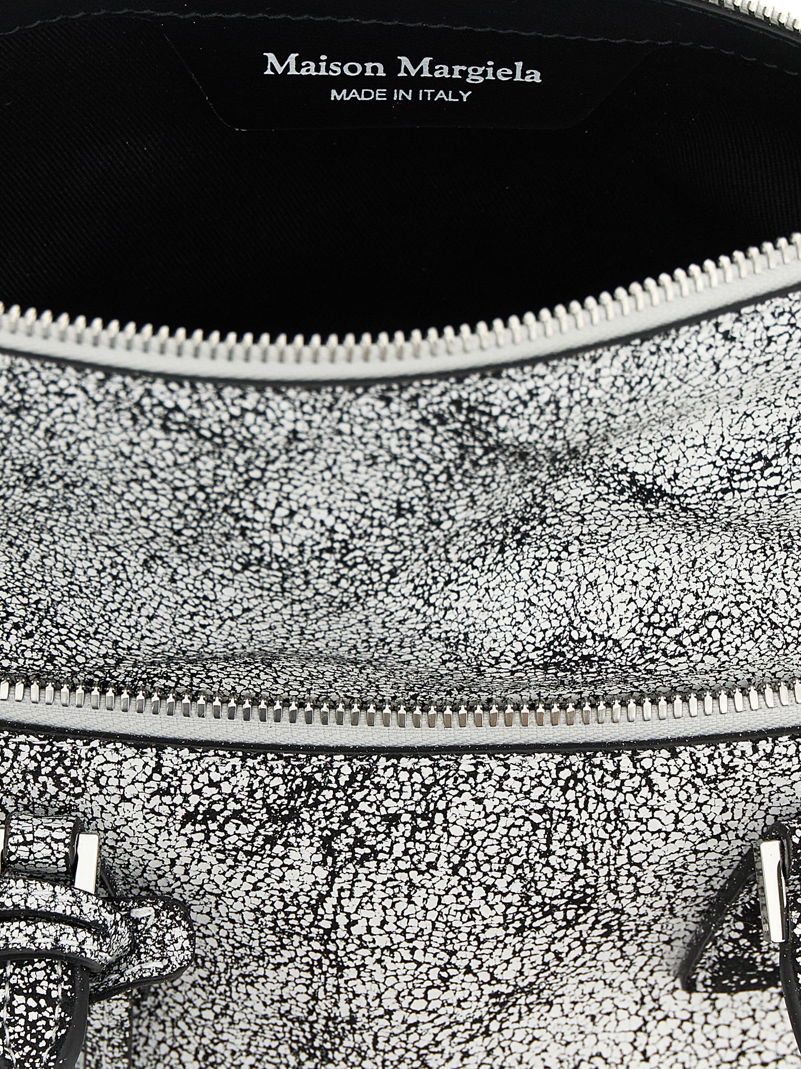 ‘5AC Loved to Death’ mini handbag in washed calf leather covered in craquelé paint, zip closure and leather ‘Numeric signature MM6’ patch, double fixed handle, front embossed logo pocket, rigid base with metal feet, removable keyring, removable shoulder strap.