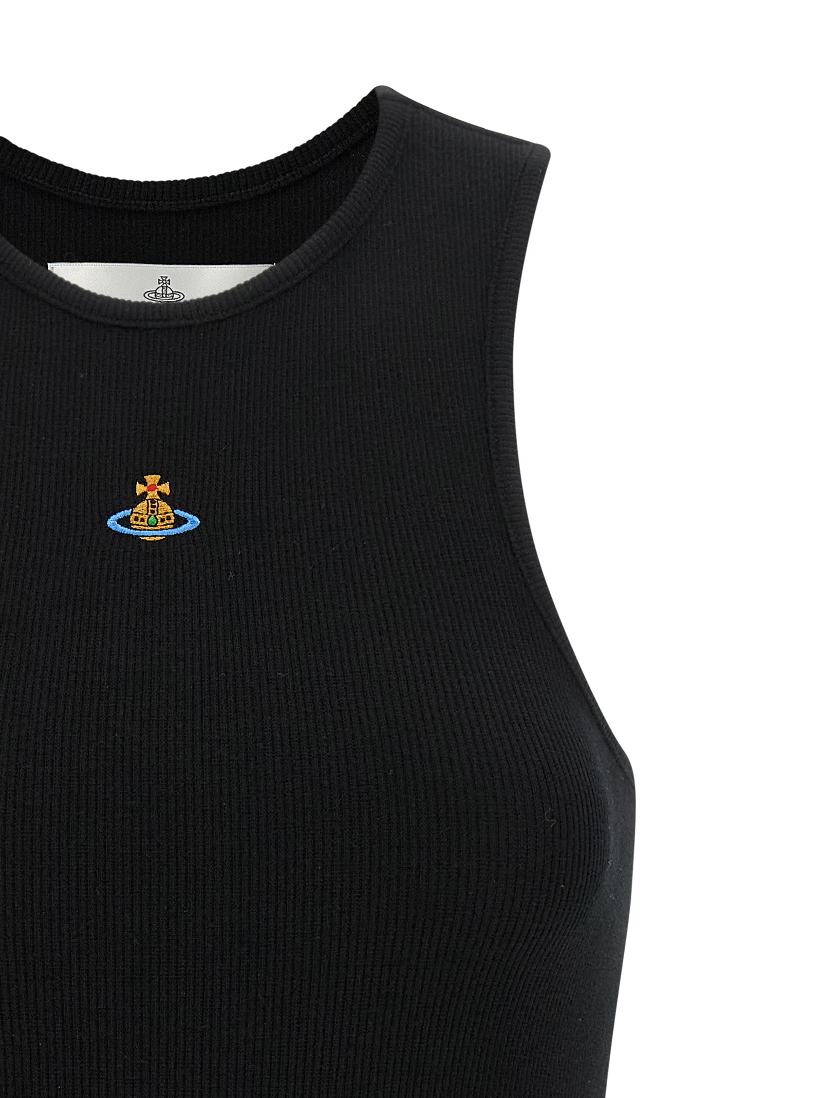 ’90’s’ ribbed cotton jersey top with ‘Orb’ logo embroidery at the front, rowing neckline.
