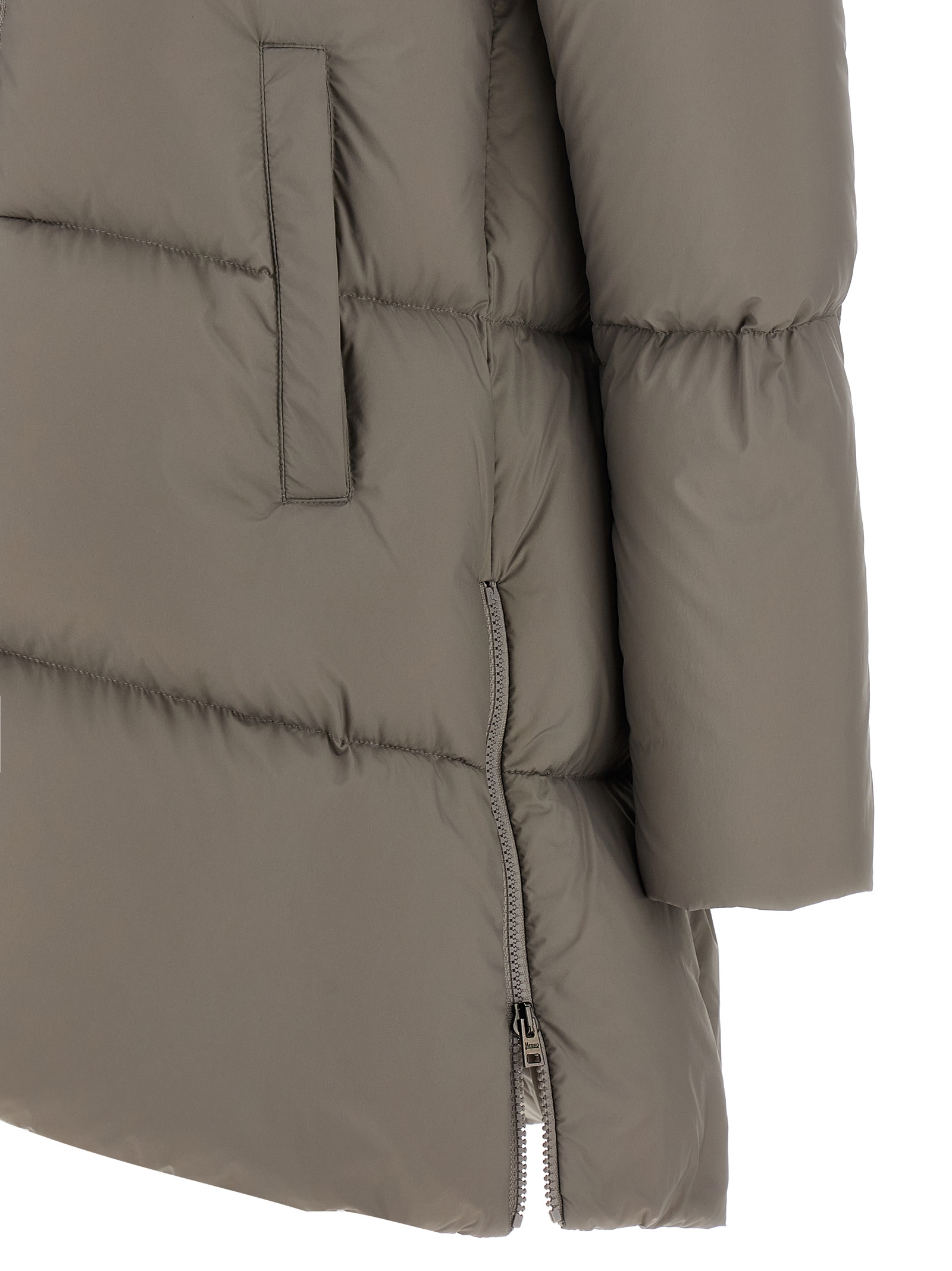 ‘A-Shape’ quilted nylon down jacket with goose down padding, double layer high neck, front zip closure, pockets, long sleeves, side zip slits.