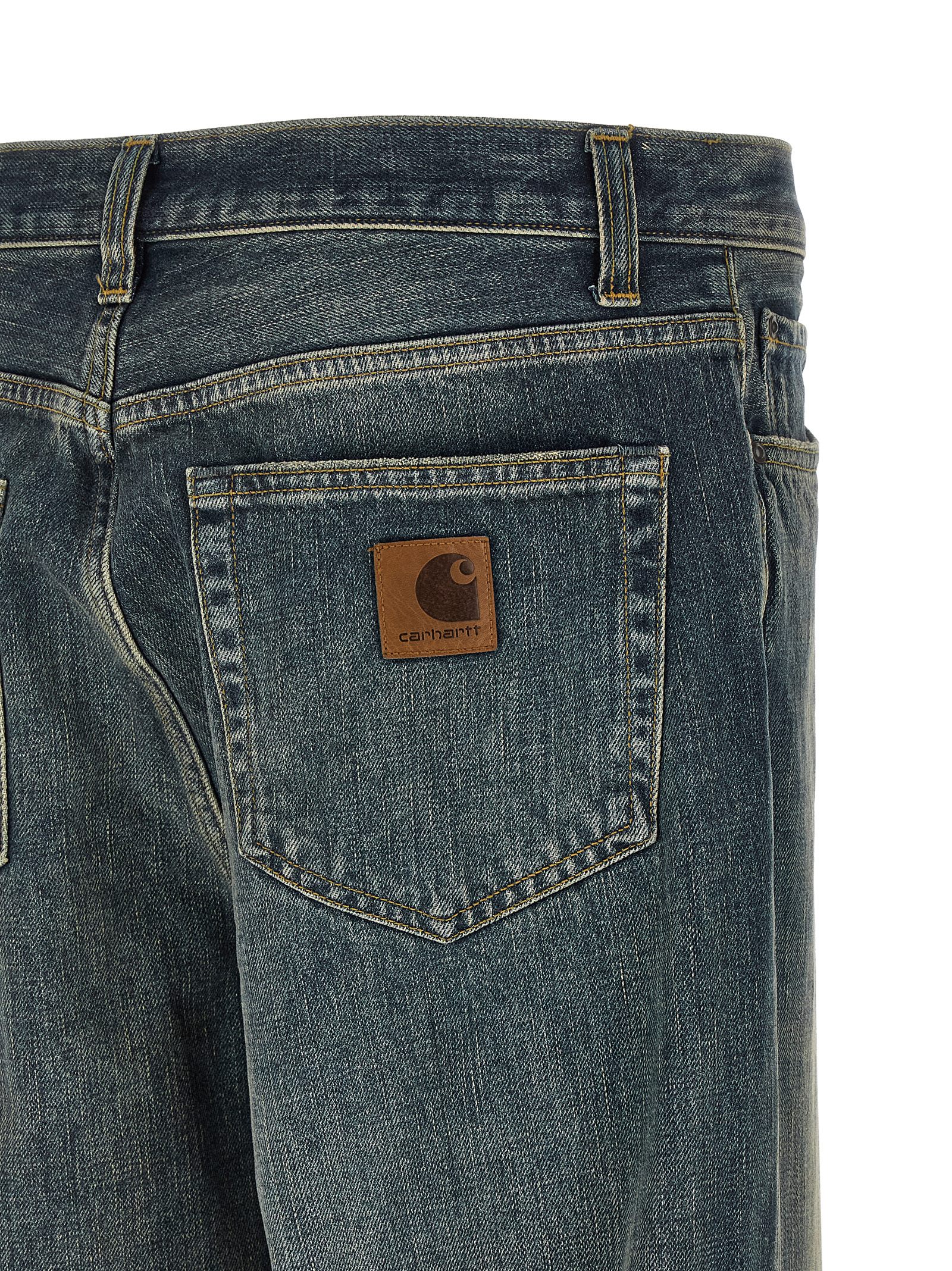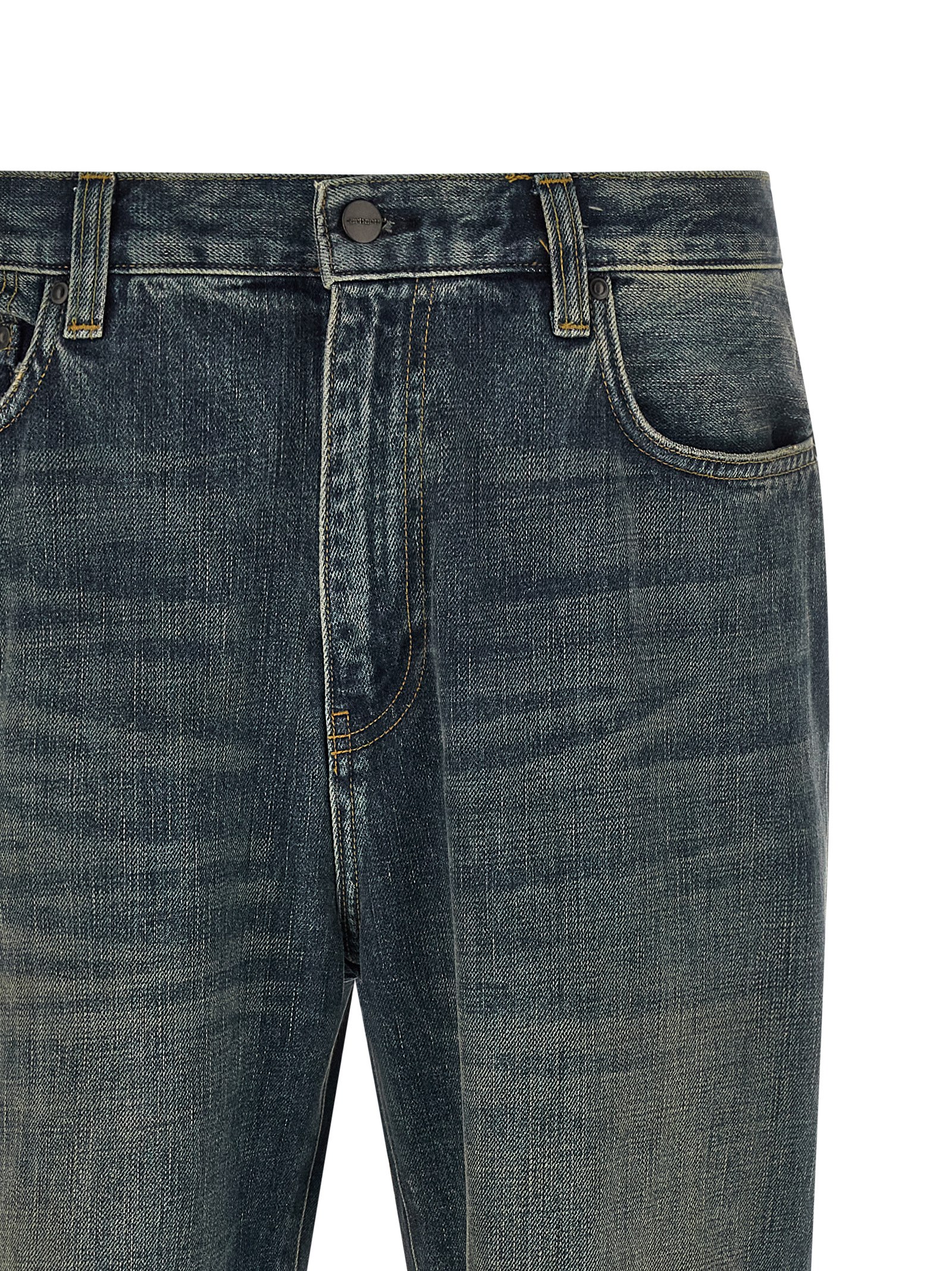 ‘Aaron pants’ used-effect wash cotton denim jeans, front zip and button closure, 5 pockets, leather logo patch at the back.