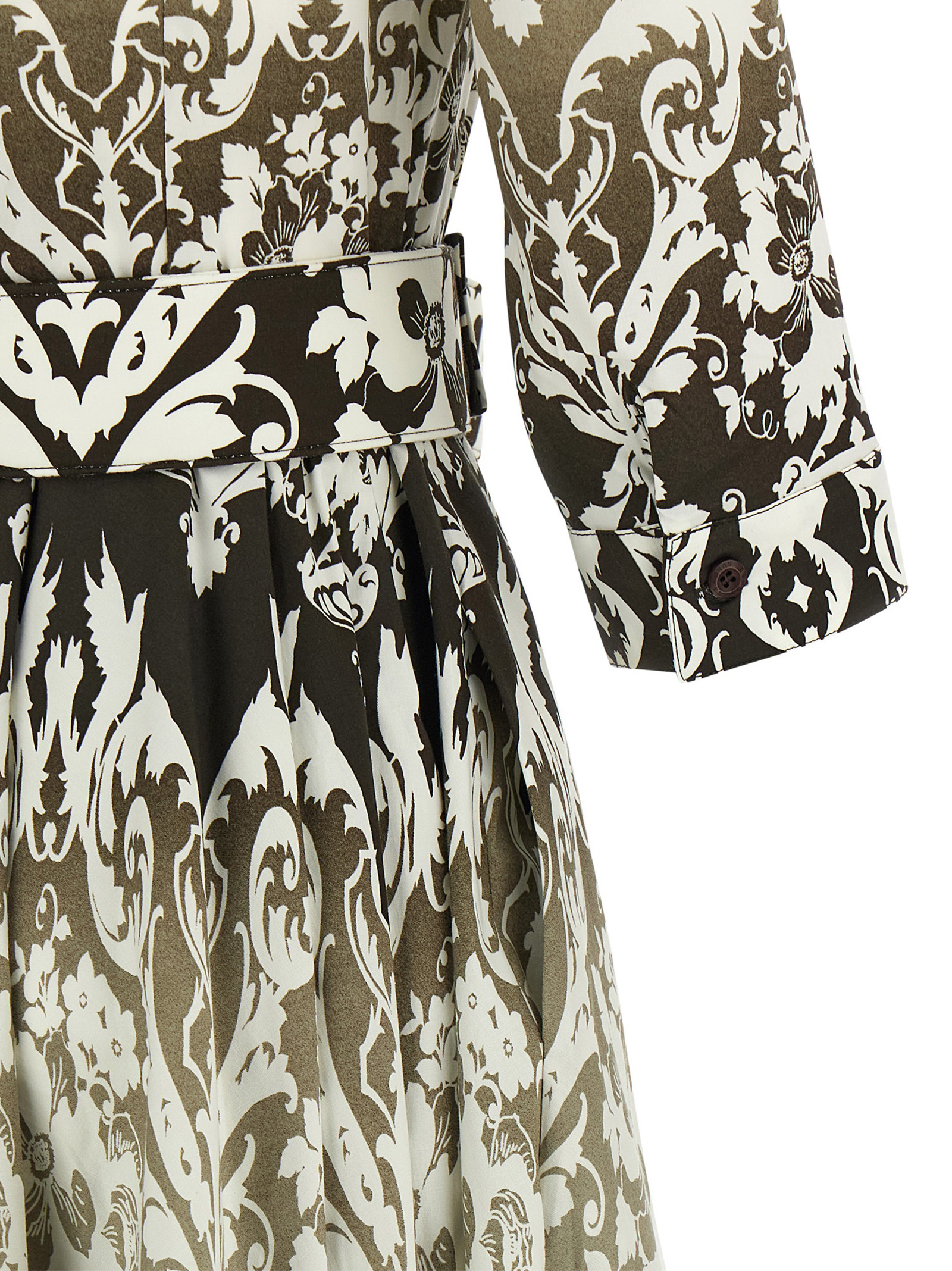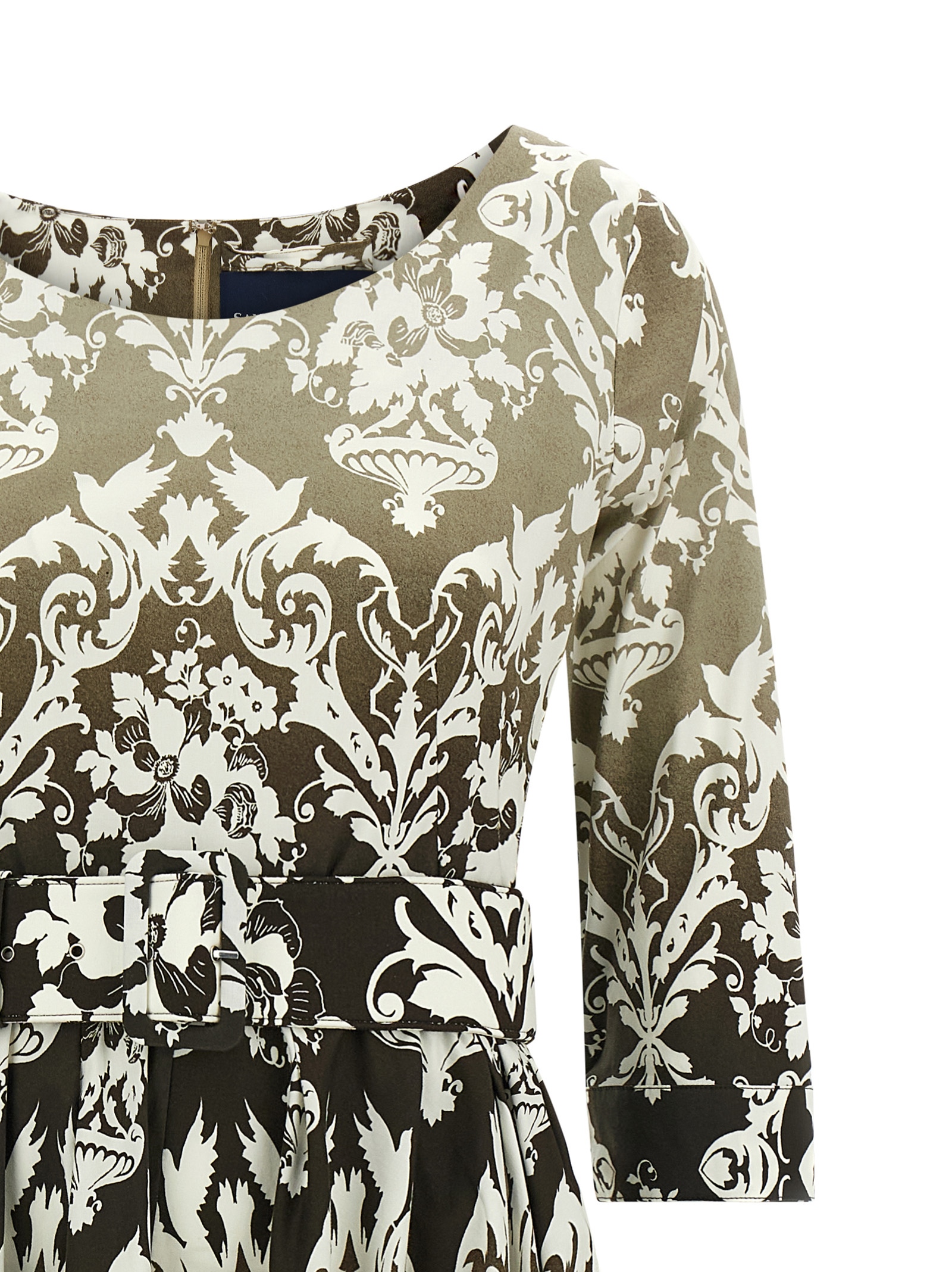 Abelia’ all-over print cotton muslin midi dress, round neckline, back zip closure, 3/4 sleeves, full skirt, removable matching pockets, belt and sash.