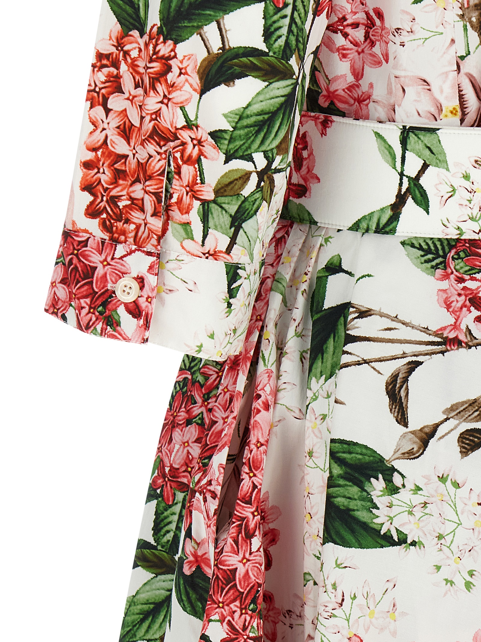 All over ‘Liliac Heaven Abelia’ cotton muslin midi dress with front button closure, 3/4 sleeves, full skirt, removable matching belt and sash detail.