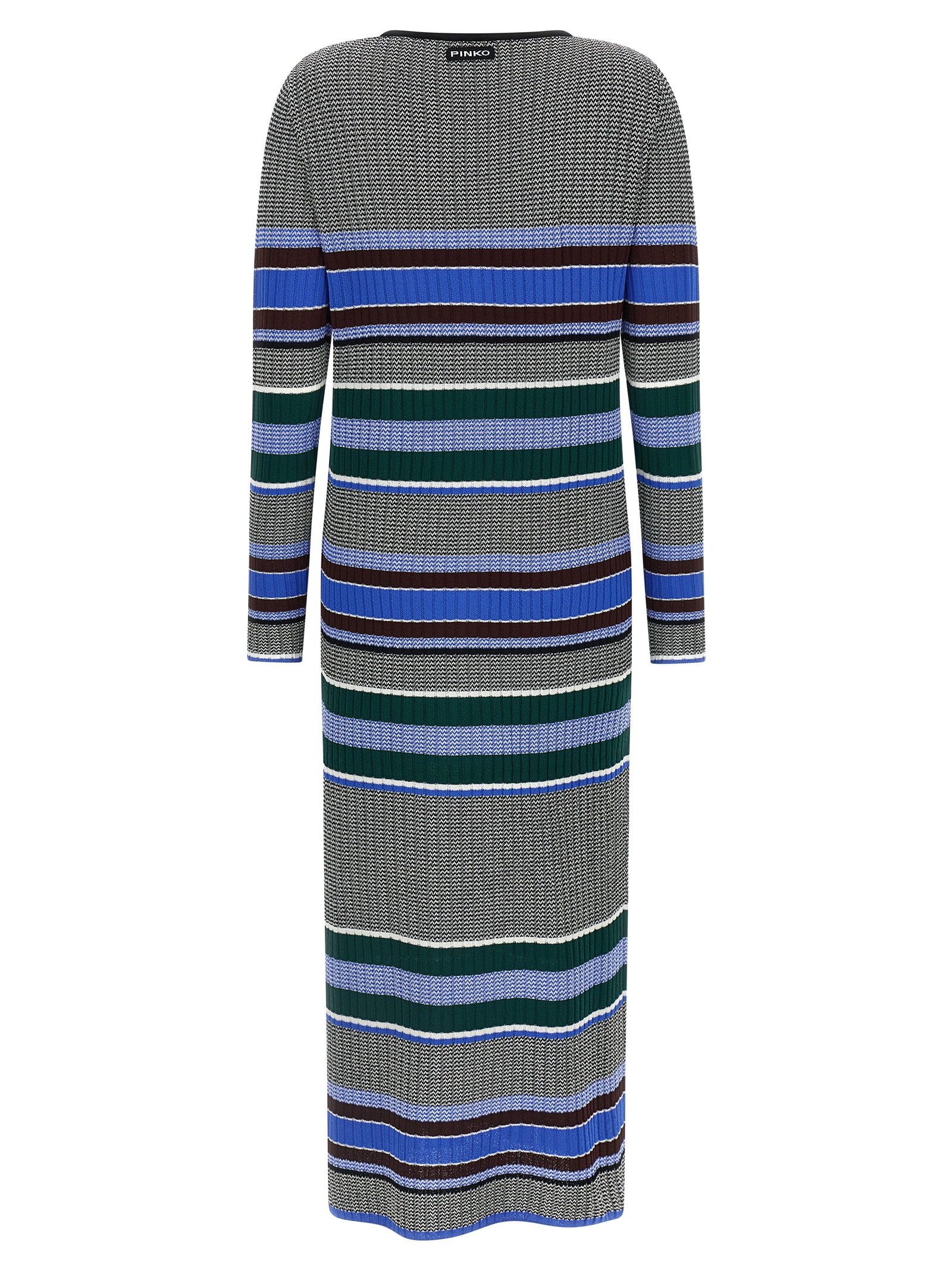 Long ‘Bruma’ dress in ribbed viscose knit with multicolor horizontal stripes of different thickness, wide V-neck and front button closure, long sleeves, side split.