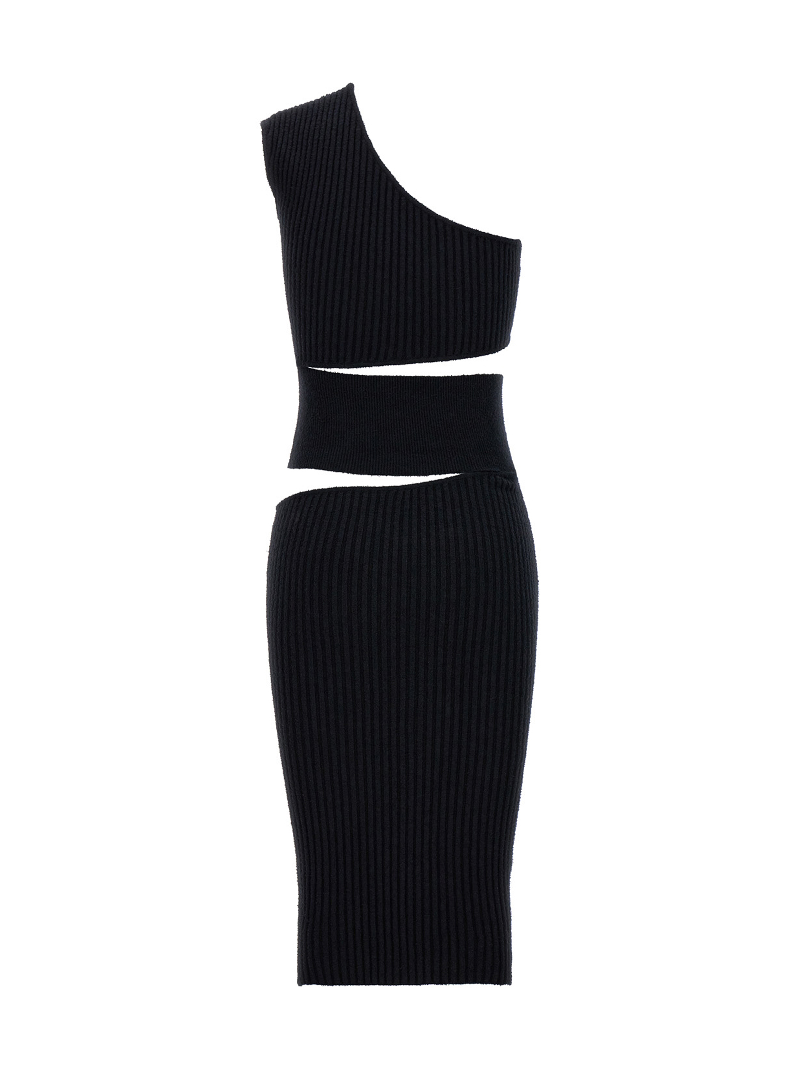 Abito ‘Micro Bouclè’ in misto cotone a coste con stampa logo, modello monospalla con dettagli cut out.