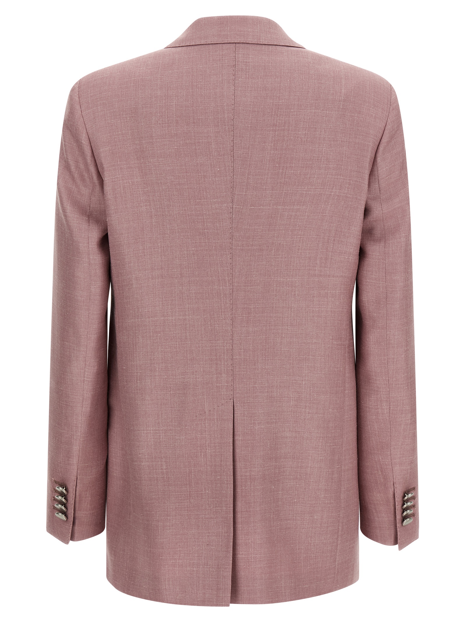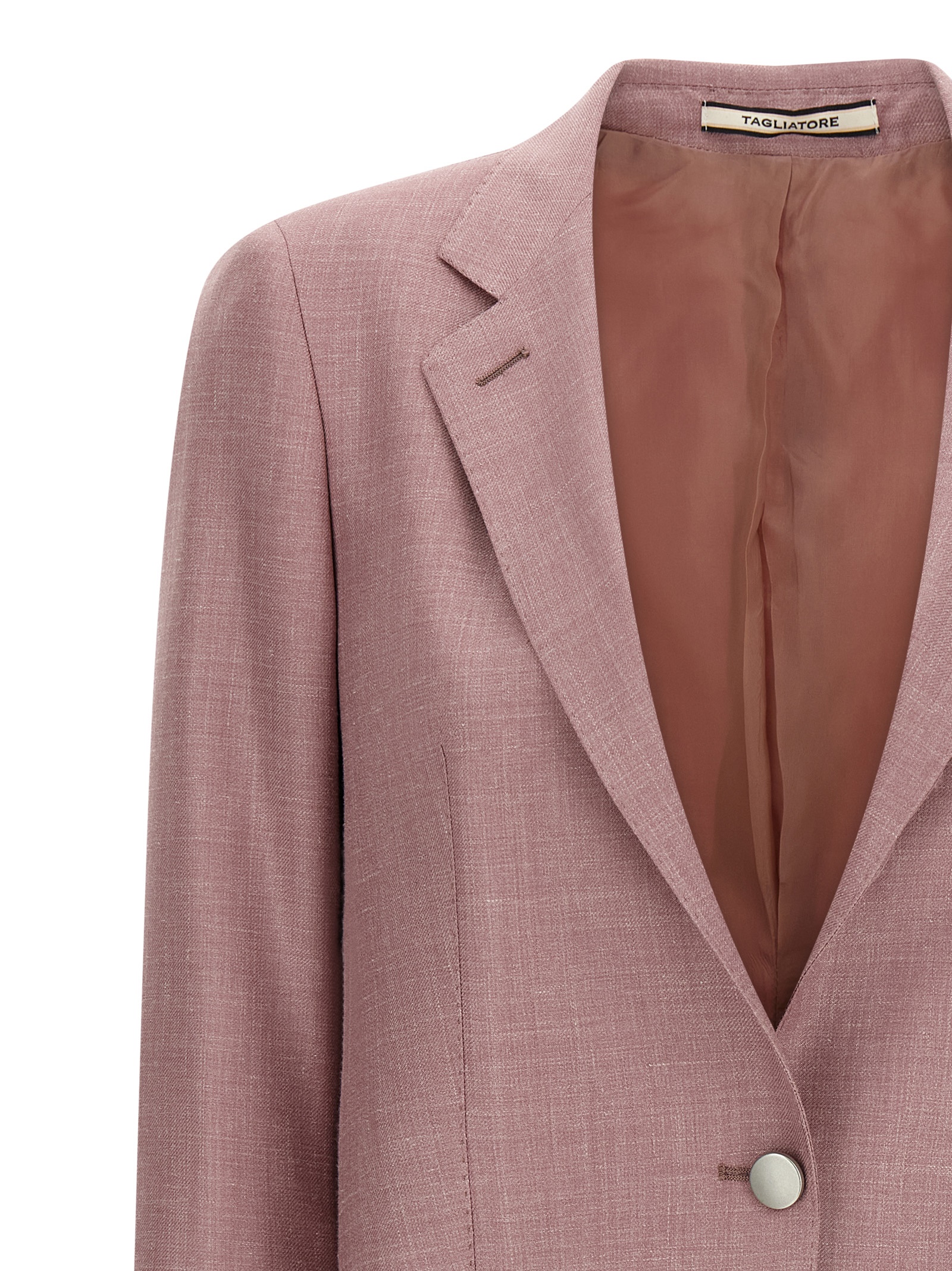‘Adrianne’ single-breasted blazer in wool, silk and linen blend with front metal button closure, mirror lapels, breast pocket, patch pockets, structured shoulder straps, long sleeves, back split, cupro lining.