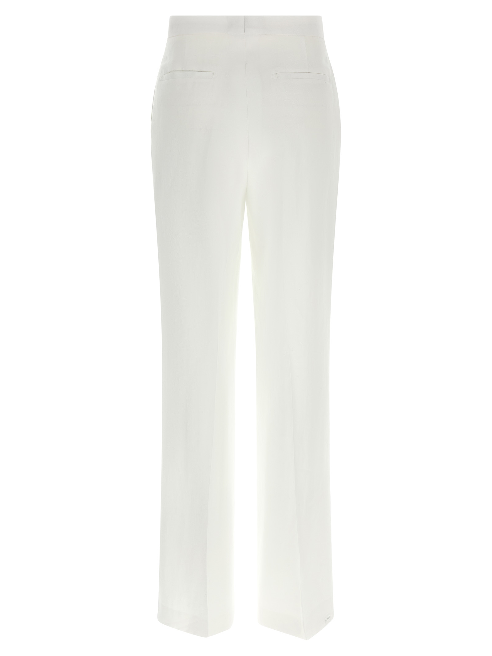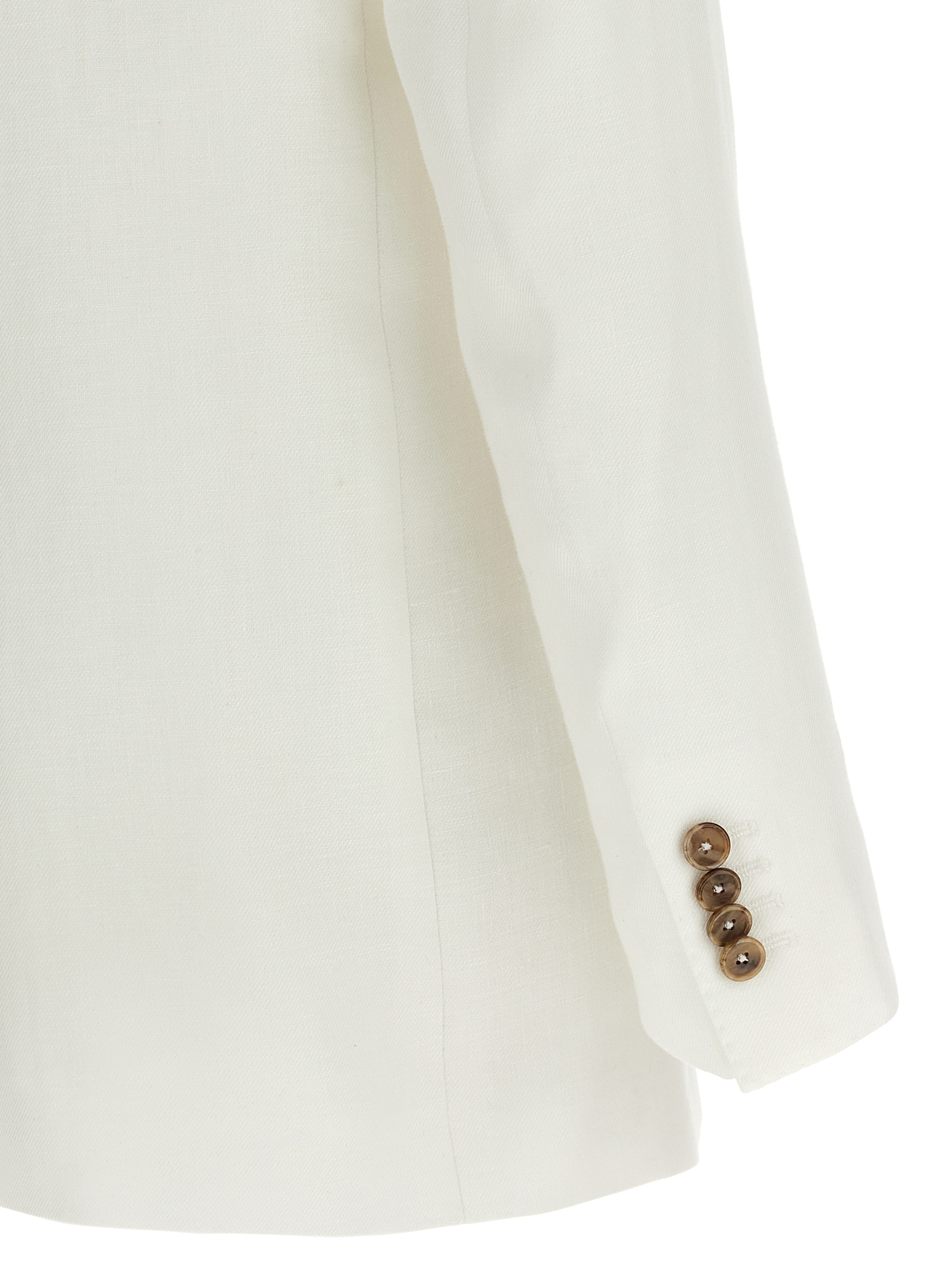 ‘Adrianne’ linen dress consisting of single-breasted blazer with front horn button closure, mirror lapels, breast pocket, flap pockets, back split, cupro lining and trousers with stretched pleat, wide and straight leg, front French pockets, back welt pockets, zip and front hook closure, cupro blend lining.