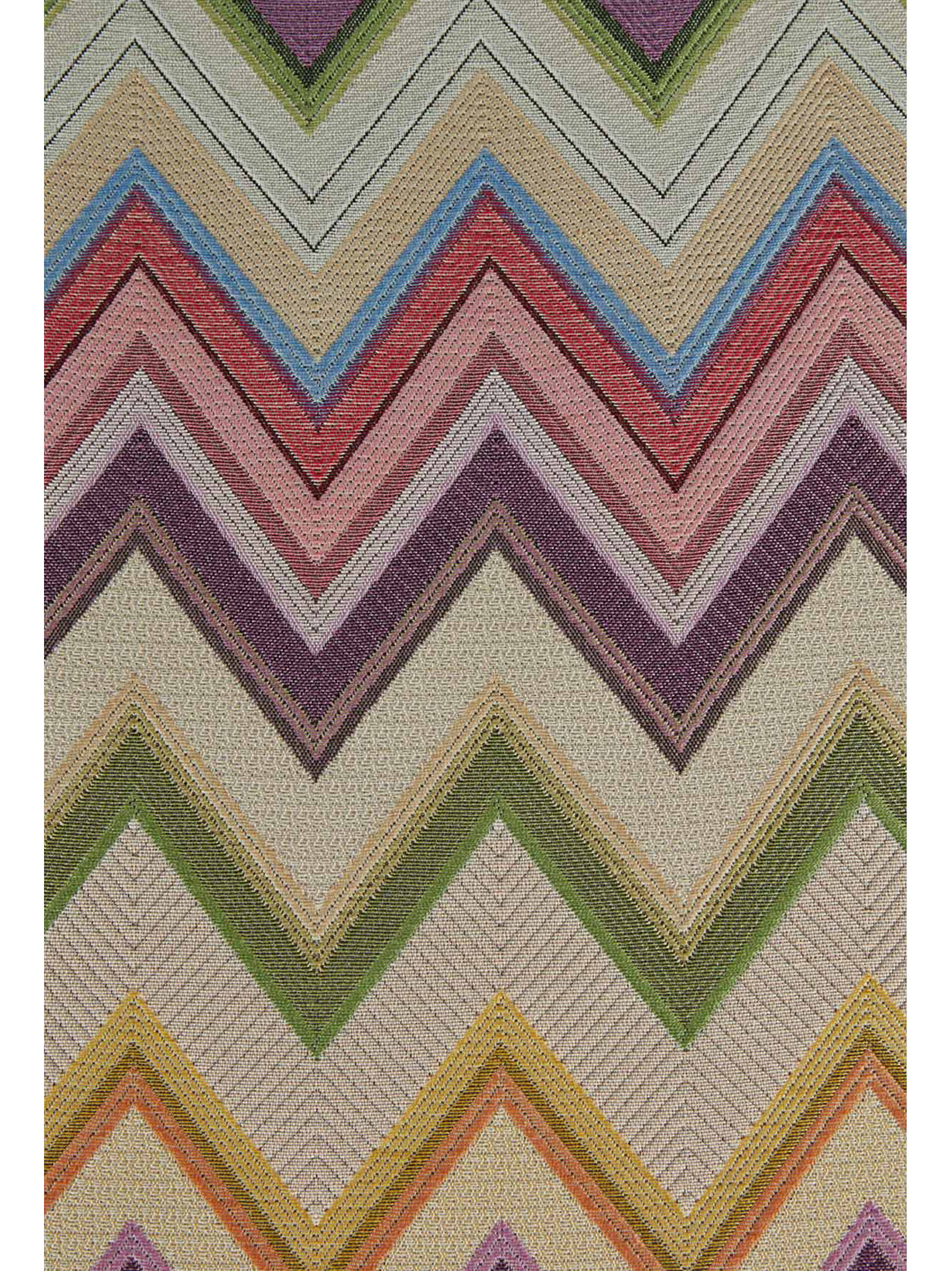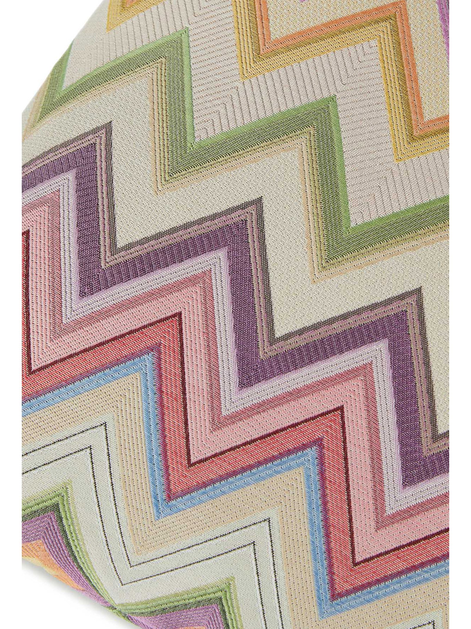 It stands out for a surface that is rather textural to the touch, enriched by the iconic maxi-chevron by which MissoniHome interprets the Agadir cylinder in a palette of delicate, almost subdued tones The cover in a cotton-blend jacquard fabric, with a zig-zag pattern in pastel shades and a suede handle is removable.