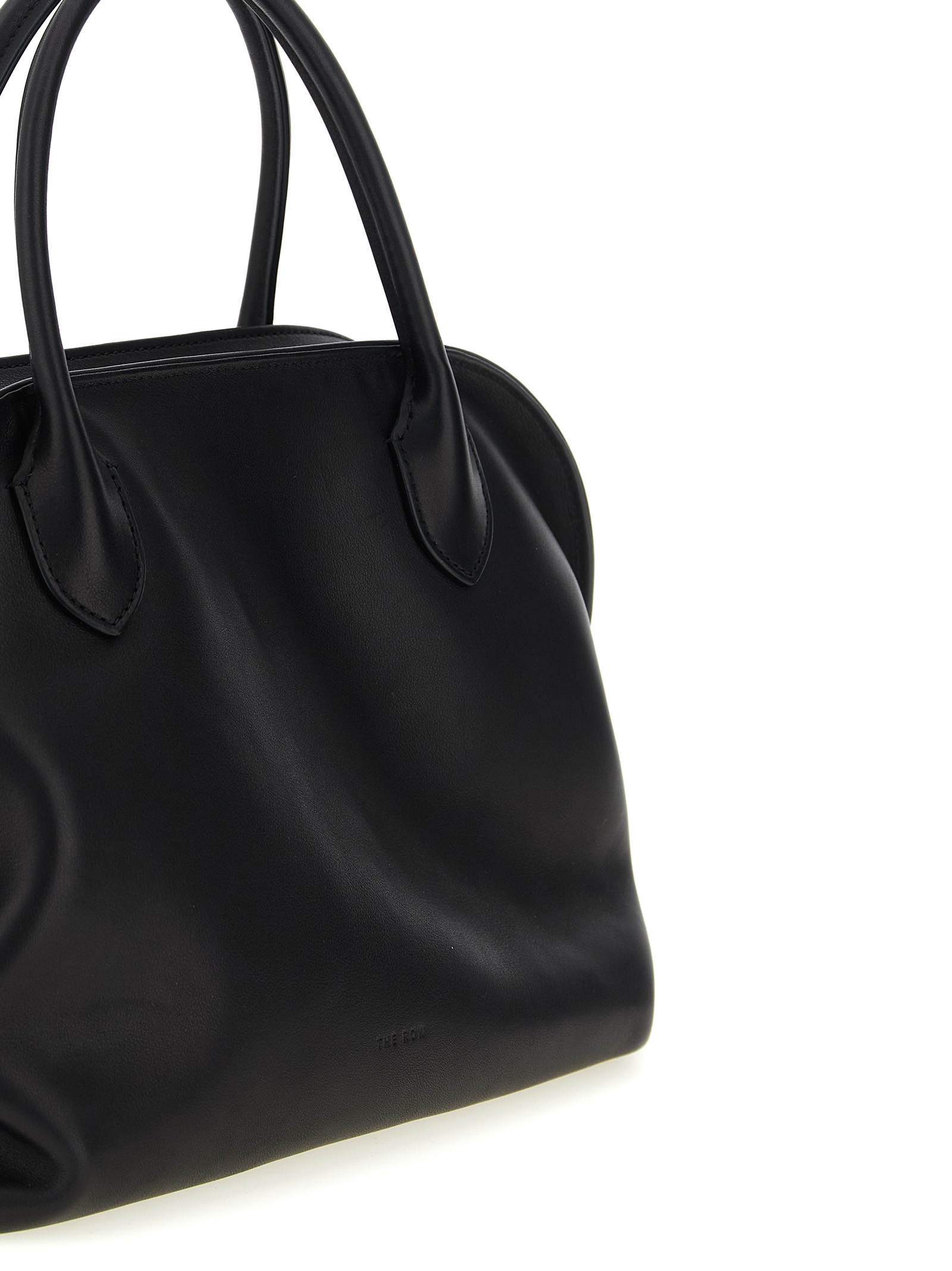 ‘Agnes’ leather handbag with front embossed logo, side draping, double fixed handle, top zip closure, rigid base.