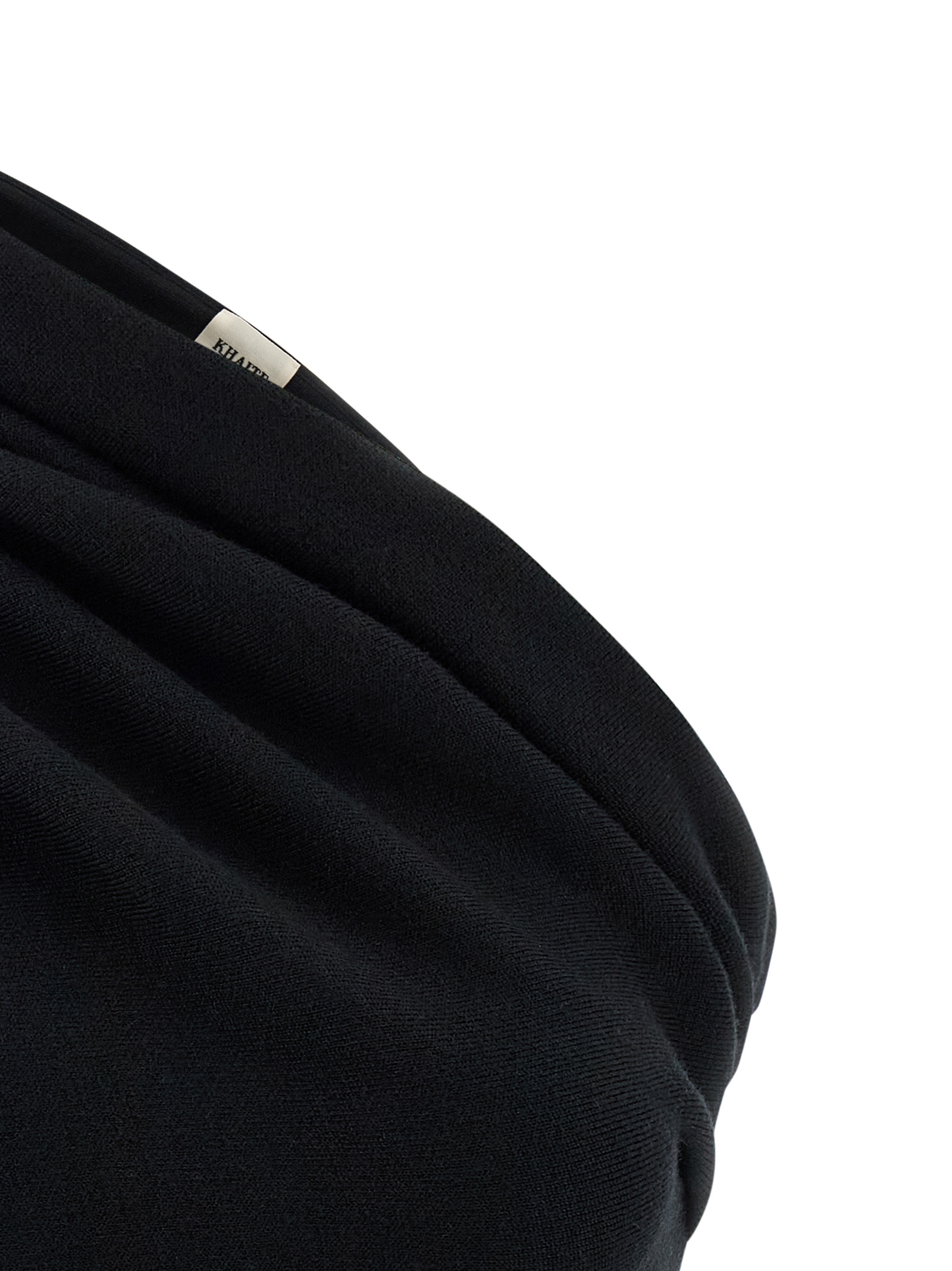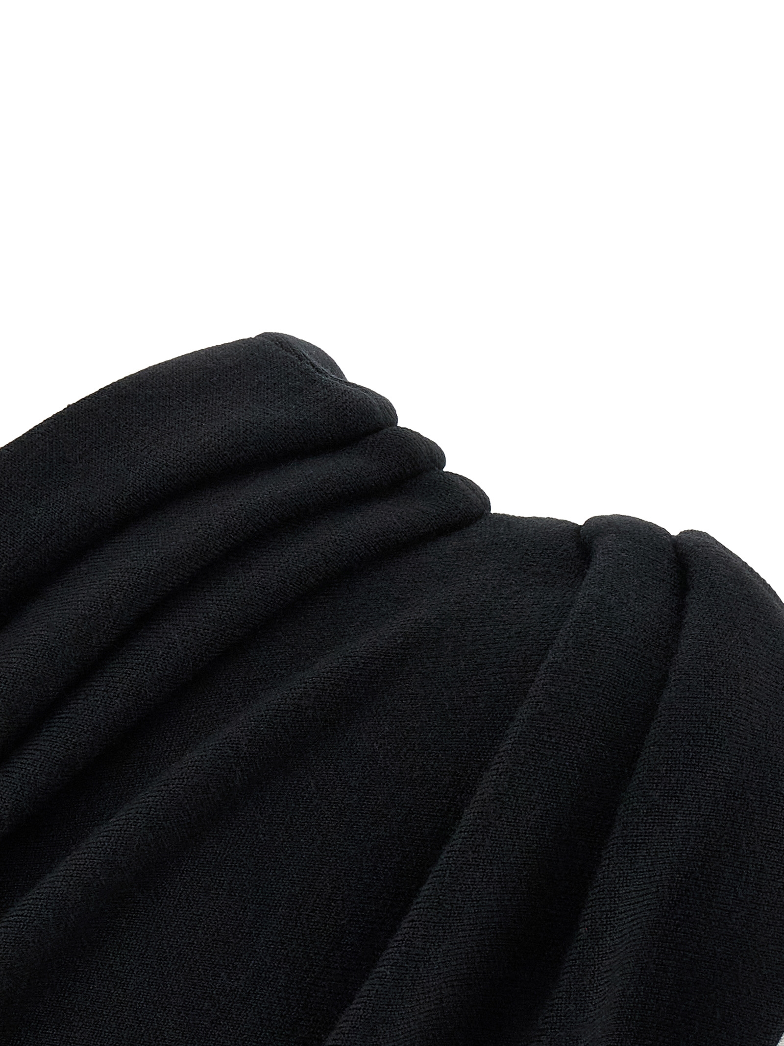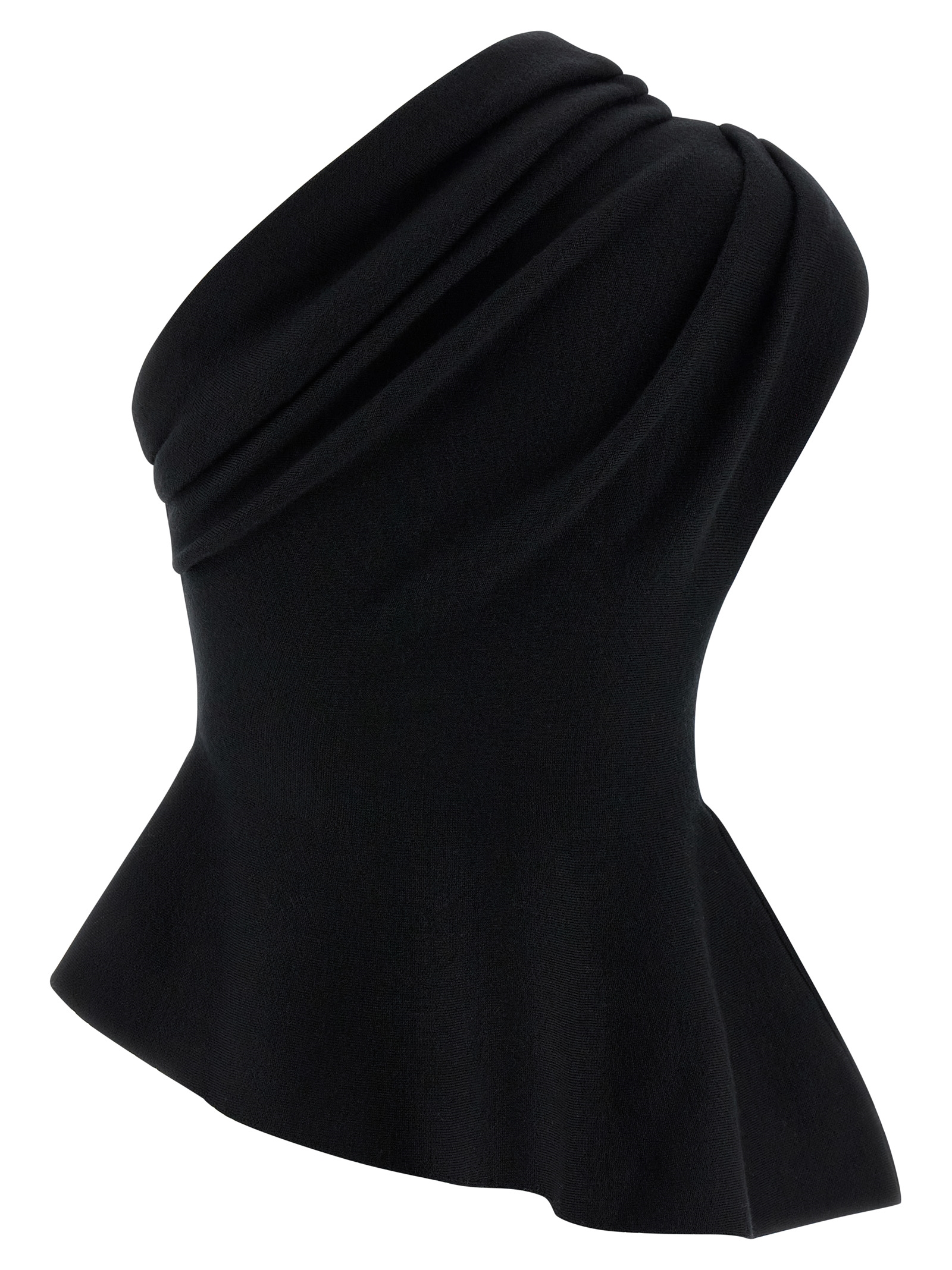‘Aimee’ tubular knit top in compact Merino wool, one-shoulder model with curls on the shoulder and asymmetrical hem with peplum.