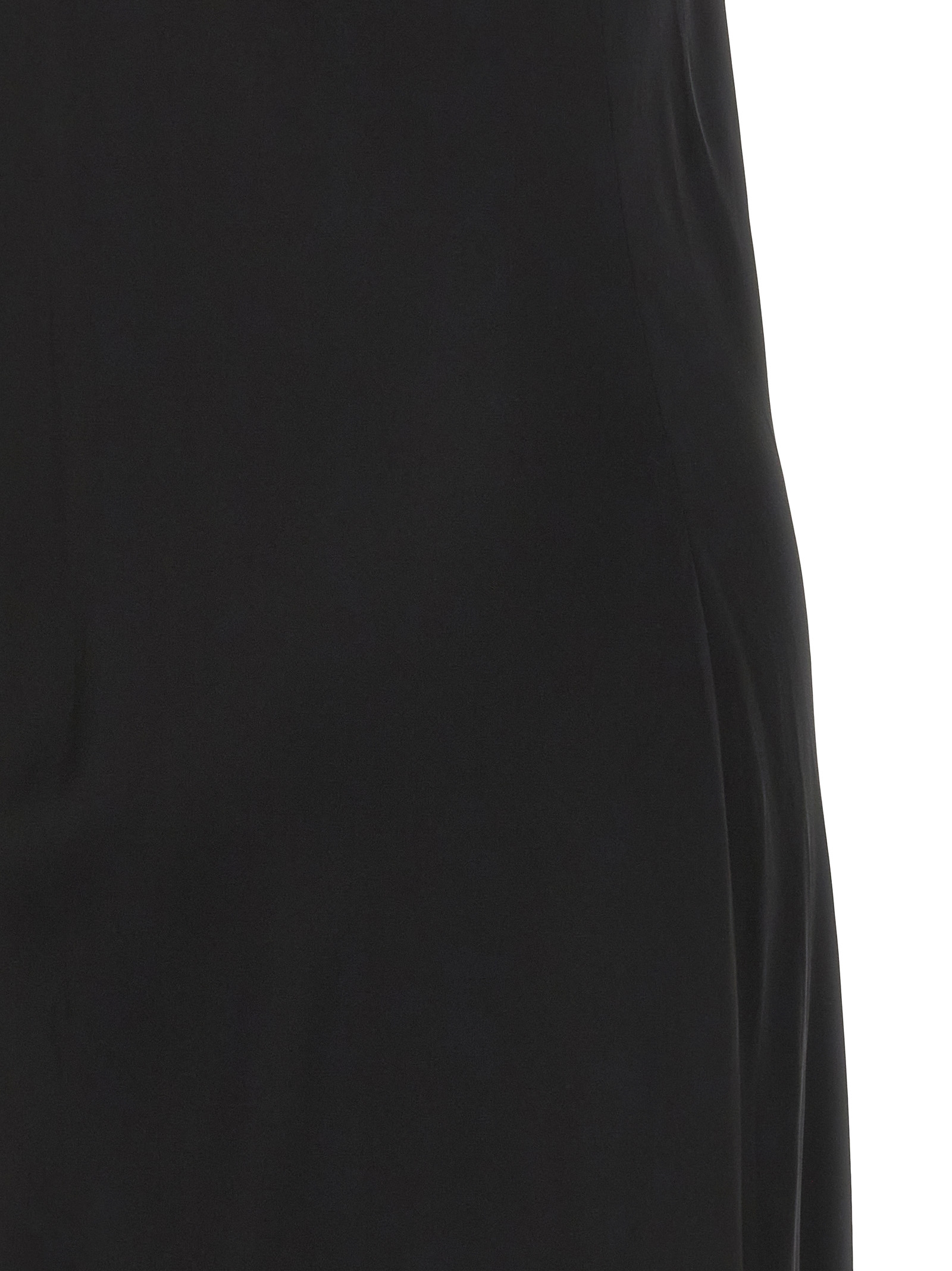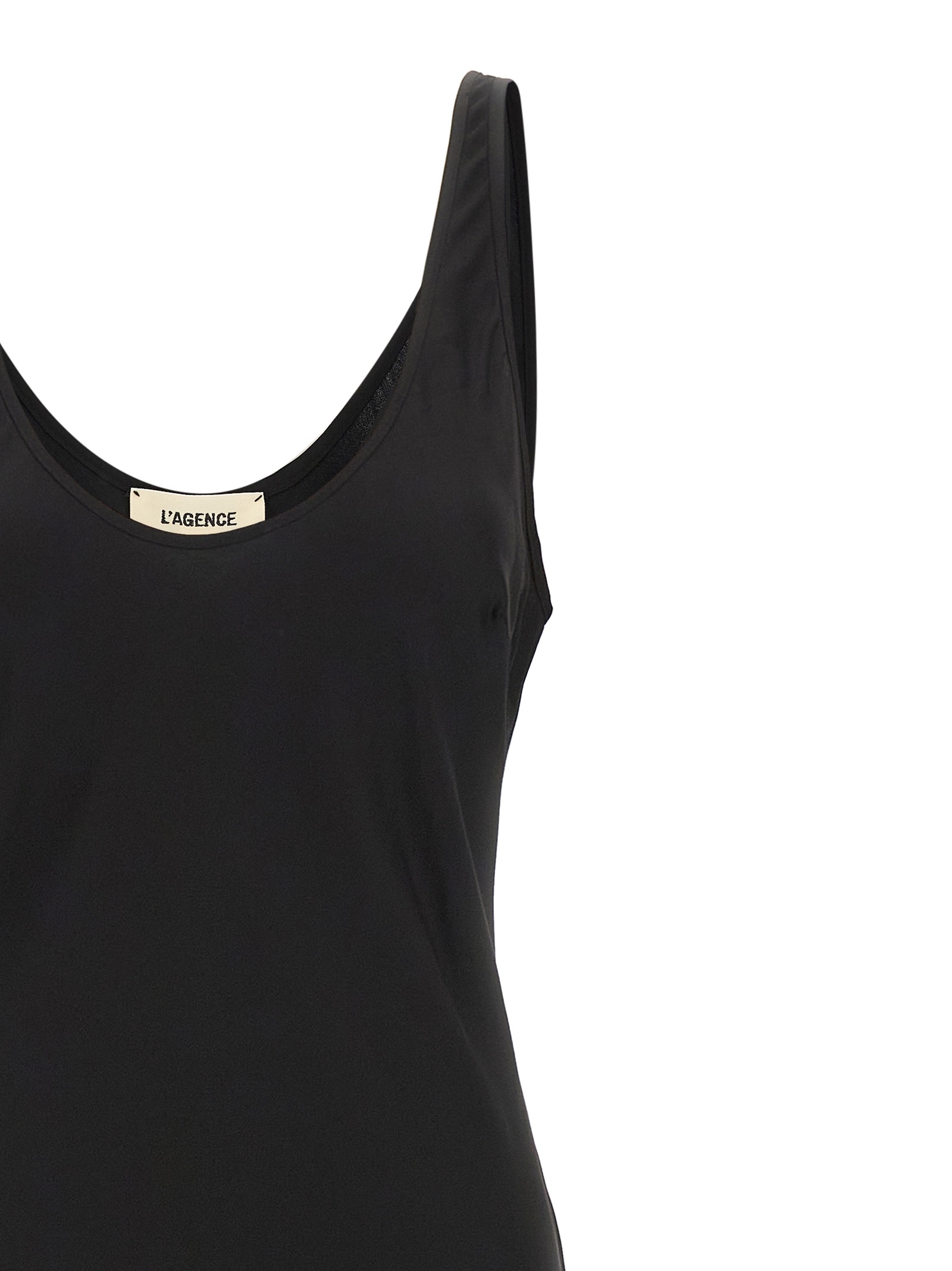 Long ‘Akiya’ satin dress with slightly flared silhouette, sleeveless, wide round neckline front and back.