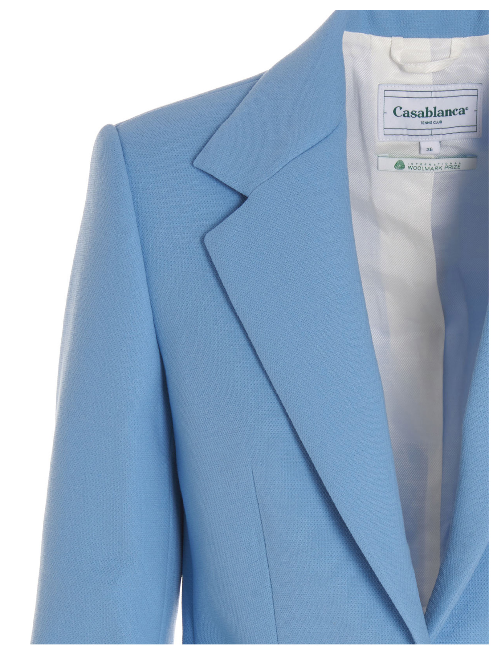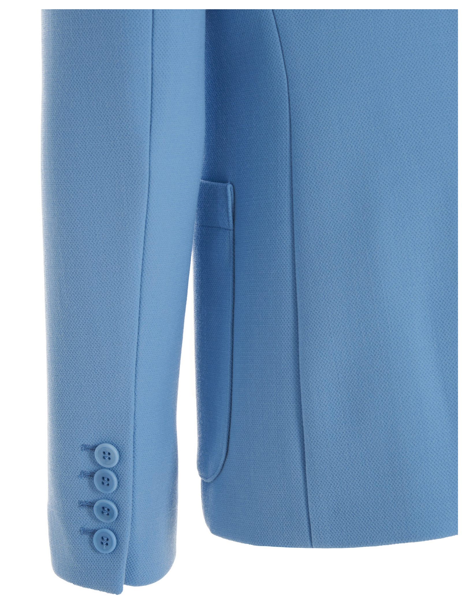 ‘Alaskan blue’ wool single breast blazer jacket with three pockets and three buttons.
