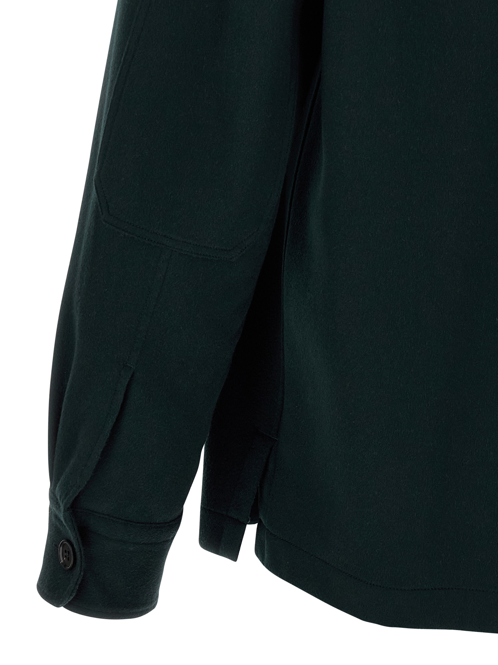 ‘Alba’ cashmere oasis shirt with front button closure, pockets, long cuffed sleeves, side slits, tone-on-tone leather ‘Zegna 232 Road Brand Mark’ patch on the back.