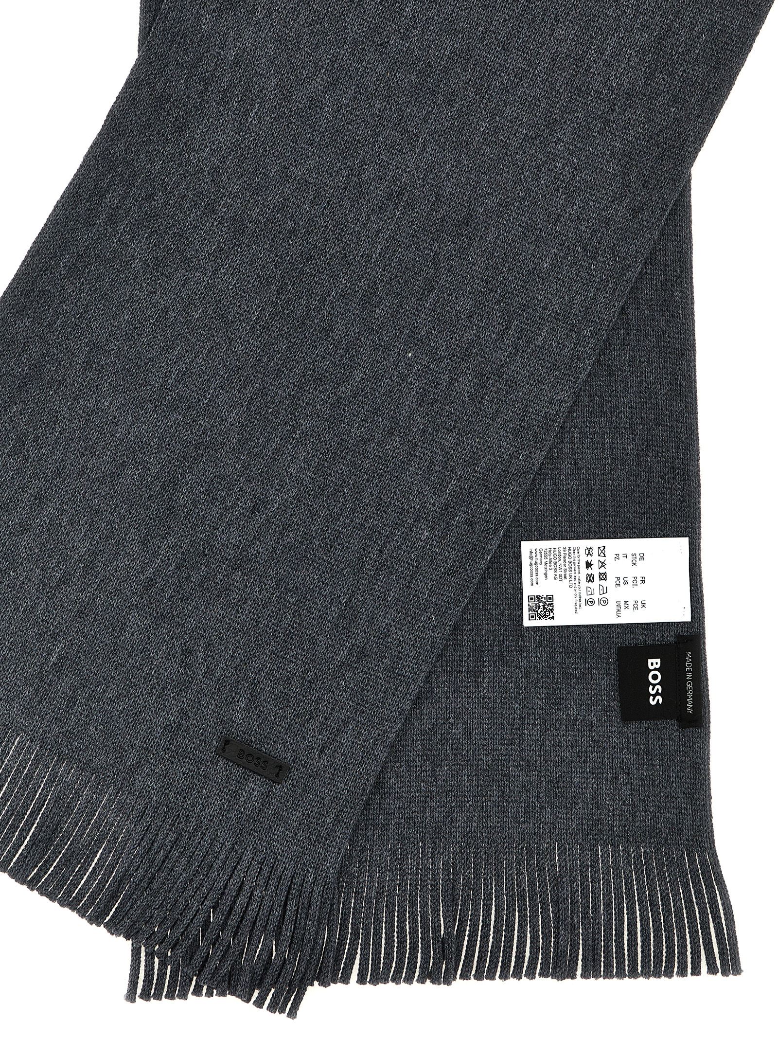 Virgin wool Albas scarf with Raschel pattern, leather logo patch, fringed edges.