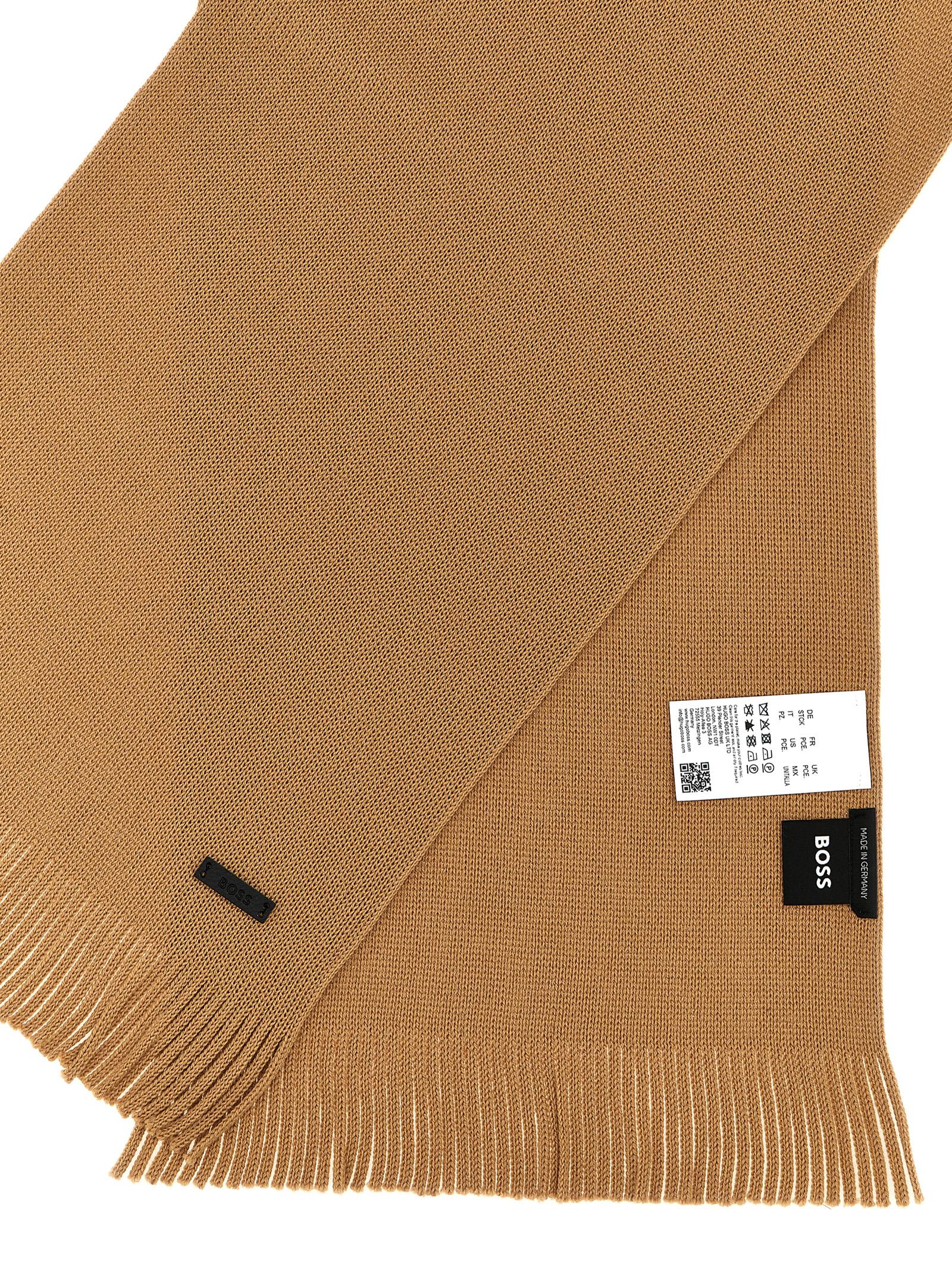 Virgin wool Albas scarf with Raschel pattern, leather logo patch, fringed edges.