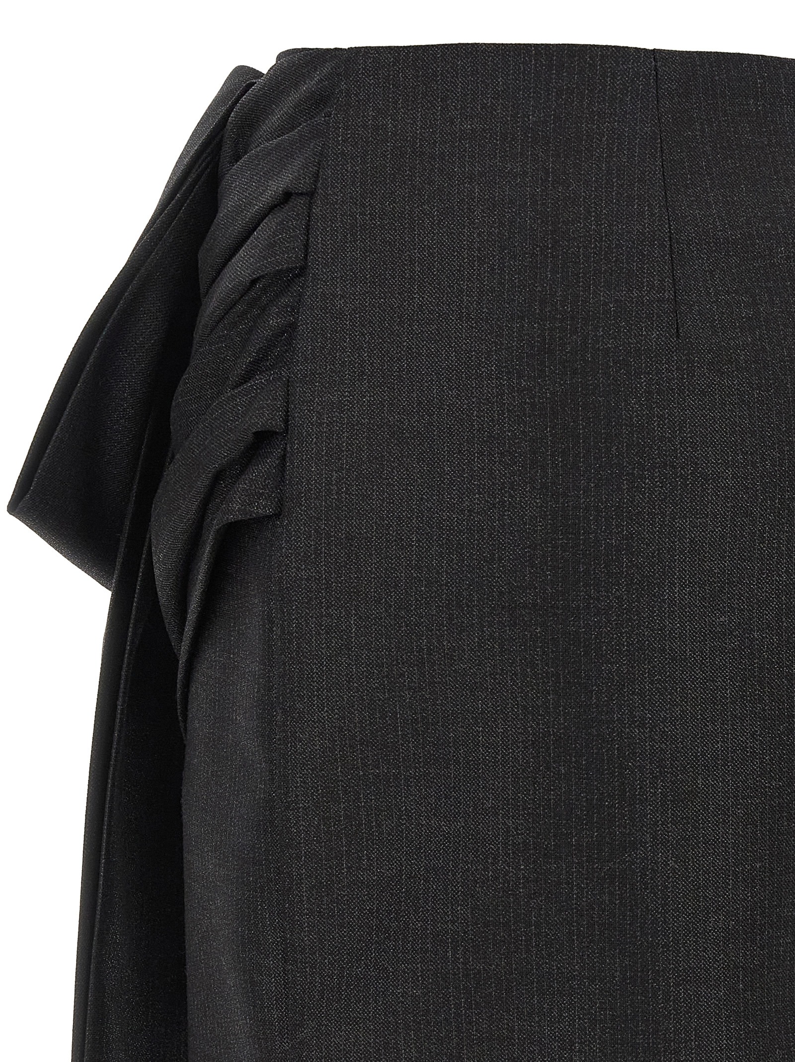 Mini ‘Alejandrina’ skirt in wool blend canvas worked with thin pinstriped metallic thread, draping and decorative band with front bow, back zip closure, lining.