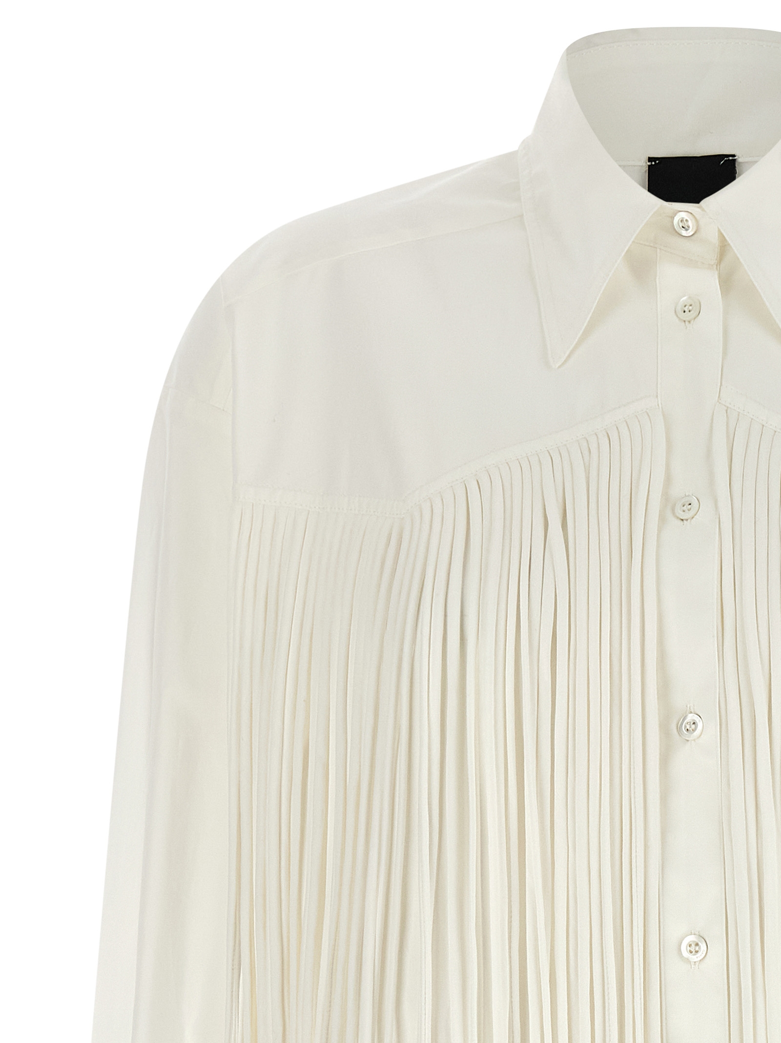 Mini ‘Alife’ dress in cotton poplin with long front tone-on-tone fringes, chemisier model, pointed collar, front mother-of-pearl button closure, long sleeves with cuffs and slightly dropped shoulder, back rack with cannon pleats, rounded hem.