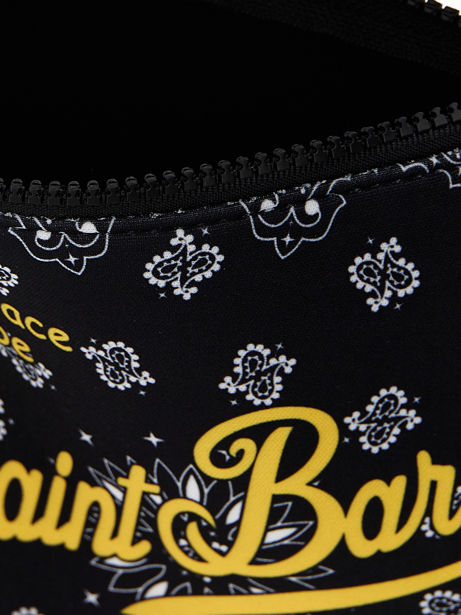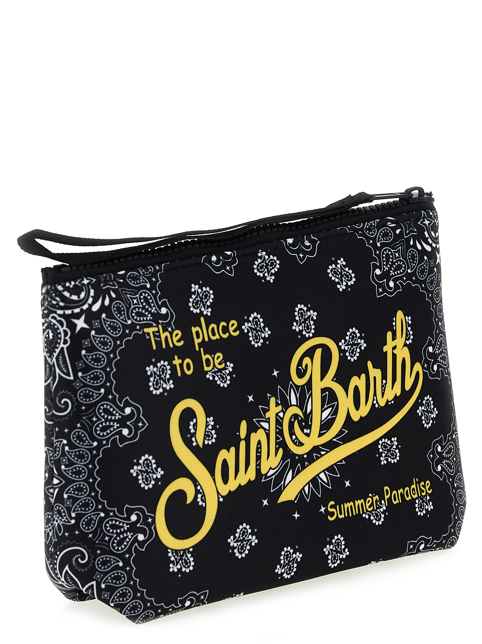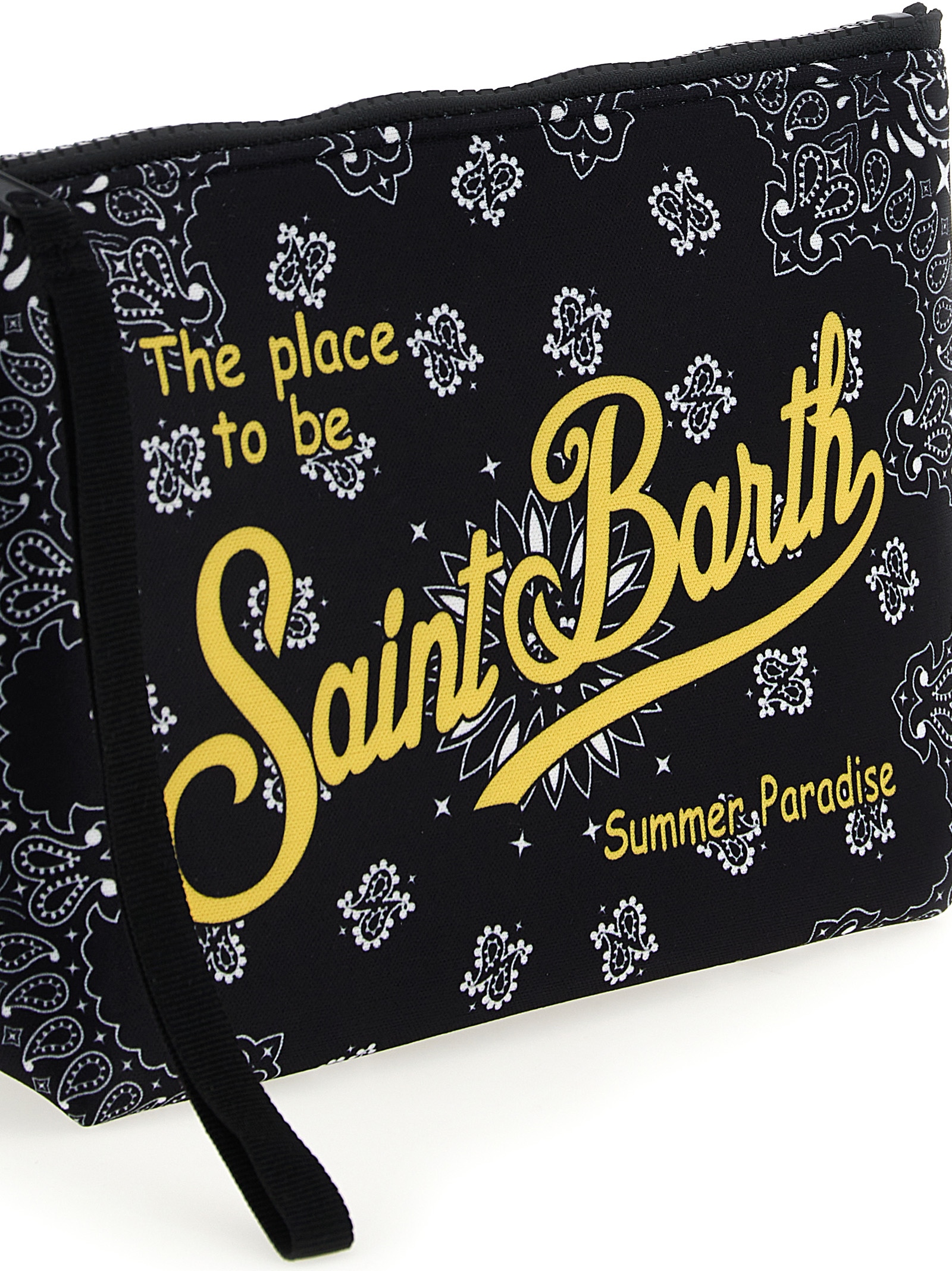 ‘Aline’ clutch bag in all-over bandana print scuba fabric, top zip closure, wrist handle.