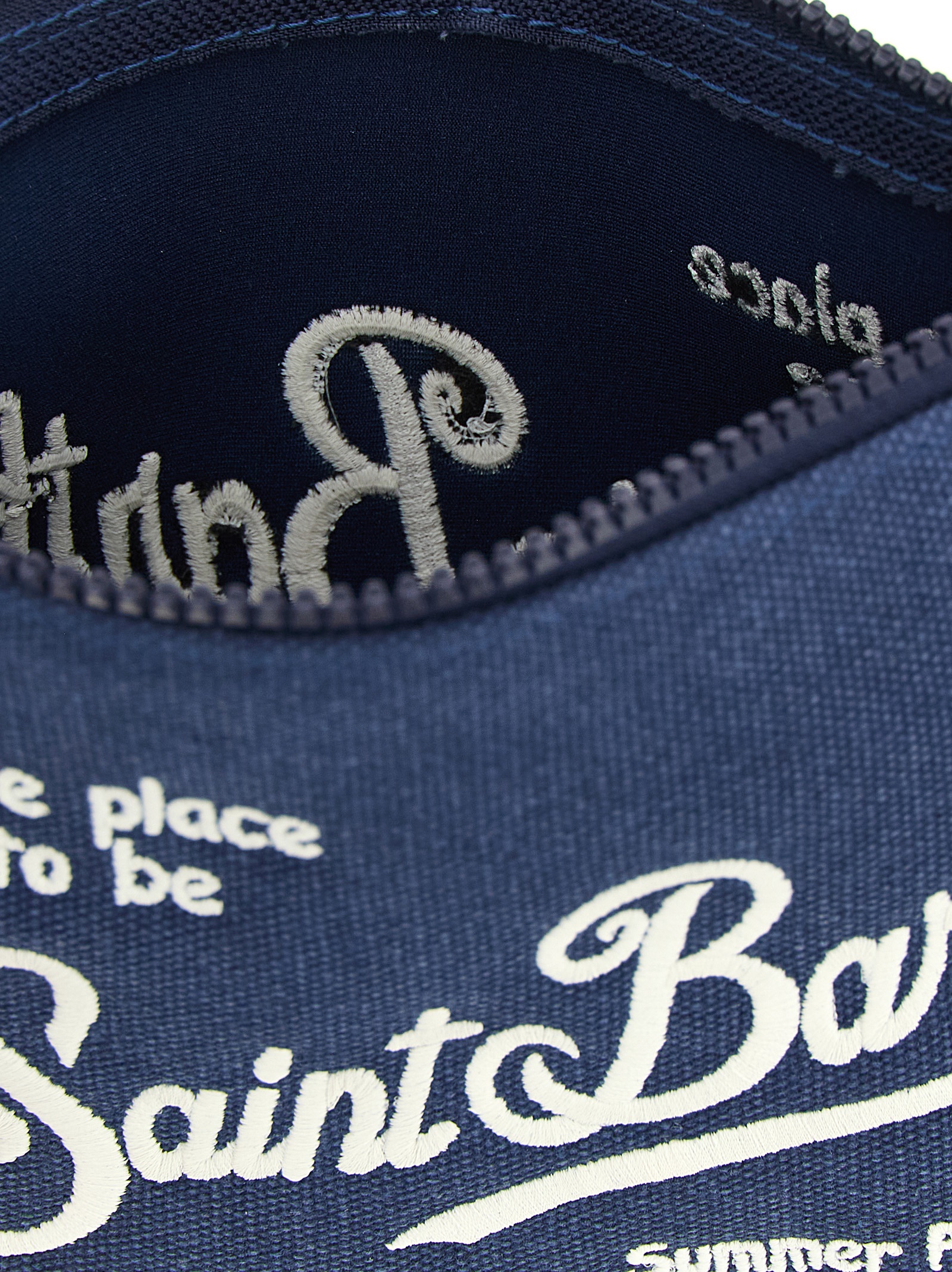 ‘Aline’ canvas clutch bag with contrast logo embroidery on the front and back, top zip closure with long tie rod.