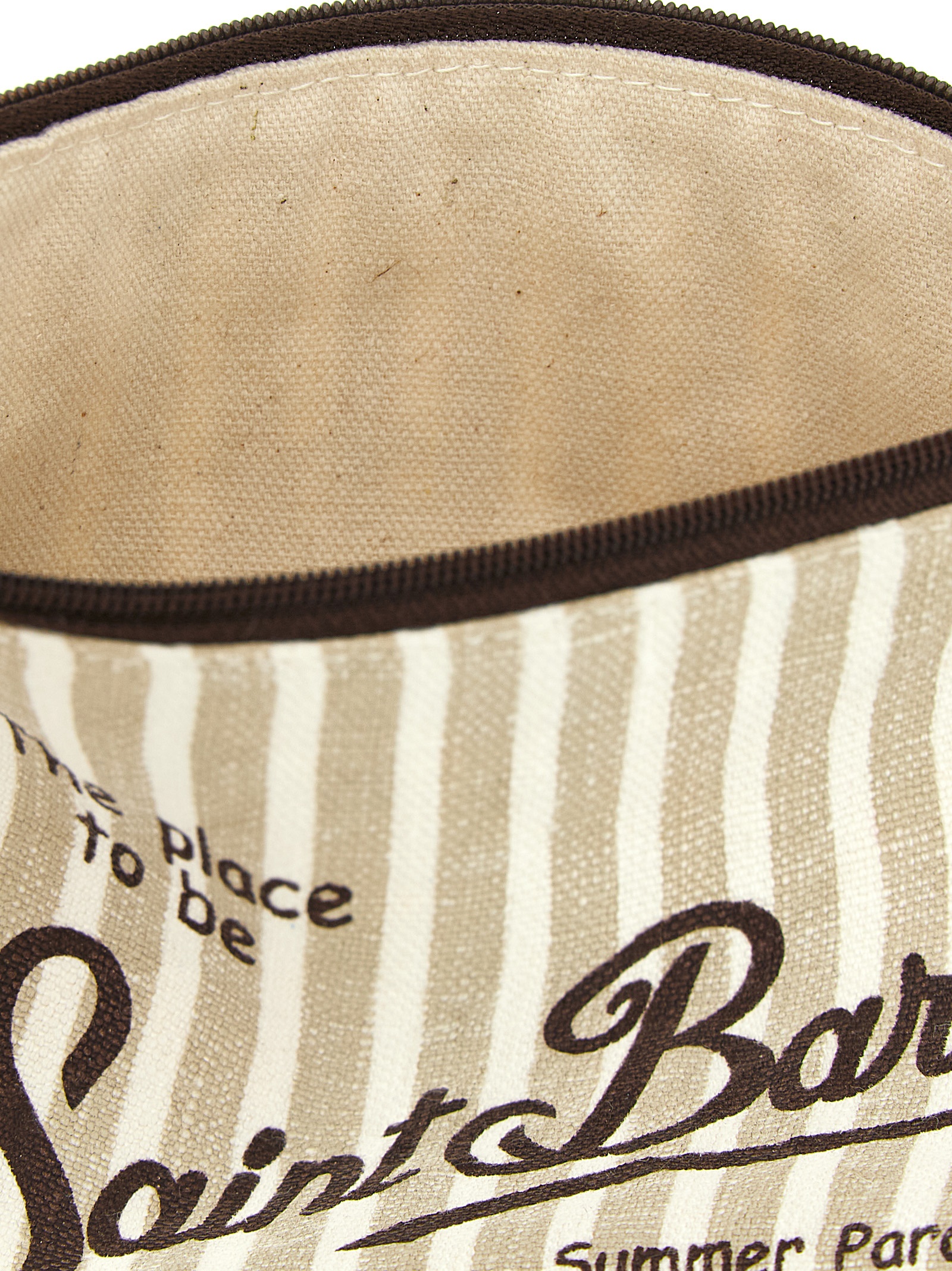 ‘Aline’ striped linen clutch bag with contrast logo embroidery on the front and back, top zip closure with long tie rod.