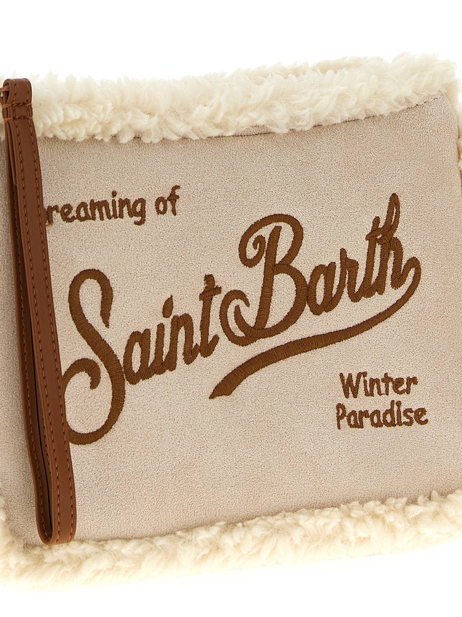 Aline Shearling’ suede-effect fabric clutch bag with shearling-effect fabric inserts, contrast logo embroidery on the front and back, top zip closure with long tie rod.